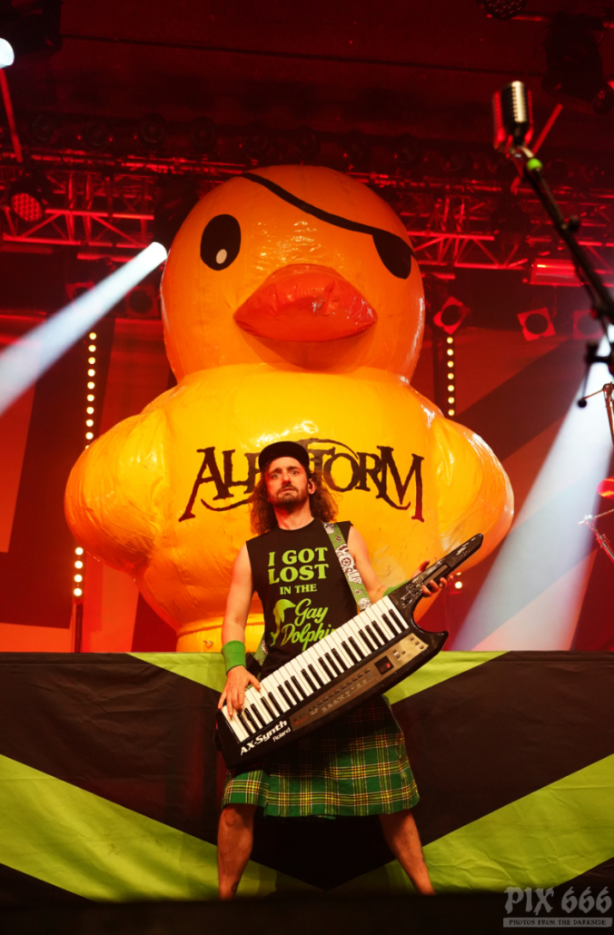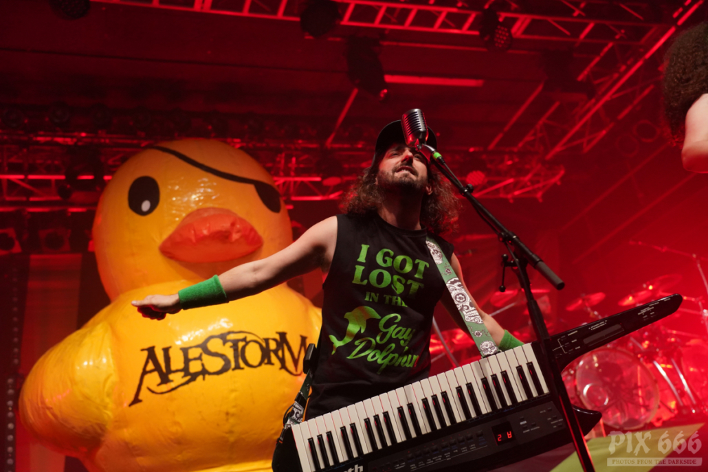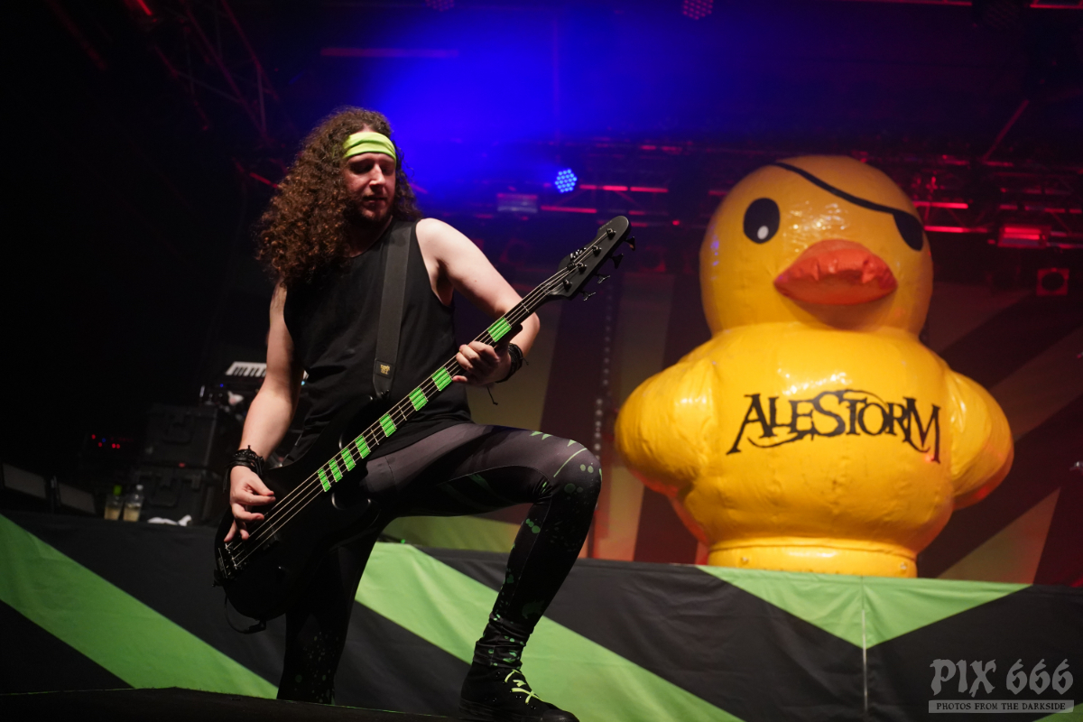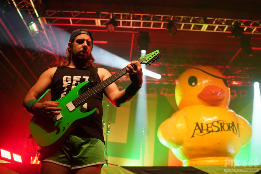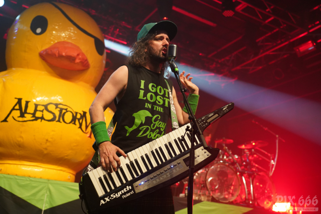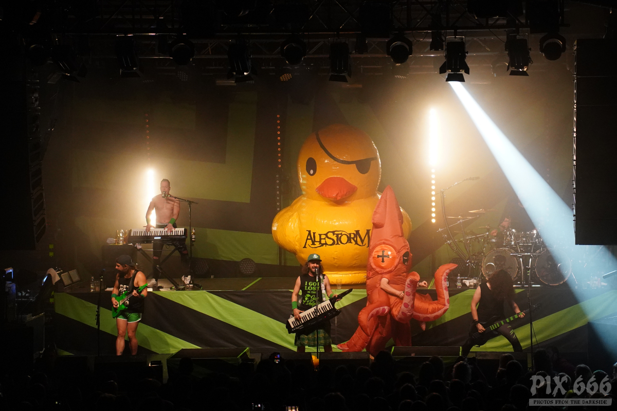 Alestorm betraten unter großem Jubel die Bühne und legten ohne zu Zögern gleich richtig los. Das war wirklich eine wilde Party vom ersten Song an. Unzählige Crowdsurfer schwebten über die Köpfe der anderen Fans hinweg Richtung Bühne. Im Publikum gab es dann auch eine ‚kleine Schwester‘ der Alestorm-Ente. Der Kinderschwimmreifen wanderte dann auf der Bühne und diente kurzzeitig als Kopfschmuck der Musiker – jeder durfe mal…