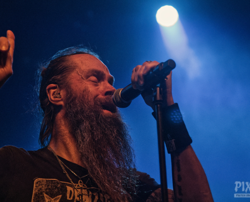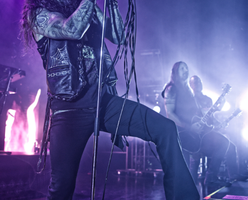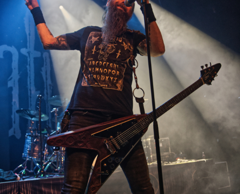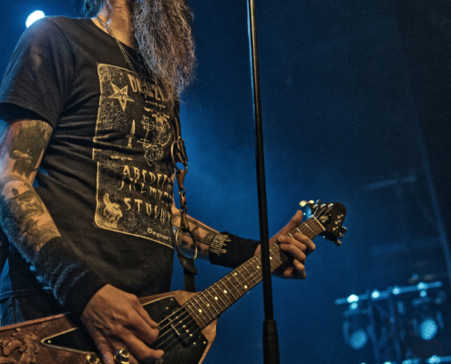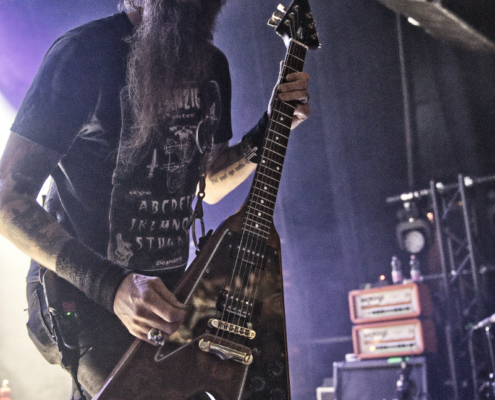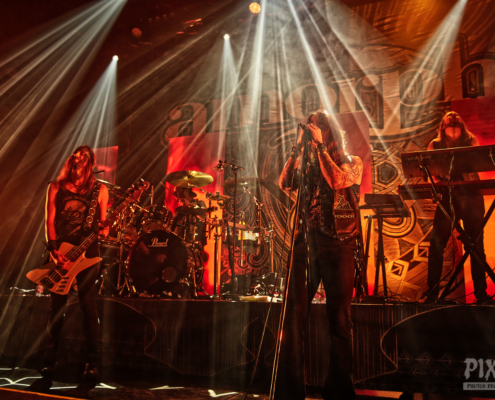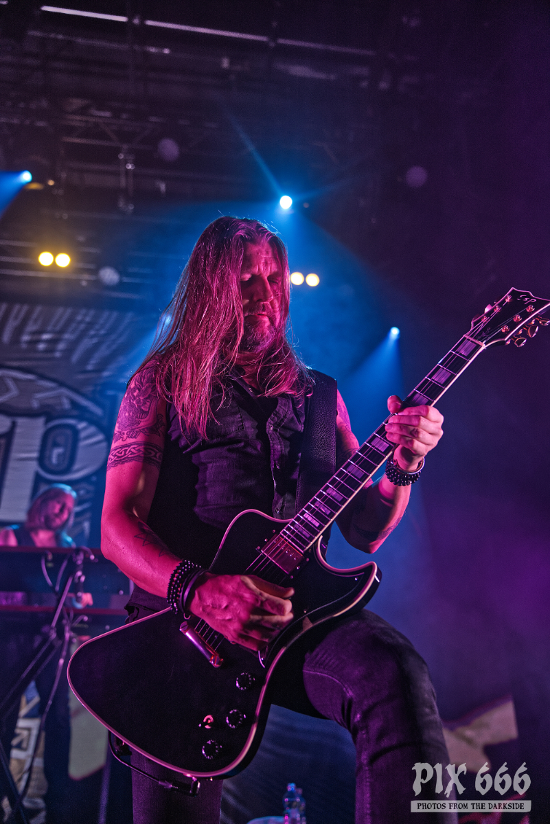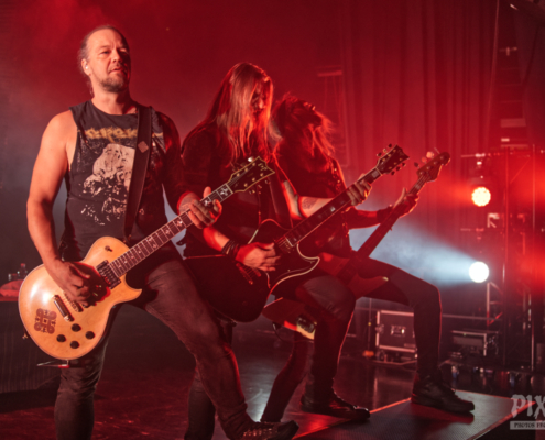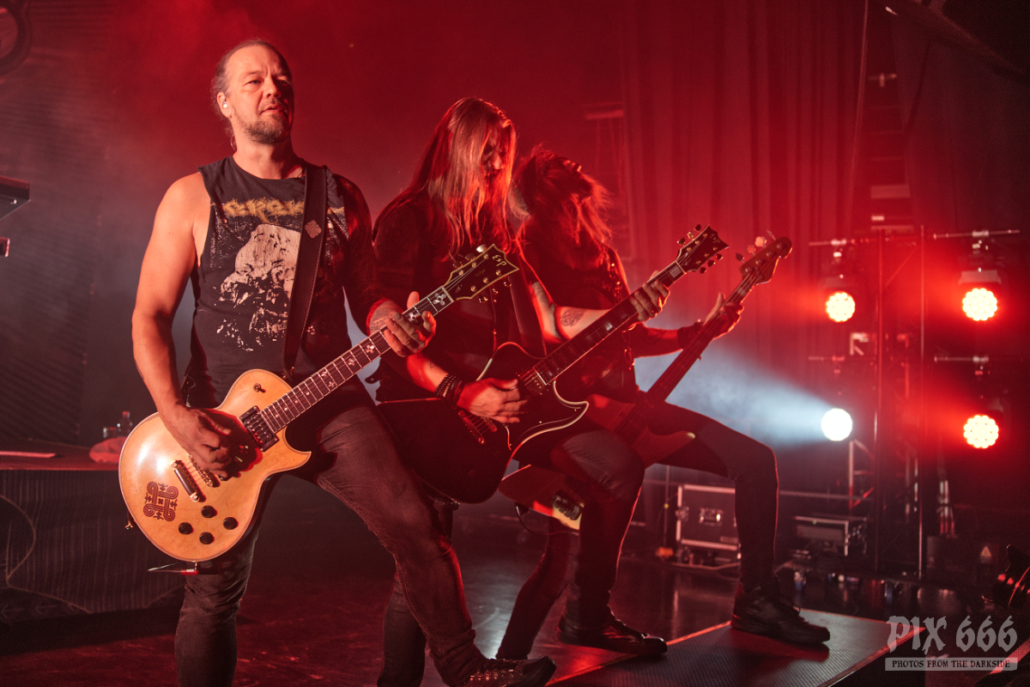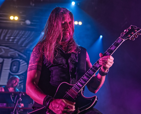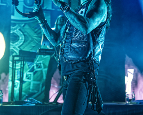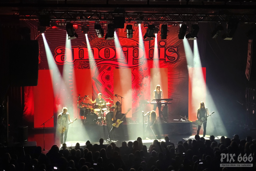 Nun folgte ein weiterer wahnsinnig toller Song. ‚Amongst Stars‘ wurde vor ein paar Wochen als Single vom Livealbum ‚Queen Of Time (Live at Tavastia 2021)‘ veröffentlicht. Das Duett mit der wunderbaren Anneke Van Giersbergen, deren Stimme bei den Liveshows natürlich nur eingespielt wird, sorgten gleich für den nächsten ‚wow-Moment‘. Es herrschte eine ununterbrochene mega Stimmung und leider verging die Zeit rasend schnell. Nun hatte Tomi auch ein paar Worte für die Fans übrig, die es sich auf den vorhin schon erwähnten Sitzplätzen bequem gemacht hatten, die fast schon an Kinosessel erinnerten. „Na ihr faulen Ärsche, die ihr dort hinten sitzt“ grüßte er mit einem Lächeln die Fans im hinteren Hallendrittel. Aber irgendwie passten diese Kinosessel auch perfekt zum Abend, denn was Amorphis hier ablieferten, war ganz großes Metal-Kino.