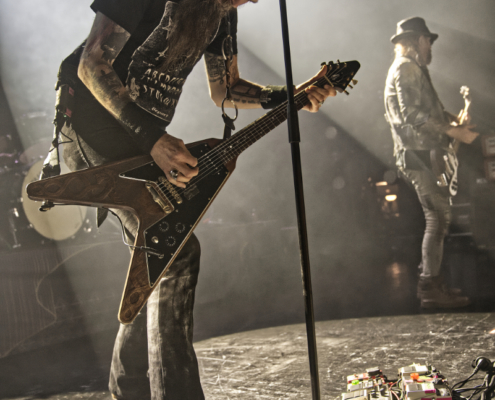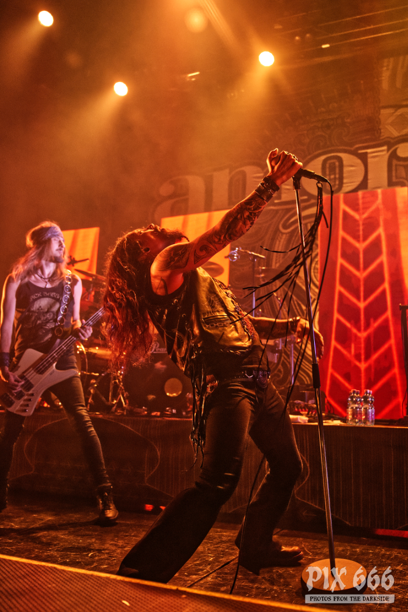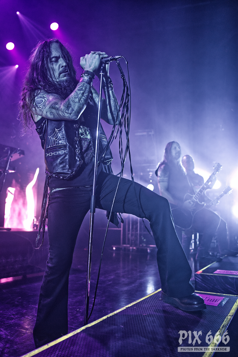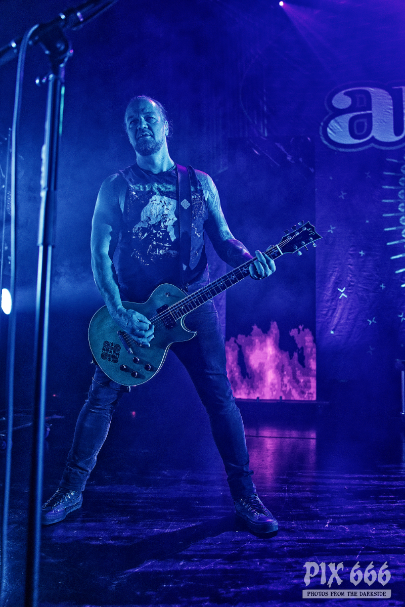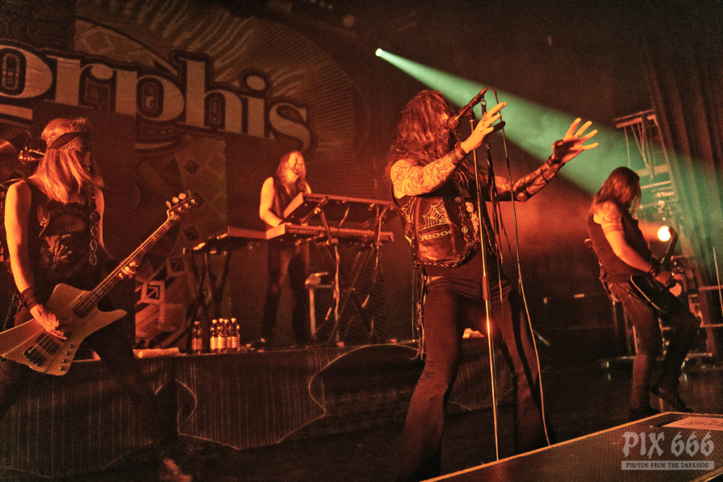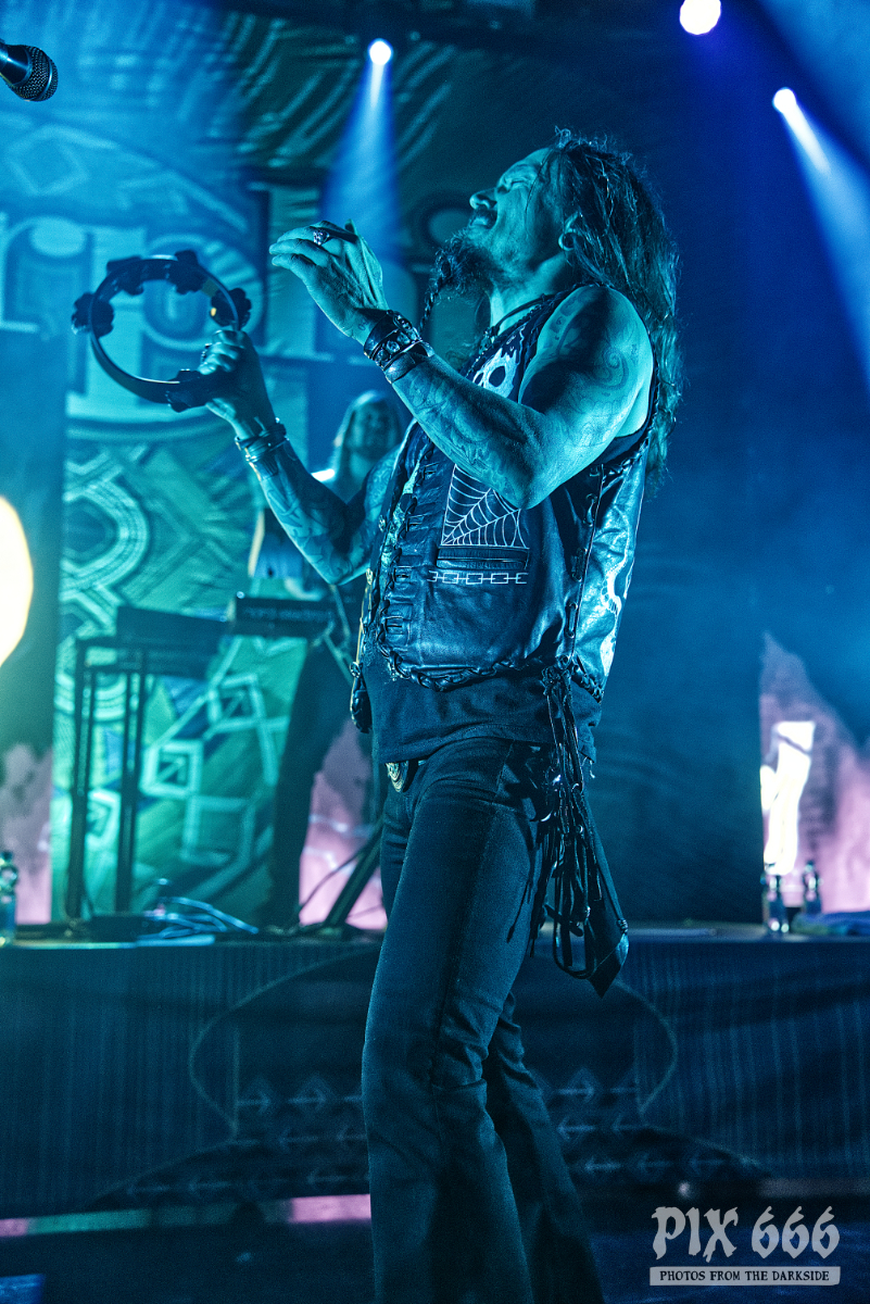 Nun folgte ein weiterer wahnsinnig toller Song. ‚Amongst Stars‘ wurde vor ein paar Wochen als Single vom Livealbum ‚Queen Of Time (Live at Tavastia 2021)‘ veröffentlicht. Das Duett mit der wunderbaren Anneke Van Giersbergen, deren Stimme bei den Liveshows natürlich nur eingespielt wird, sorgten gleich für den nächsten ‚wow-Moment‘. Es herrschte eine ununterbrochene mega Stimmung und leider verging die Zeit rasend schnell. Nun hatte Tomi auch ein paar Worte für die Fans übrig, die es sich auf den vorhin schon erwähnten Sitzplätzen bequem gemacht hatten, die fast schon an Kinosessel erinnerten. „Na ihr faulen Ärsche, die ihr dort hinten sitzt“ grüßte er mit einem Lächeln die Fans im hinteren Hallendrittel. Aber irgendwie passten diese Kinosessel auch perfekt zum Abend, denn was Amorphis hier ablieferten, war ganz großes Metal-Kino.