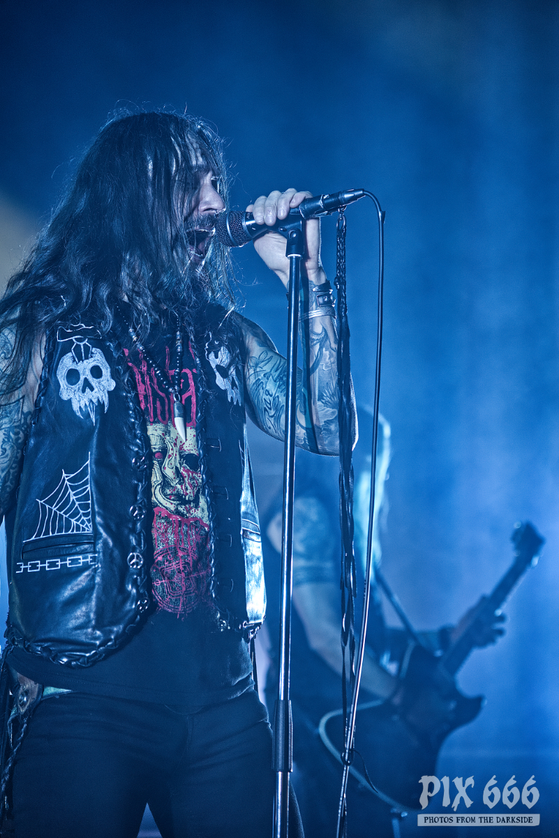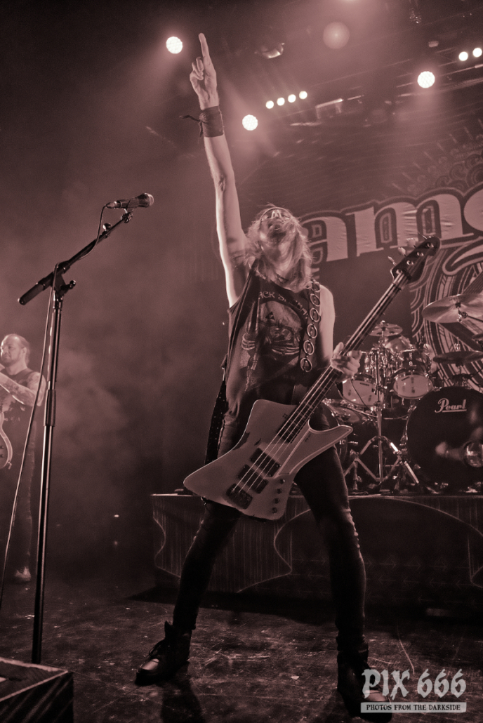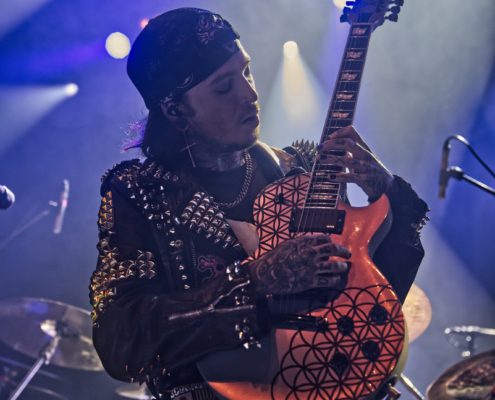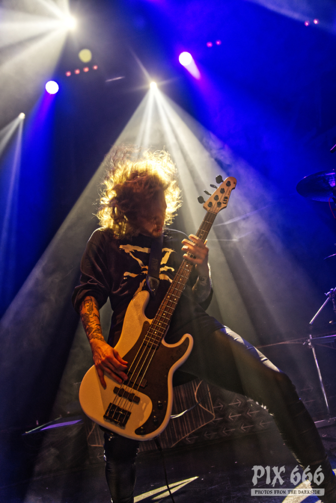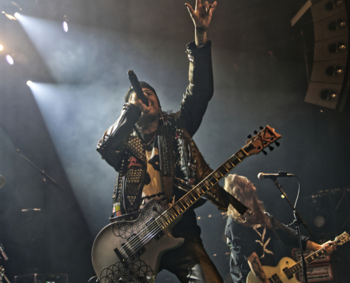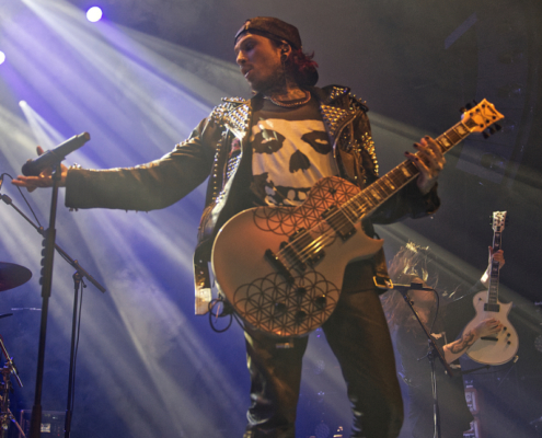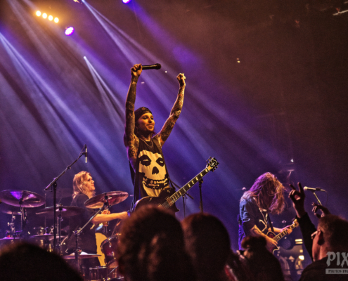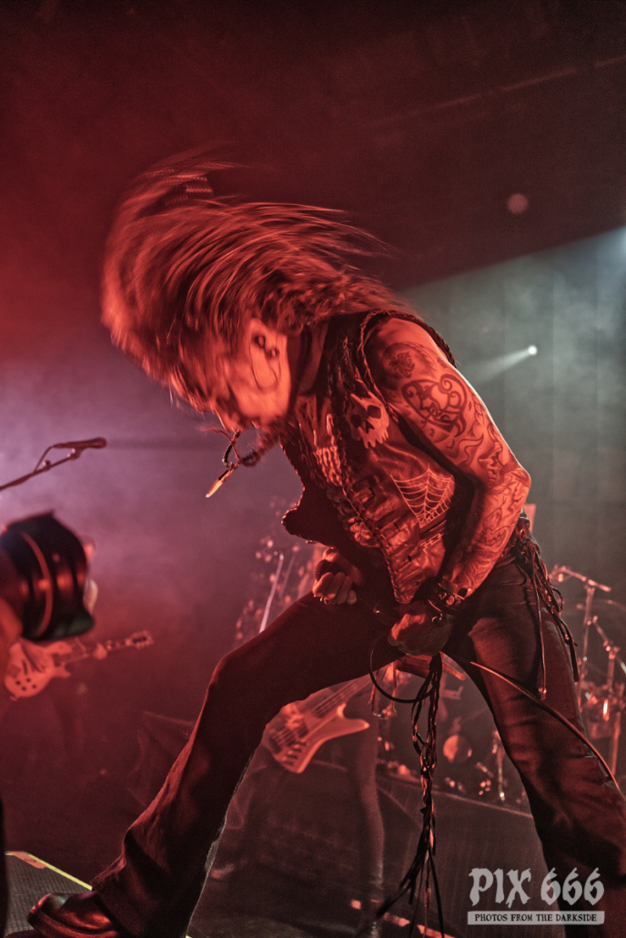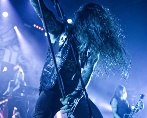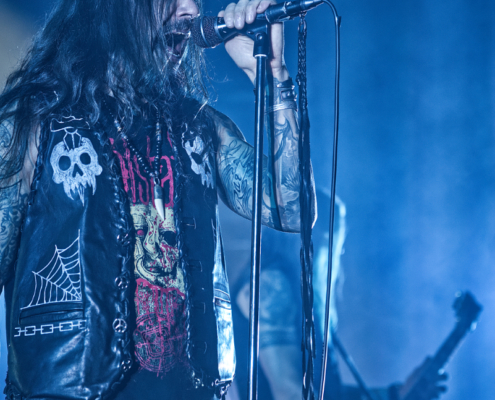Dem charismatischen Sänger war auf jeden Fall inzwischen auch warm geworden, die Jacke musste weichen und weiter ging es in einem Misfits Shirt. „Wir haben noch ein paar Songs, wollt ihr die hören.“ Die temporeiche, schweißtreibende Show hatte dann auch eine Passage zum Ausruhen – die mitreißende Metalballade ‚Into Eternity‘ hatte es in sich. Leider wurde Samy’s Wunsch, dafür die an der Decke hängende Discokugel anzustrahlen, nicht erhört. Nun musste auch noch das Shirt weichen und es wurde der voll tatöwierte Oberkörper zur Schau gestellt. Bei ‚No Absolution‘ wurde dann nochmal mitgesungen, die Fans in Linz hatten echt Gefallen an der Musik von Lost Society gefunden. „Ich bin noch nicht fertig – eins hab‘ ich noch“ sagte der Mann mit den silbernen Glitzerschuhen, der sich nun von der Bühne wagte und ‚Stitches‘ gemeinsam mit den Fans am Geländer zelebrierte.