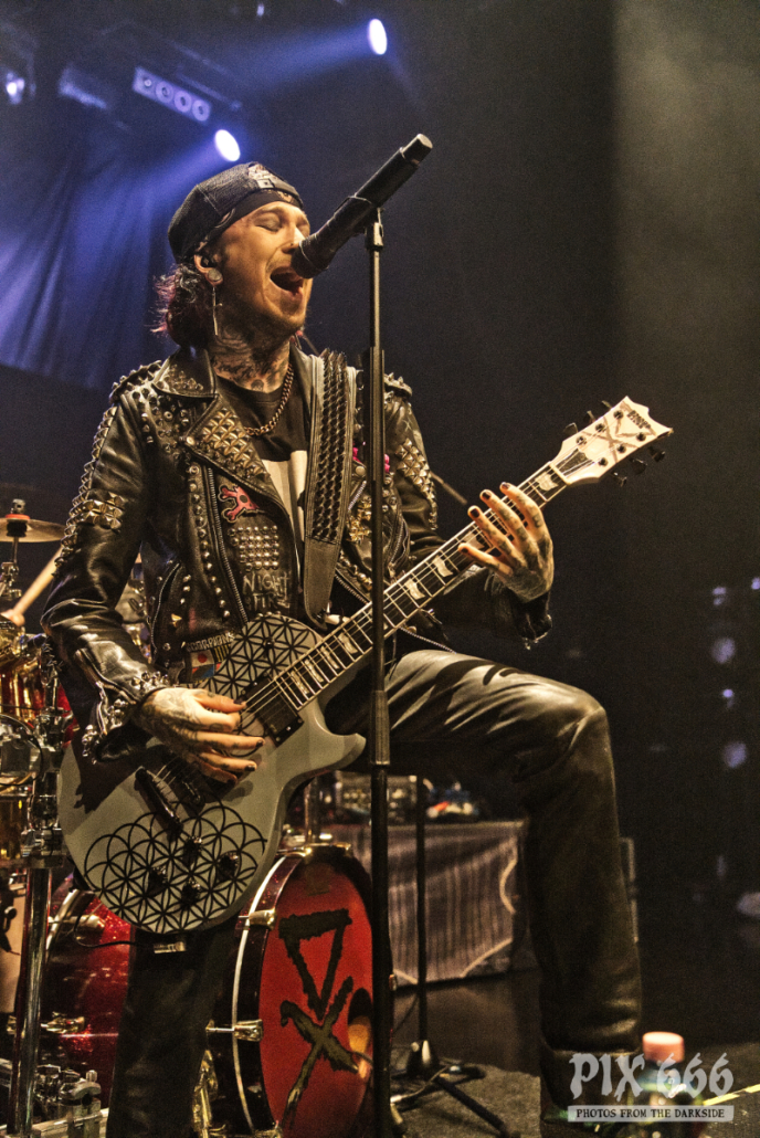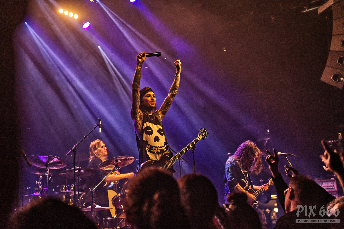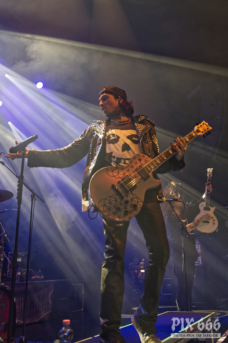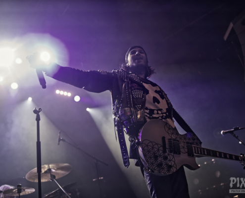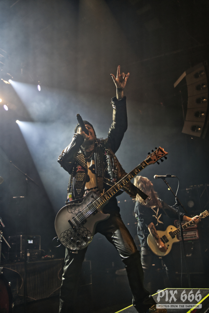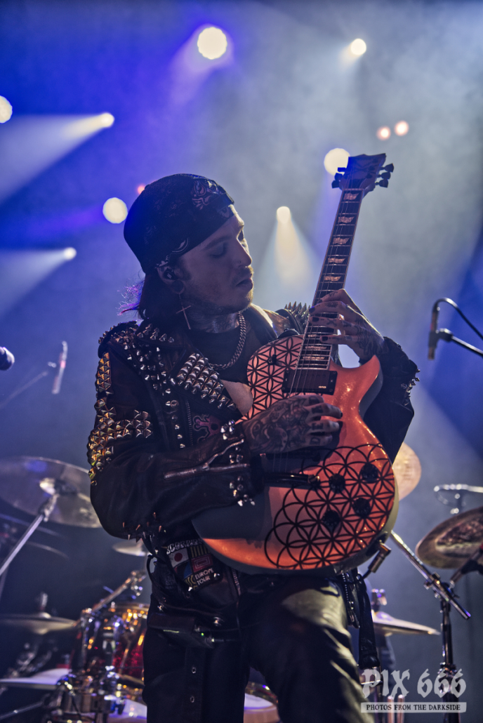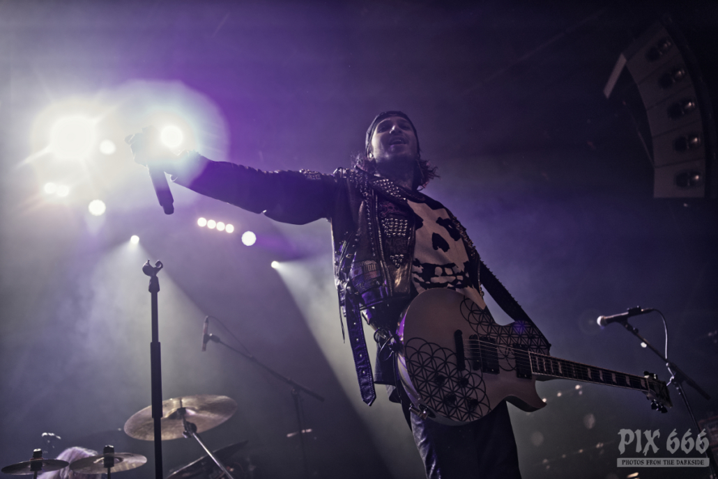Dem charismatischen Sänger war auf jeden Fall inzwischen auch warm geworden, die Jacke musste weichen und weiter ging es in einem Misfits Shirt. „Wir haben noch ein paar Songs, wollt ihr die hören.“ Die temporeiche, schweißtreibende Show hatte dann auch eine Passage zum Ausruhen – die mitreißende Metalballade ‚Into Eternity‘ hatte es in sich. Leider wurde Samy’s Wunsch, dafür die an der Decke hängende Discokugel anzustrahlen, nicht erhört. Nun musste auch noch das Shirt weichen und es wurde der voll tatöwierte Oberkörper zur Schau gestellt. Bei ‚No Absolution‘ wurde dann nochmal mitgesungen, die Fans in Linz hatten echt Gefallen an der Musik von Lost Society gefunden. „Ich bin noch nicht fertig – eins hab‘ ich noch“ sagte der Mann mit den silbernen Glitzerschuhen, der sich nun von der Bühne wagte und ‚Stitches‘ gemeinsam mit den Fans am Geländer zelebrierte.