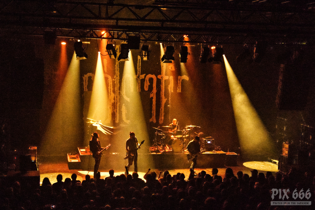 Die Musiker standen des Öfteren in gelben oder weißen Lichtkegeln oder verschwanden auch Mal kurz ganz in der Finsterheit, um ihre epischen Songs zu zelebrieren. Die hypnotischen Instrumentalparts hatten es in der Tat in sich. Vor dem letzten Song meldete sich dann Aðalbjörn zu Wort: „Guten Abend, wie geht es euch? – danke, dass ihr hier bei uns seid – wir haben noch einen Song und dabei brauche ich eure Hilfe. Wenn ich ‚1, 2,3,4‘ singe, schreit ihr laut“. Während des Klassikers ‚Goddess of the Ages‚ aus dem Jahr 2009 balancierte Aðalbjörn gekonnt auf dem Geländer und schüttelte die Hände der Fans in der ersten Reihe. Für die atemberaubende 60-minütige Sólstafir Show, die musikalisch nicht jedermanns Sache sein mag, gab es auf jeden Fall frenetischen Beifall.