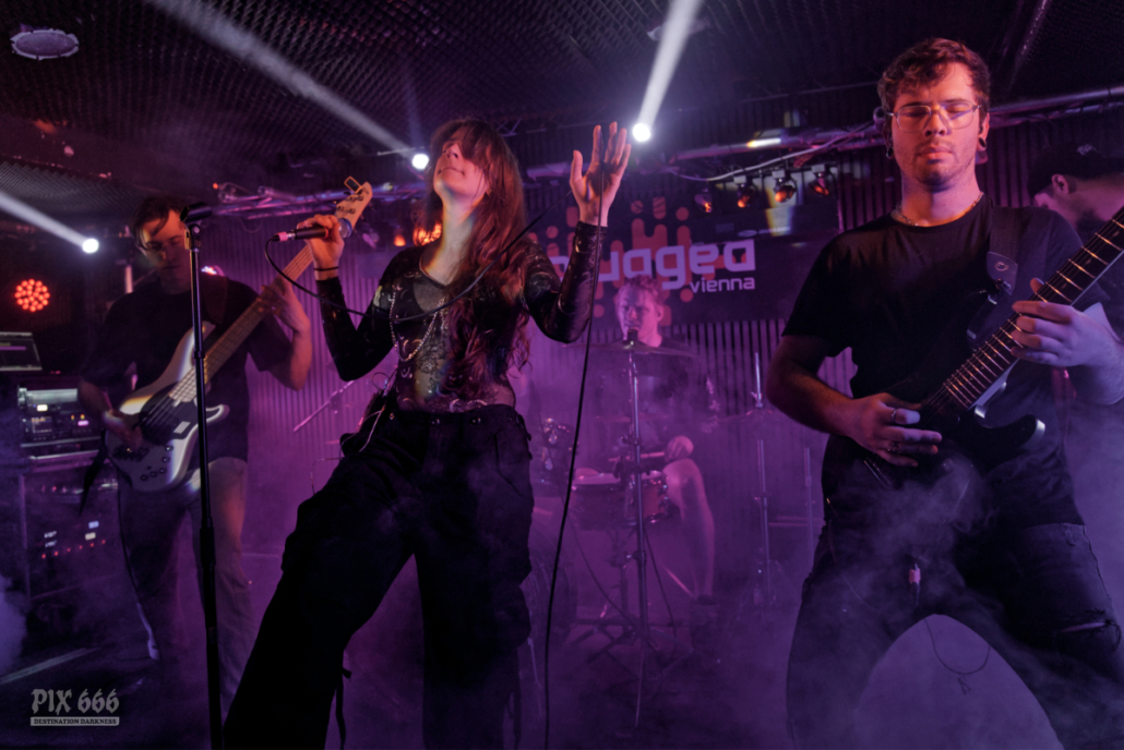 Einen besonderen Moment gab es beim Song ‚Horizon‘. Sängerin Pipi Gogerl kündigte an, dass sie „eigentlich keine Balladen mag“, aber „irgendwie gehört sowas ja auf jedes Rockalbum“. Das Ergebnis war eine kleine Verschnaufpause im Set, die aber beim Publikum spürbar gut ankam. Mit ‚Siblings‘ und ‚Elements‘ verließen Ancient Fragments dann für ein paar Minuten das aktuelle Album und es ging zurück zu den Wurzeln der Band. Die beiden Songs aus der 2022er EP ‚From a Distance‘ passten sich aber live nahtlos in das Set ein. Die Zeit verging irgendwie richtig schnell und schon kündigte die Frontfrau den letzten Song an. Nach dem starken letzten Song ‚Dream‘ bedankten sich die Fans mit lautstarkem Jubel für den tollen Abend. „Ihr seid so süß“, sagte die Band sichtlich bewegt, bevor sie den Abend mit einem Erinnerungsfoto mit den Fans abschlossen. Bis kurz vor 23 Uhr lieferten Ancient Fragments eine mitreißende Show, die von Energie, Nähe zum Publikum und einer starken Setlist geprägt war. Ein Auftritt, der eindrucksvoll zeigte, warum die Band aktuell zu den spannendsten Acts im Modern Metal zählt und mit dem stimmlichen Potential von Sängerin Pipi mit Sicherheit demnächst noch mehr Aufmerksamkeit erhalten wird.