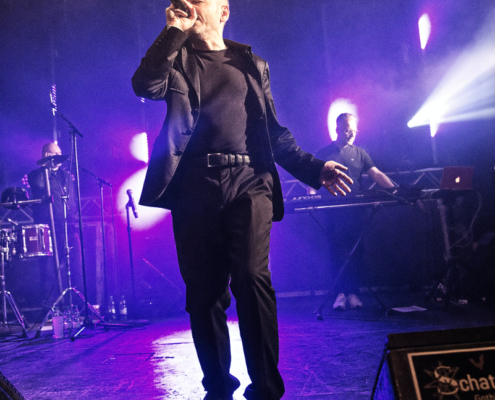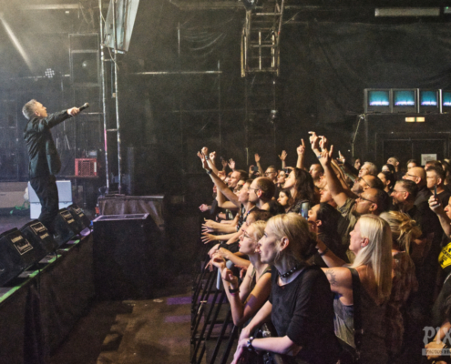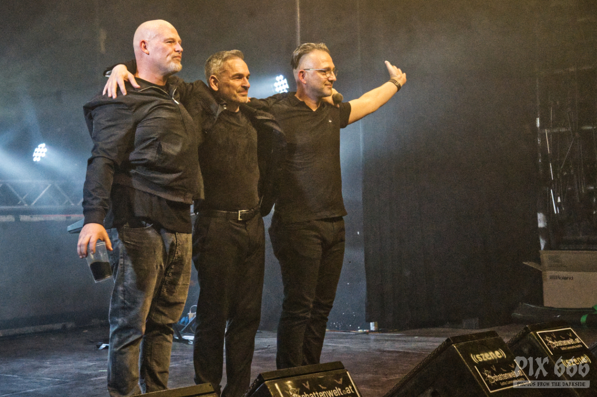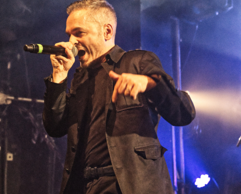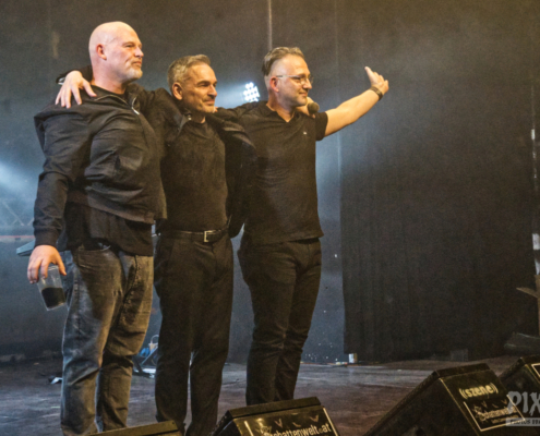 Dann gab es eine kleine Pause, während der die And One Fans ununterbrochen kreischten und schrien, bis ihre Idole zurück auf die Bühne kamen. „Der nächster Song ist sehr alt … eine Hymne.“ Jetzt kochte die ((Szene)) bei ‚Metalhammer‘ fast über. „Ich war 19 Jahre alt“ sagte Steve mitten im Song – und tatsächlich ist dieser Klassiker bereits fast 35 Jahre alt. Weiter ging die wilde Party und schon dröhnte der nächste Klassiker durch die Lautsprecher – ‚Panzermensch‘ vom 2000er Album ‚Virgin Superstar‘. Danach folgte ‚Military Fashion Show‘ – die Fans gaben nun nochmal Alles – auch Steve hatte noch genügend Energie und drehte unentwegt Pirouetten – man konnte denken, er hebt gleich ab wie ein Eiskunstläufer. Nach dem nächsten Song, Shouts Of Joy‘ war dann leider schon Schluss, ich glaube die Wiener hätten noch ein bisschen mehr vertragen. „Dankeschön, Freunde“ sagte Steve als Verabschiedung. Wien und And One – das hat voll gepasst – eine tolle Veranstaltung der Schattenwelt Community. Ein herzliches Dankeschön dafür.