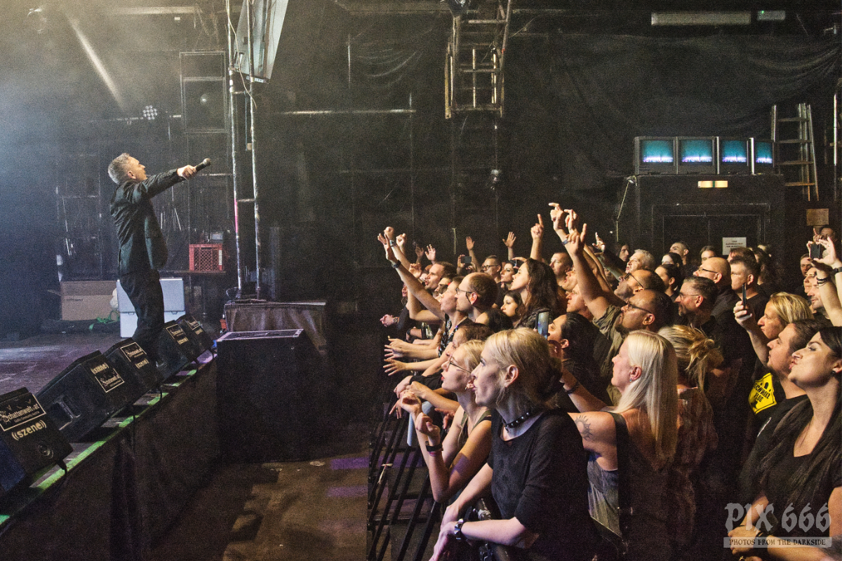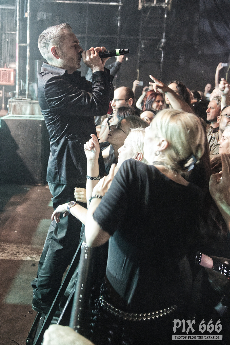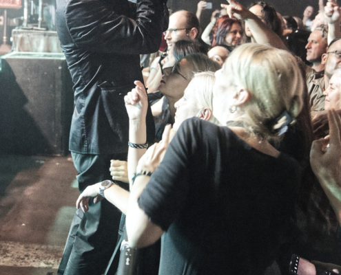 Beim wunderschönen ‚Killing the Mercy‘ wurde es dann etwas ruhiger – ein Song zum Genießen und mit fast 9 Millionen Views auf YouTube auch einer der beliebtesten Videoclips der Berliner Synthpop Helden. Die Stimmung war nun wirklich atemberaubend und Steve verneigte sich vor den Wienern und zog quasi den nicht vorhandenen Hut. And One hatten heute sogar eine Live Weltpremiere dabei. Nach ‚Immer Weiter‘ sagte Steve dann „es waren ein paar kleine Patzer drin, das merkt doch aber eh keiner – außer später bei YouTube vielleicht.“ Danach gab es ein Duett – Steve und Joke sangen gemeinsamen ‚Männermusik‘ – und dabei ging es runter von der Bühne, direkt zu den Fans in der ersten Reihe. Beim nächsten Song ‚U-Boot Krieg In Ost-Berlin‘ war Steve schon wieder von der Bühne verschwunden, dieses mal ging es aber über die erste Reihe hinaus, direkt in die Menge – „Wien, fasst mich an“ sagte der Sänger, der nun erstmal eine Runde mit dem Publikum abfeierte. Das Partylevel blieb weiter am Anschlag, denn es folgte einer der großen Klassiker – ‚Technoman‘.