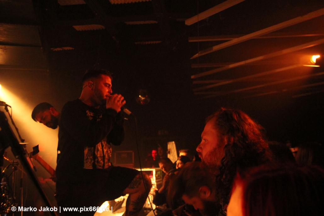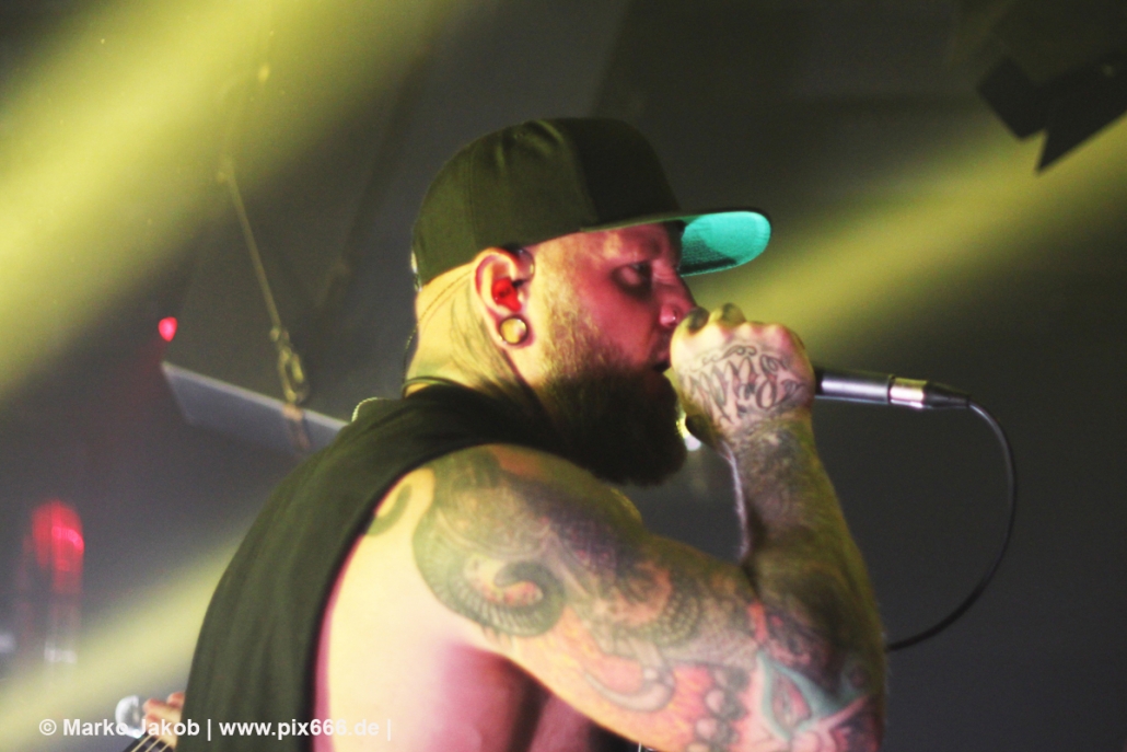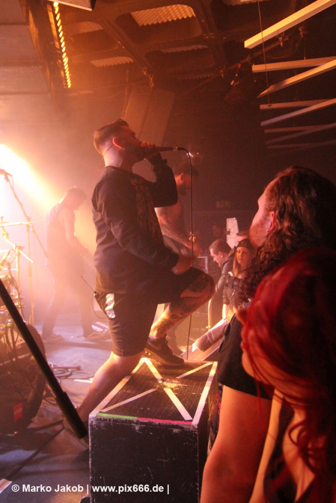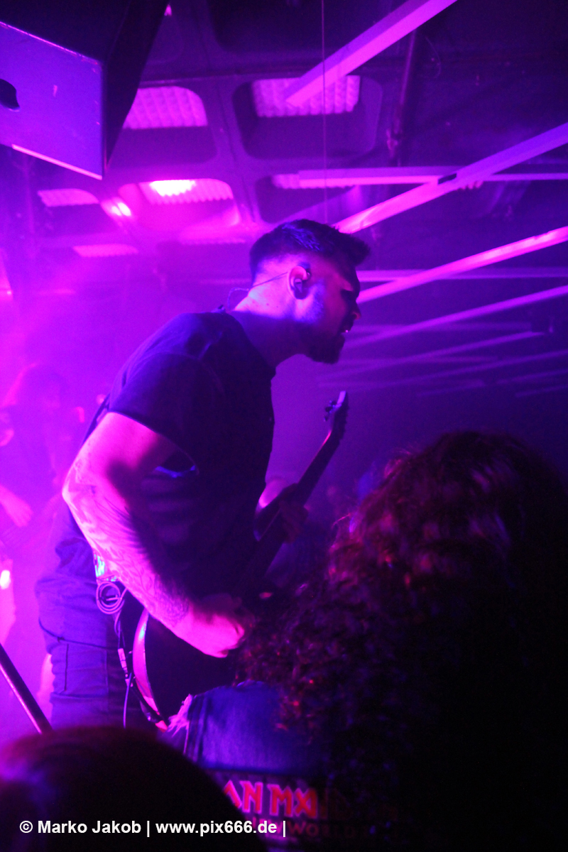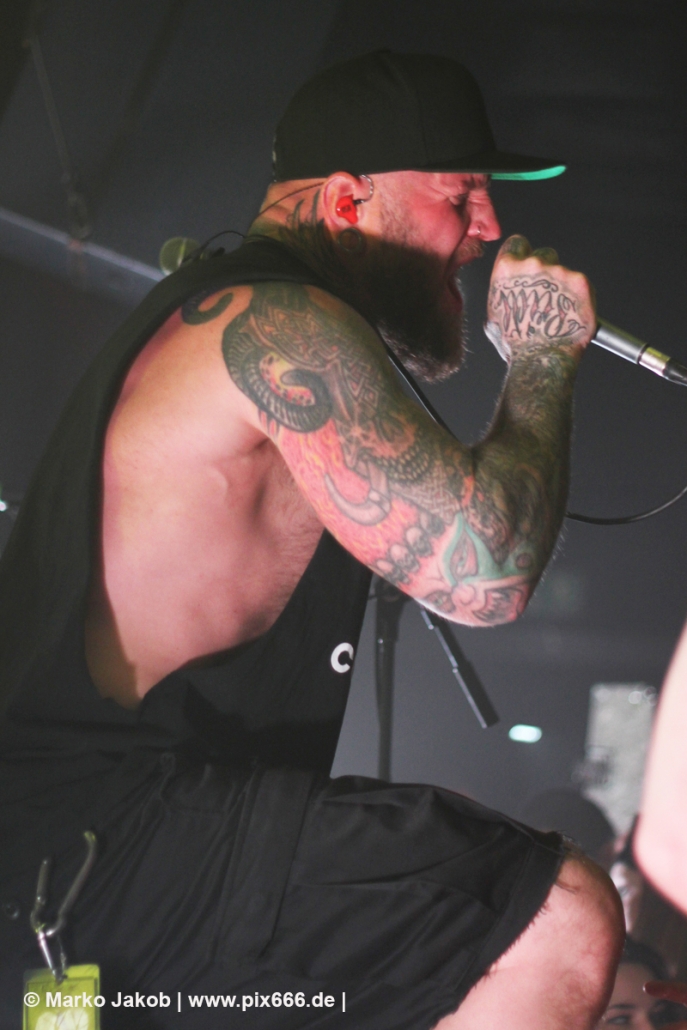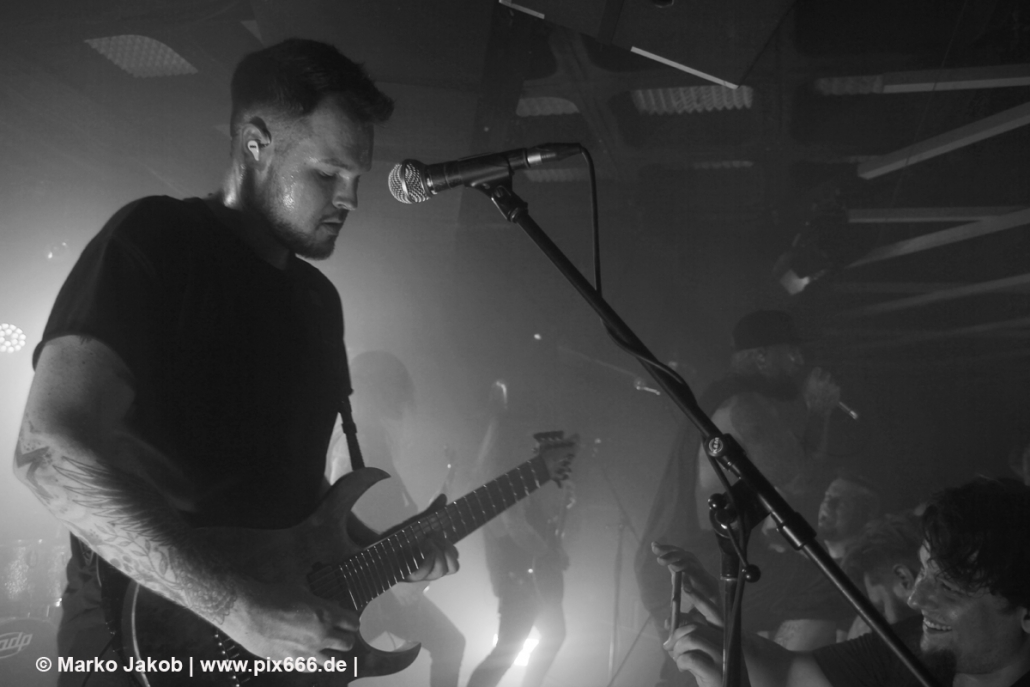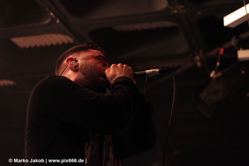 Die nächste Band war Heart Of A Coward aus Großbritannien. Seit einigen Jahren haben sie einen neuen Sänger. Aber keine Sorge – die Band funktioniert auch mit Kaan Tasan am Mikrofon perfekt. Er verstand es sehr gut, das Publikum mit in das Konzert einzubinden. „Macht Stimmung“, „Ich will Hände sehen“ oder „Let’s Go“ waren einige der Worte, die er öfters an das Publikum richtete. Die Bühne im Musik und Frieden ist etwa nur 40 cm hoch, aber Kaan stand fast die ganze Zeit auf einem Podest und überragte somit das Publikum, dass sehr dicht am Geschehen dran war. Man kann sagen, die Fans waren fast mit auf der Bühne – Konzertfeeling pur. Der Sound war toll und die Musik ziemlich laut. Dann kam die Aufforderung zum Headbangen – das lassen sich Metal Fans natürlich nicht zweimal sagen.