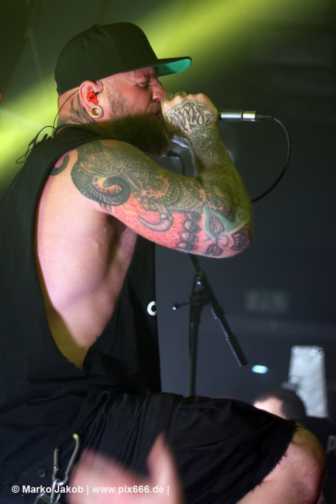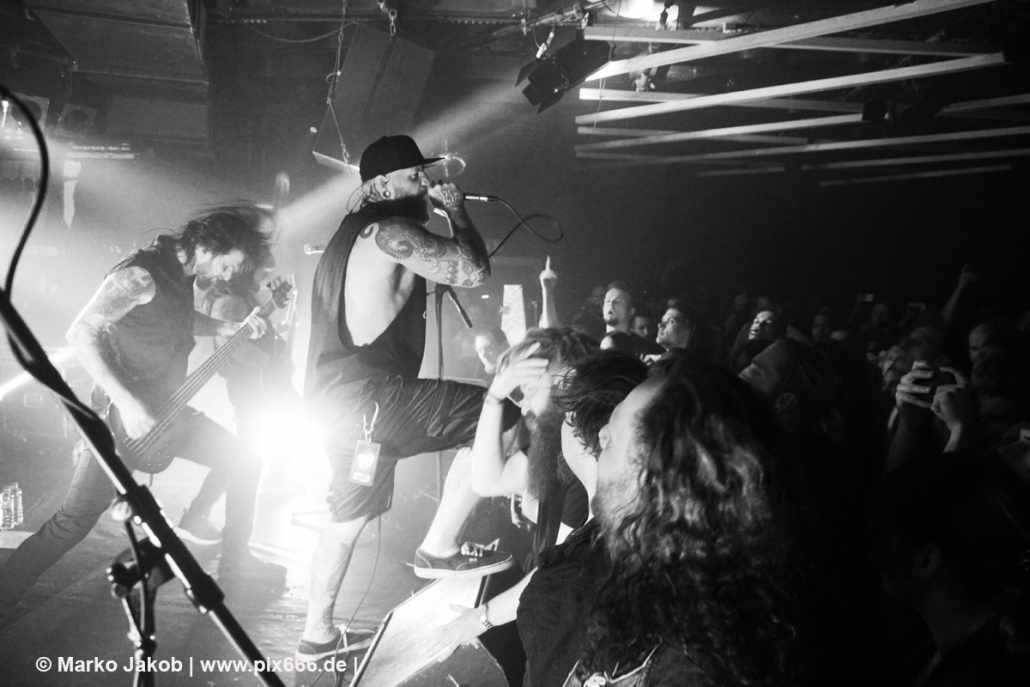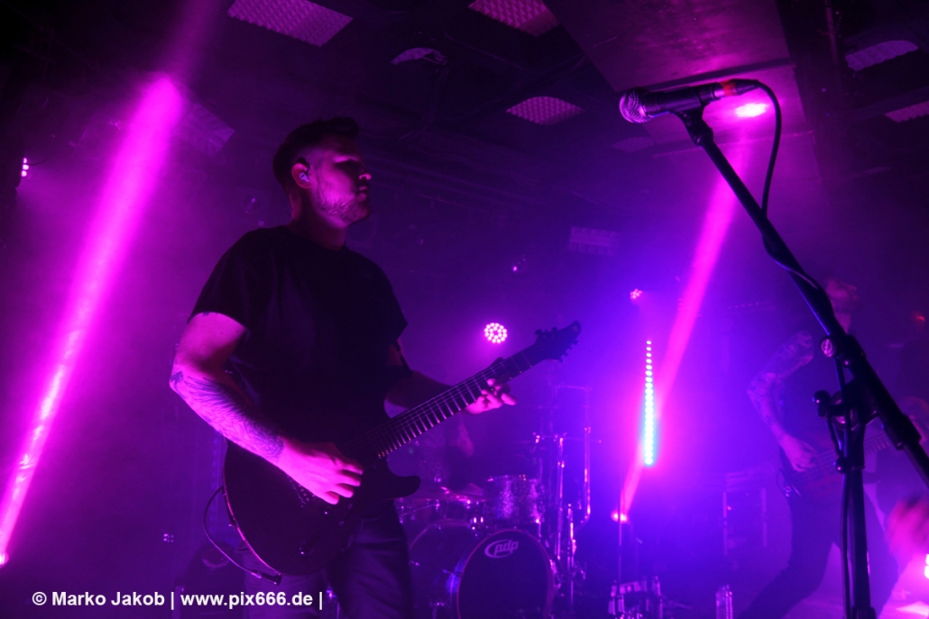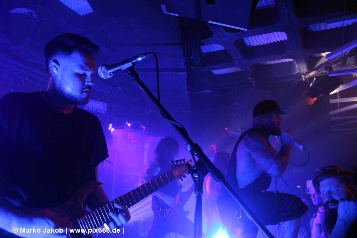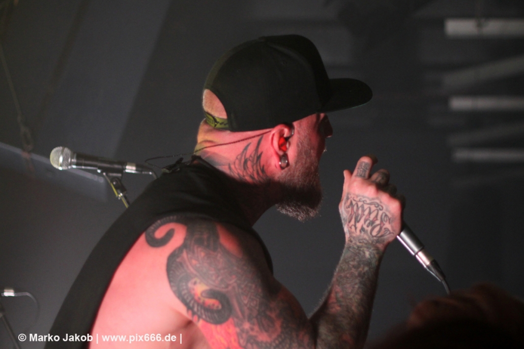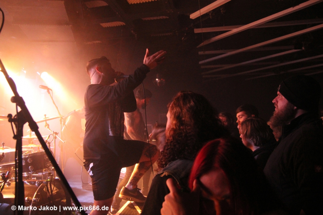 Die nächste Band war Heart Of A Coward aus Großbritannien. Seit einigen Jahren haben sie einen neuen Sänger. Aber keine Sorge – die Band funktioniert auch mit Kaan Tasan am Mikrofon perfekt. Er verstand es sehr gut, das Publikum mit in das Konzert einzubinden. „Macht Stimmung“, „Ich will Hände sehen“ oder „Let’s Go“ waren einige der Worte, die er öfters an das Publikum richtete. Die Bühne im Musik und Frieden ist etwa nur 40 cm hoch, aber Kaan stand fast die ganze Zeit auf einem Podest und überragte somit das Publikum, dass sehr dicht am Geschehen dran war. Man kann sagen, die Fans waren fast mit auf der Bühne – Konzertfeeling pur. Der Sound war toll und die Musik ziemlich laut. Dann kam die Aufforderung zum Headbangen – das lassen sich Metal Fans natürlich nicht zweimal sagen.