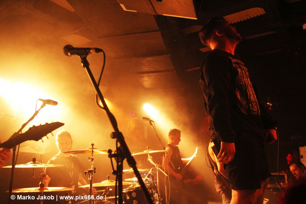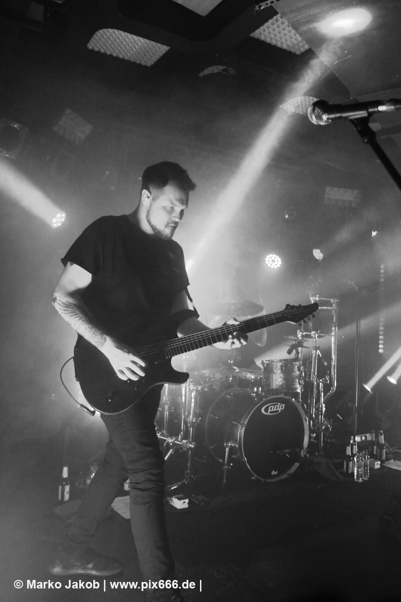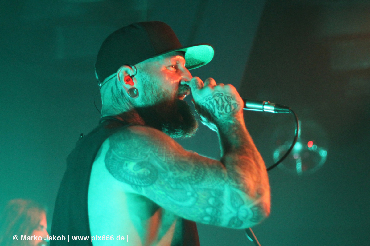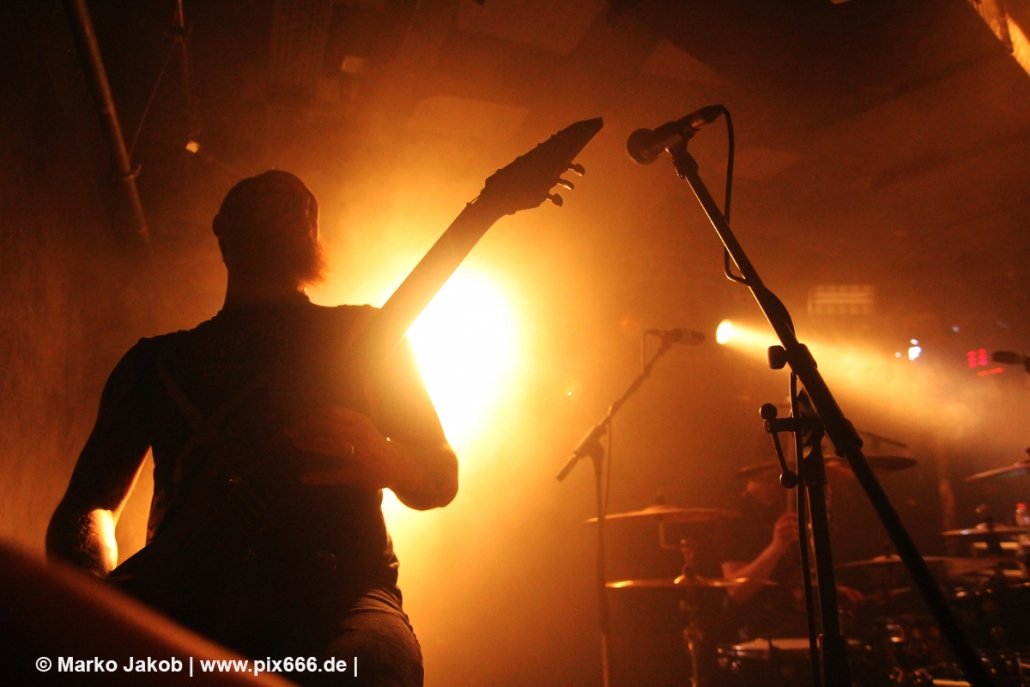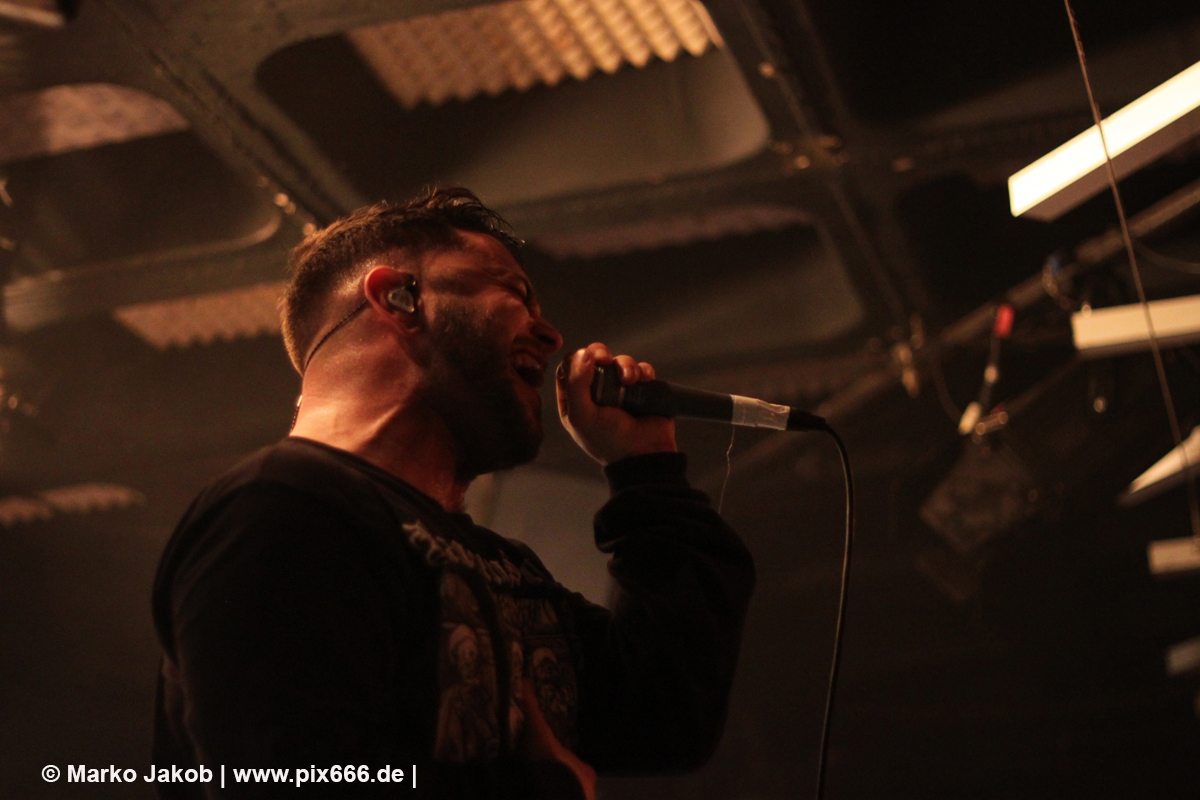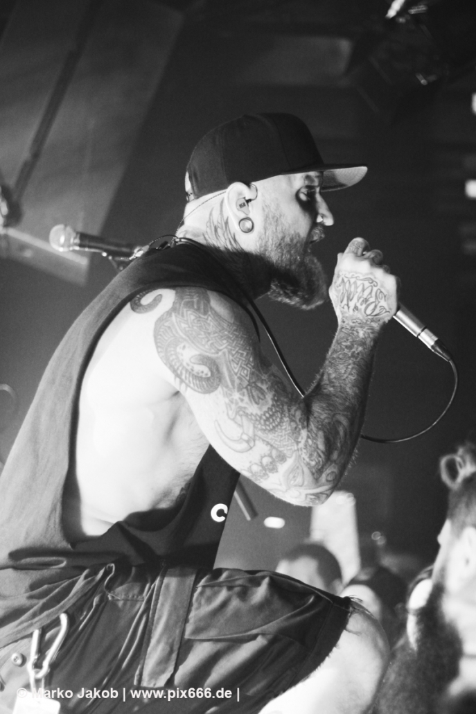 Die nächste Band war Heart Of A Coward aus Großbritannien. Seit einigen Jahren haben sie einen neuen Sänger. Aber keine Sorge – die Band funktioniert auch mit Kaan Tasan am Mikrofon perfekt. Er verstand es sehr gut, das Publikum mit in das Konzert einzubinden. „Macht Stimmung“, „Ich will Hände sehen“ oder „Let’s Go“ waren einige der Worte, die er öfters an das Publikum richtete. Die Bühne im Musik und Frieden ist etwa nur 40 cm hoch, aber Kaan stand fast die ganze Zeit auf einem Podest und überragte somit das Publikum, dass sehr dicht am Geschehen dran war. Man kann sagen, die Fans waren fast mit auf der Bühne – Konzertfeeling pur. Der Sound war toll und die Musik ziemlich laut. Dann kam die Aufforderung zum Headbangen – das lassen sich Metal Fans natürlich nicht zweimal sagen.