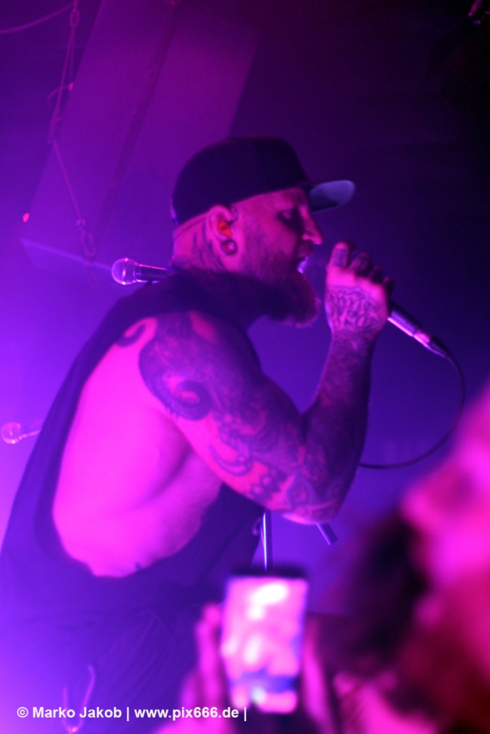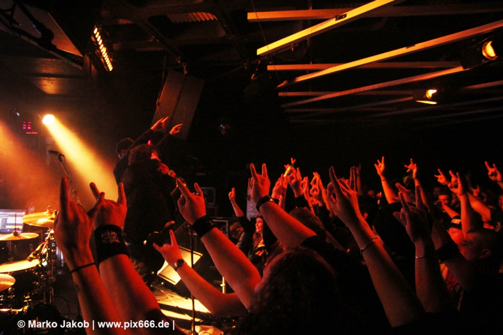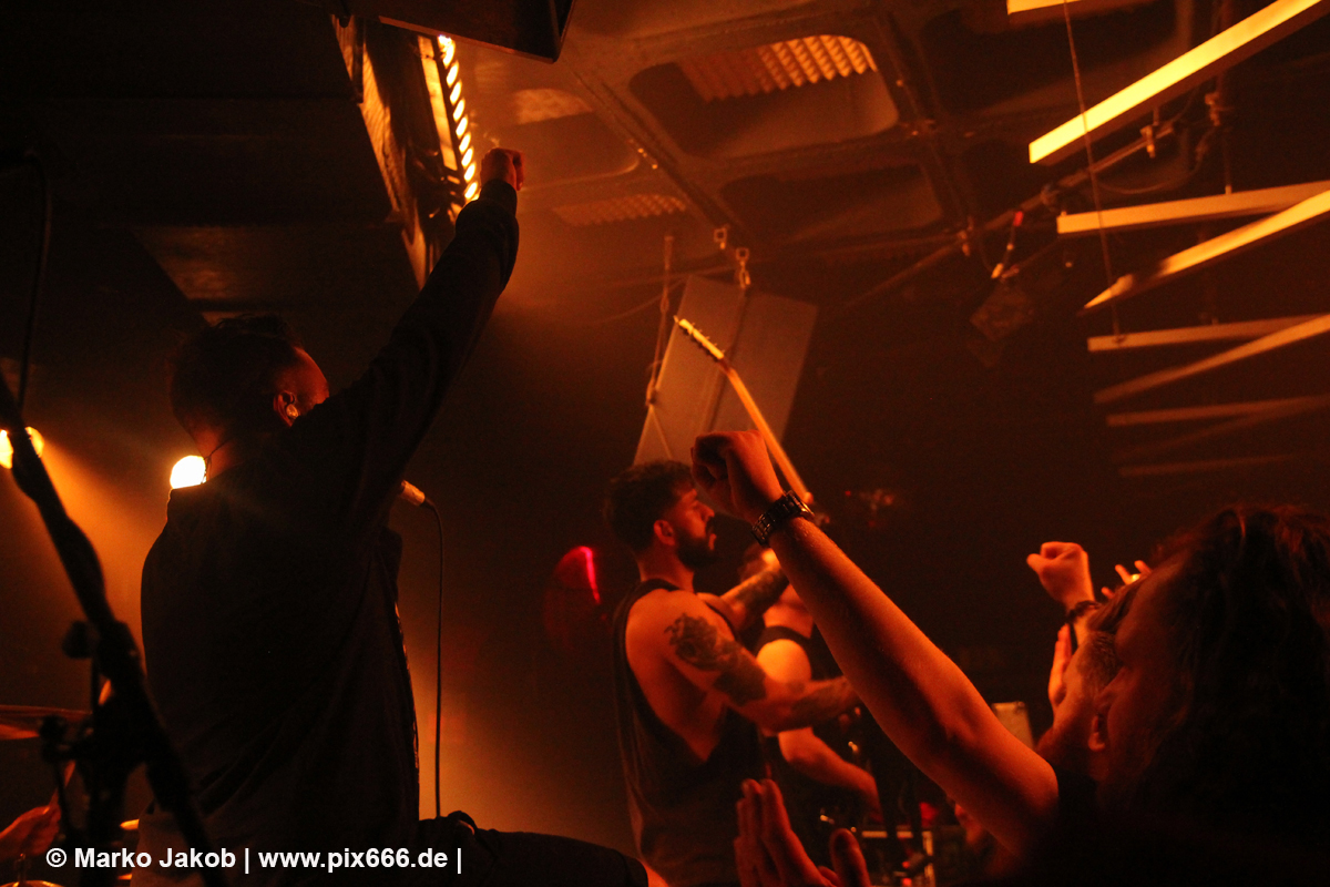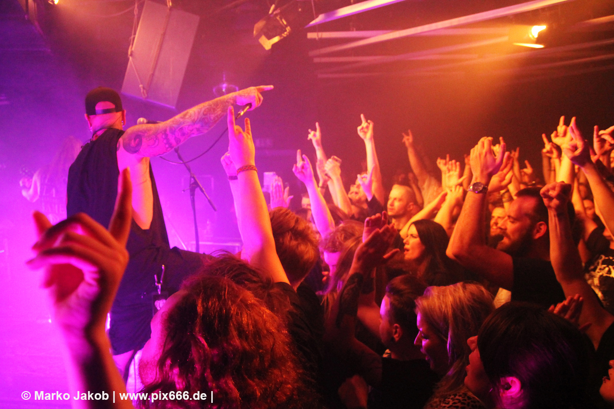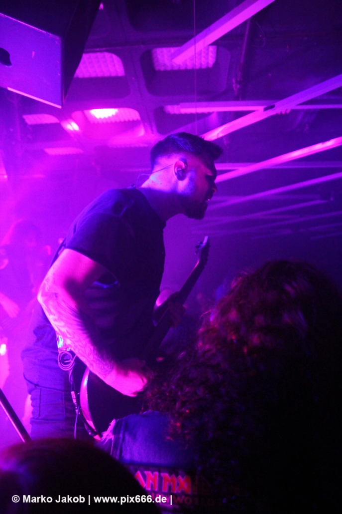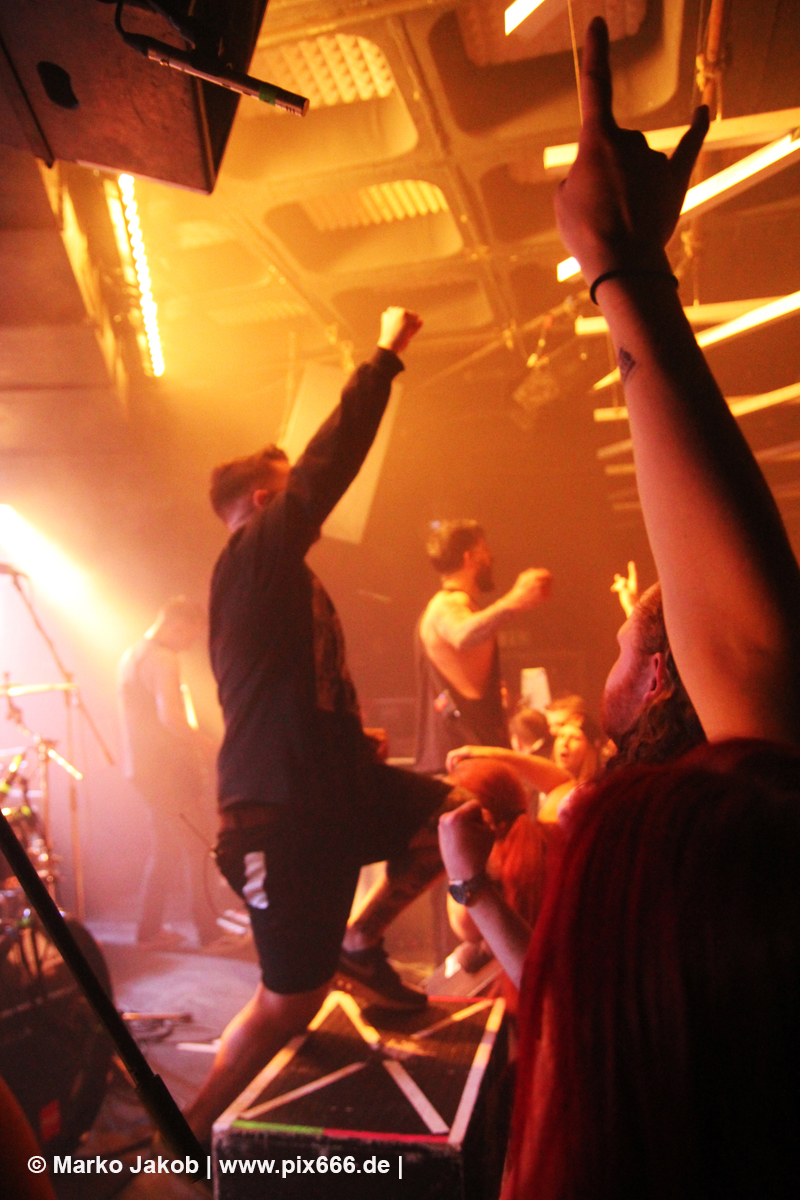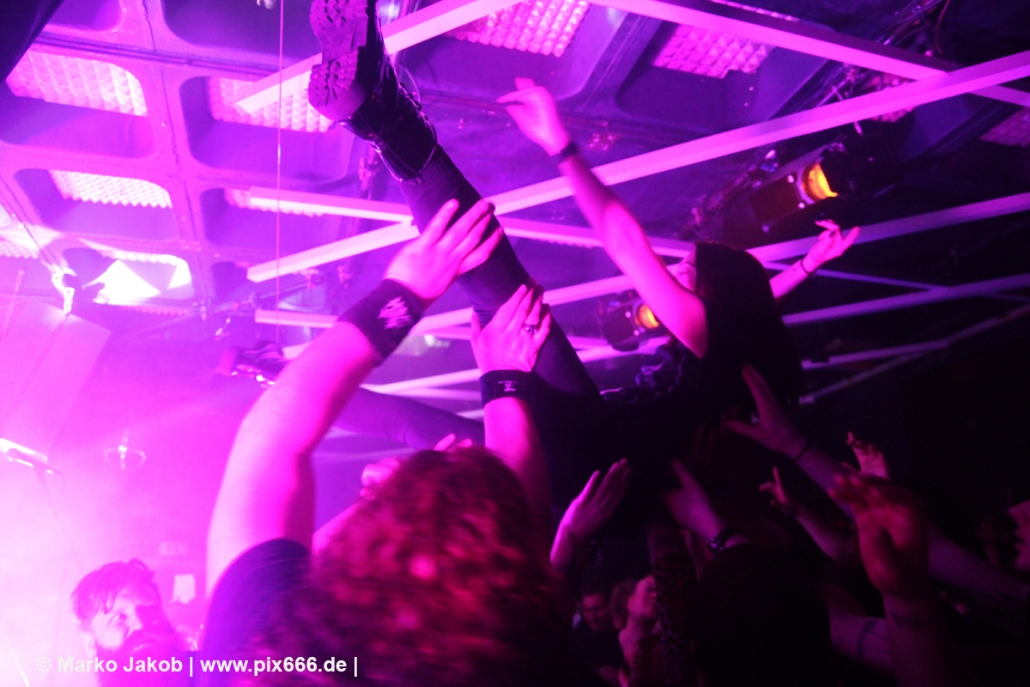 Immer wieder standen Fans auf der Bühne und Dennis hat sogar mal mitgeholfen, als es nicht so richtig klappen wollte … Die Hauptstadt war wirklich gut drauf, und das an einem Donnerstag – Respekt! Dennis sagte später: „Das ist das zweite Konzert auf der Tour – gestern Hamburg war schon toll – aber das sollte für die Hauptstadt kein Problem sein, oder?“ Das Publikum war nun total im Konzert versunken, die komplette Masse bewegte sich ununterbrochen hin und her. Ansagen von der Bühne, wie zum Bespiel: ‚Oh, ihr seid viel zu leise – macht doch Mal Lärm im Haus‘ trugen dann natürlich zu noch mehr Alarm im Club bei. Dann war Moshpit Time. Dennis sagte: ‚Ich möchte Chaos sehen‘. Es war wirklich unglaublich geil. Über 400 Menschen und kaum einer stand still. Nach etwa 70 Minuten endete mit dem Song ‚Saviour‘ ein toller Metal Abend.