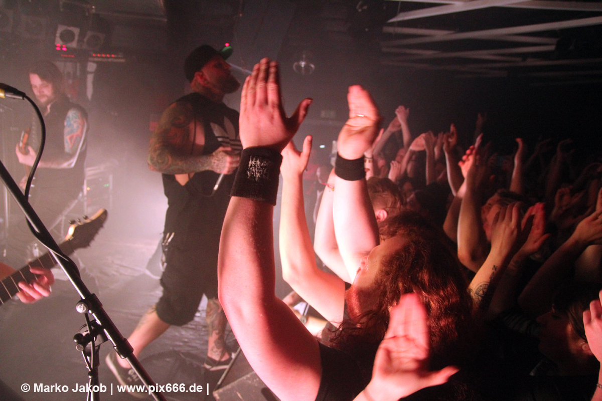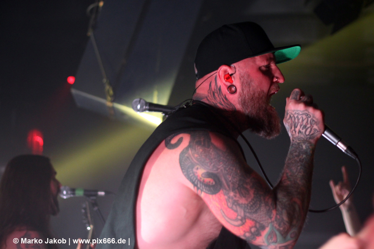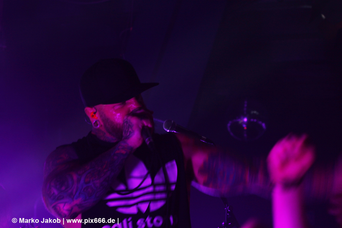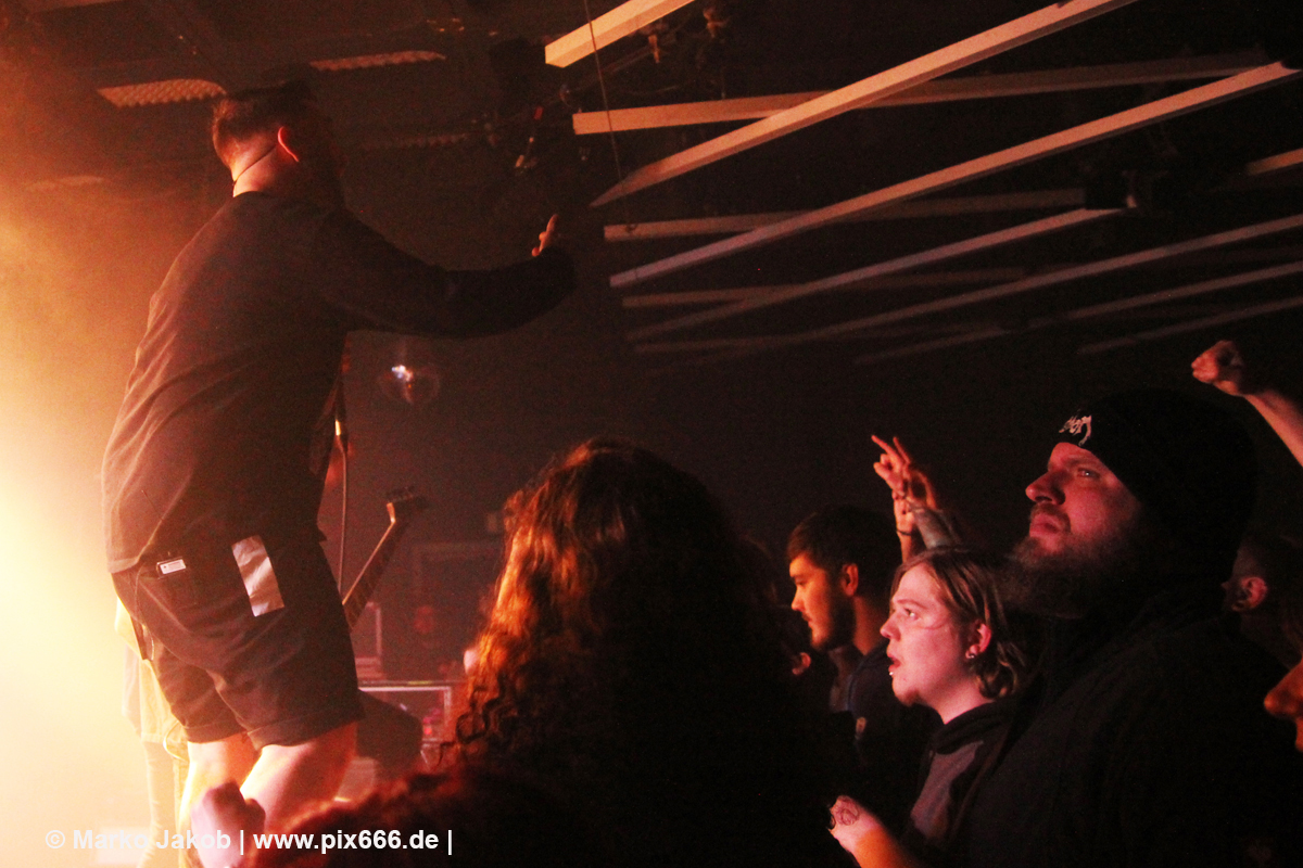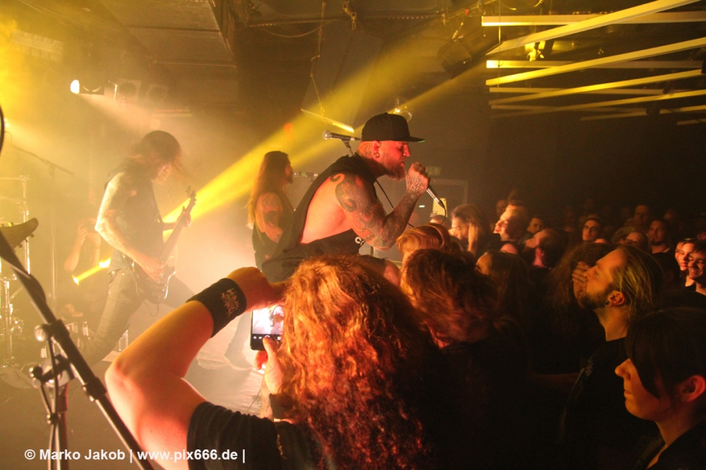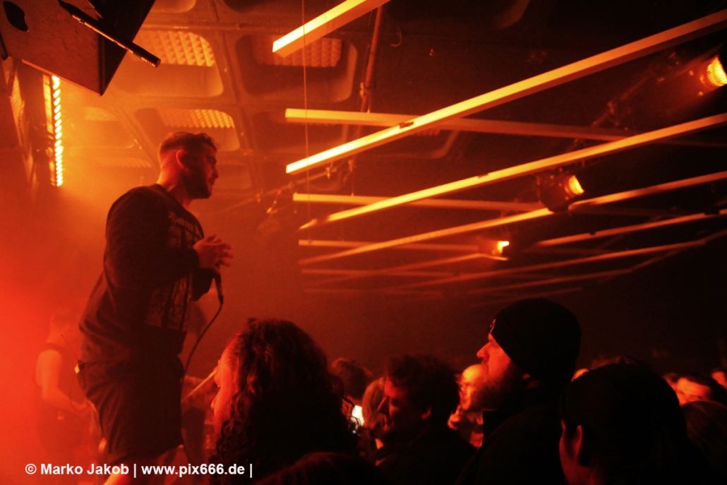 Immer wieder standen Fans auf der Bühne und Dennis hat sogar mal mitgeholfen, als es nicht so richtig klappen wollte … Die Hauptstadt war wirklich gut drauf, und das an einem Donnerstag – Respekt! Dennis sagte später: „Das ist das zweite Konzert auf der Tour – gestern Hamburg war schon toll – aber das sollte für die Hauptstadt kein Problem sein, oder?“ Das Publikum war nun total im Konzert versunken, die komplette Masse bewegte sich ununterbrochen hin und her. Ansagen von der Bühne, wie zum Bespiel: ‚Oh, ihr seid viel zu leise – macht doch Mal Lärm im Haus‘ trugen dann natürlich zu noch mehr Alarm im Club bei. Dann war Moshpit Time. Dennis sagte: ‚Ich möchte Chaos sehen‘. Es war wirklich unglaublich geil. Über 400 Menschen und kaum einer stand still. Nach etwa 70 Minuten endete mit dem Song ‚Saviour‘ ein toller Metal Abend.