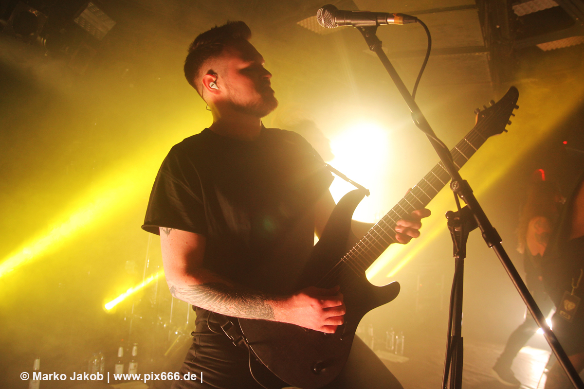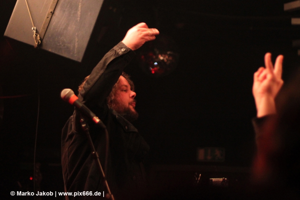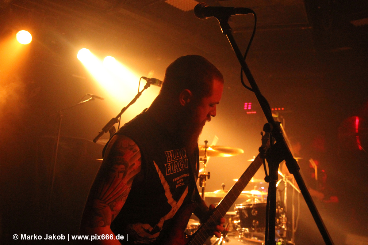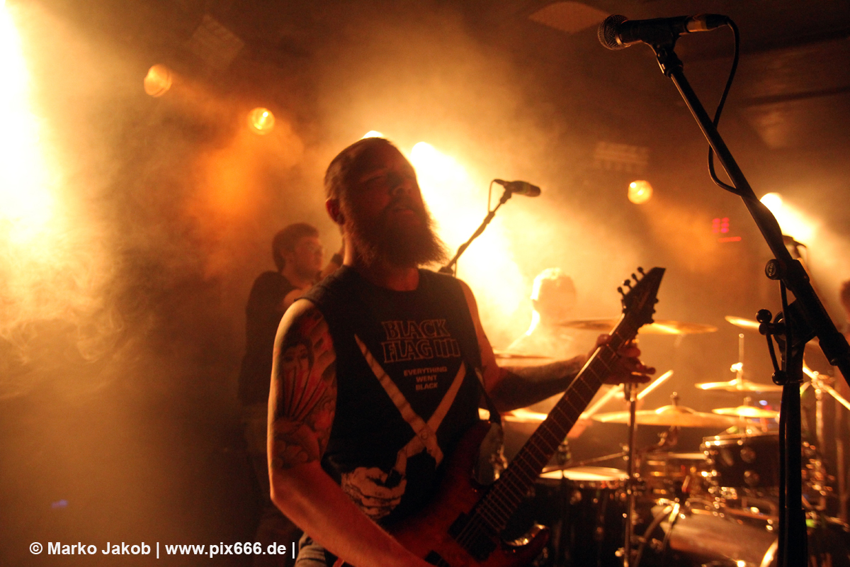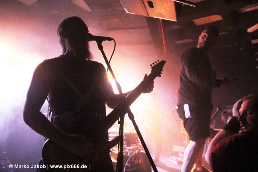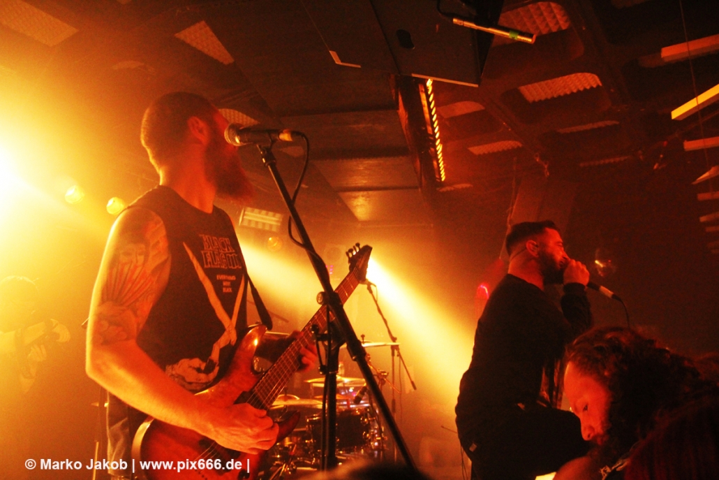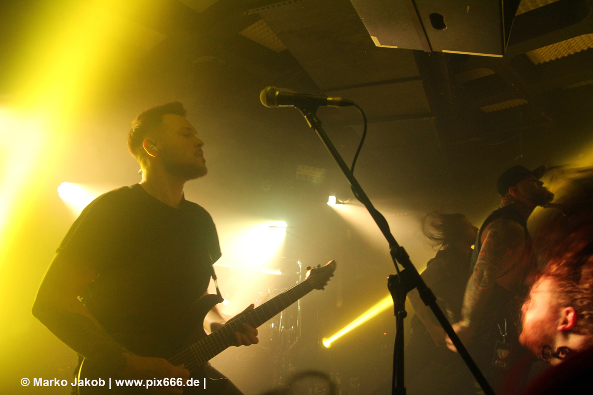 Immer wieder standen Fans auf der Bühne und Dennis hat sogar mal mitgeholfen, als es nicht so richtig klappen wollte … Die Hauptstadt war wirklich gut drauf, und das an einem Donnerstag – Respekt! Dennis sagte später: „Das ist das zweite Konzert auf der Tour – gestern Hamburg war schon toll – aber das sollte für die Hauptstadt kein Problem sein, oder?“ Das Publikum war nun total im Konzert versunken, die komplette Masse bewegte sich ununterbrochen hin und her. Ansagen von der Bühne, wie zum Bespiel: ‚Oh, ihr seid viel zu leise – macht doch Mal Lärm im Haus‘ trugen dann natürlich zu noch mehr Alarm im Club bei. Dann war Moshpit Time. Dennis sagte: ‚Ich möchte Chaos sehen‘. Es war wirklich unglaublich geil. Über 400 Menschen und kaum einer stand still. Nach etwa 70 Minuten endete mit dem Song ‚Saviour‘ ein toller Metal Abend.
