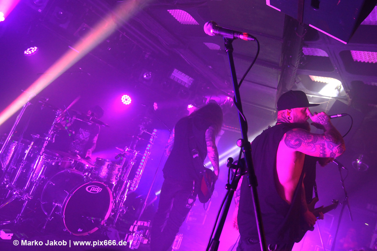 Any Given Day ist eine deutsche Metalcore Band aus Gelsenkirchen. Ihr aktuelles Album ‚Overpower‘ schaffte wie schon der Vorgänger den Sprung in die Top 20 der deutschen Albumcharts. Erste große Aufmerksamkeit erhielt die Band vor einigen Jahren mit dem Rihanna Coversong ‚Diamonds‘. Der Videoclip dazu hat auf YouTube inzwischen mehr als 10 Millionen Klicks. Any Given Day waren live schon mit so bekannten Bands wie Caliban oder Bury Tomorrow auf Tour. Aktuell sind sie auf Headliner Tour mit dem neuen Album im Gepäck – und Berlin meldete ausverkauft! Vor Beginn des Konzertes von Any Given Day musste auf der Bühne einiges umgebaut werden und die Kabel der Vorbands eingesammelt werden. Das kleine Schlagzeug, welches die Support Bands benutzten, wurde weggeräumt, so dass die Musiker nun viel mehr Platz auf der Bühne hatten. Kurz vor dem Auftritt wurde die Bühne im ‚Musik und Frieden‘ gut eingenebelt – dann wurde es komplett dunkel im Club. Die Band marschierte ein und die Stimmung war sofort unbeschreiblich. Los ging es mit ‚Start Over‘ vom neuen Album. ‚Willkommen bei unserer Tour – Ich will euch springen sehen, von links nach rechts‘, sagte Sänger Dennis – und die Fans sprangen nicht nur, sie sangen dann beim zweiten Song ‚Loveless‘ sogar gleich mit. Die Bühne war jetzt in leichten Nebel und rotes Licht gefärbt, und fast unbemerkt befanden sich dann auch schon die ersten Fans direkt auf der Bühne – und nun begann eine riesige Crowdsurfing Party- das war wirklich cool.