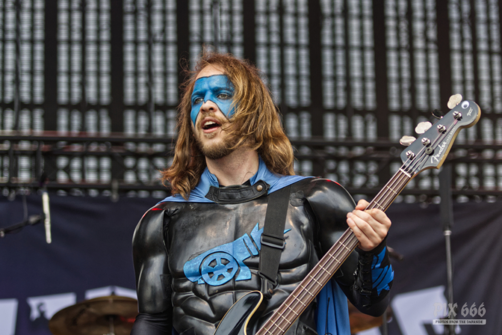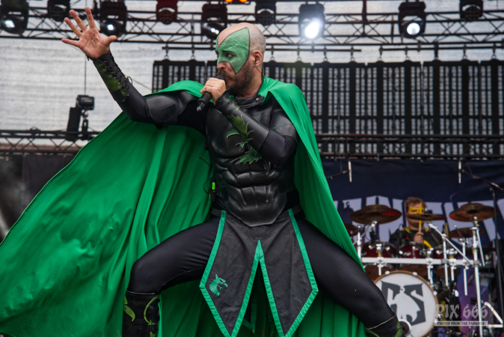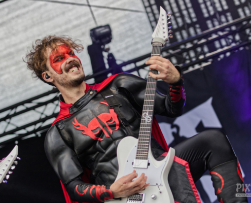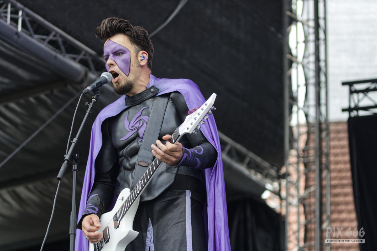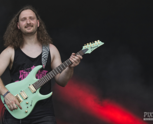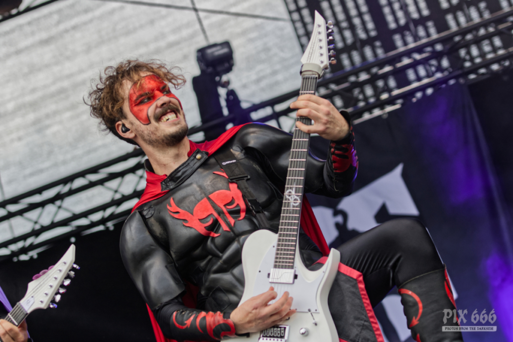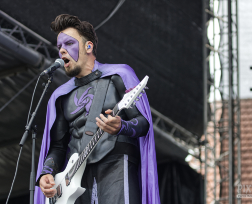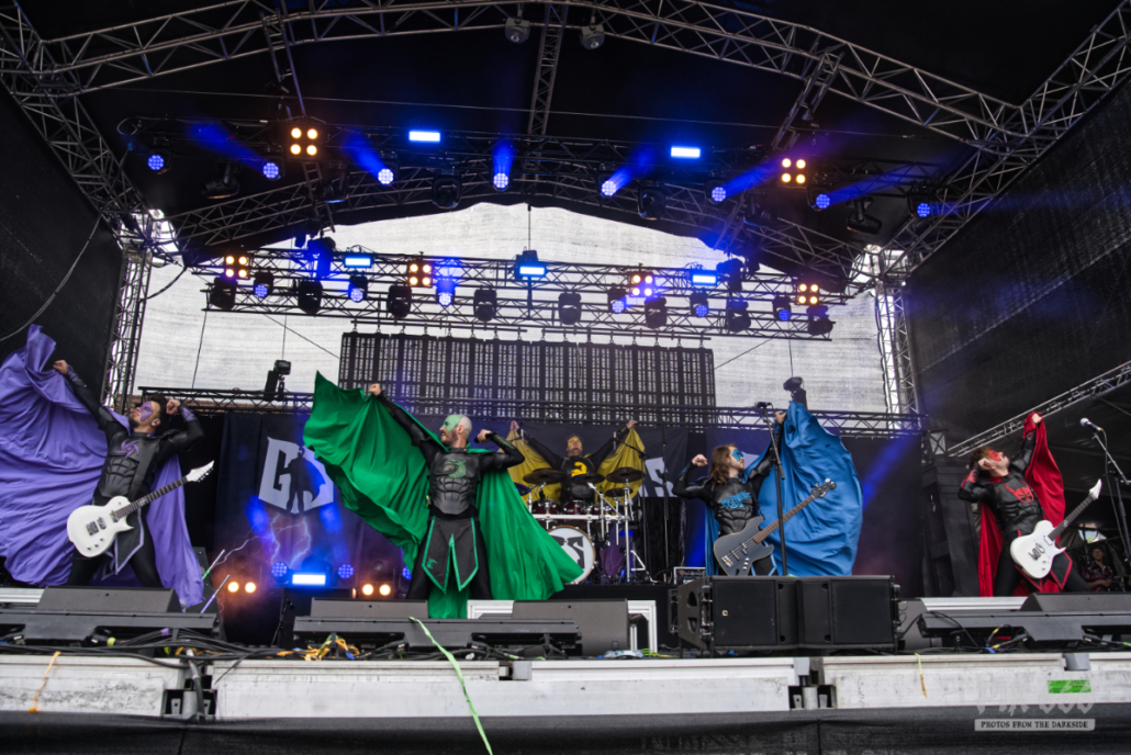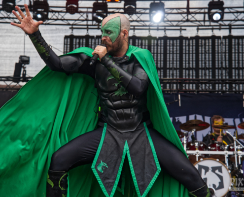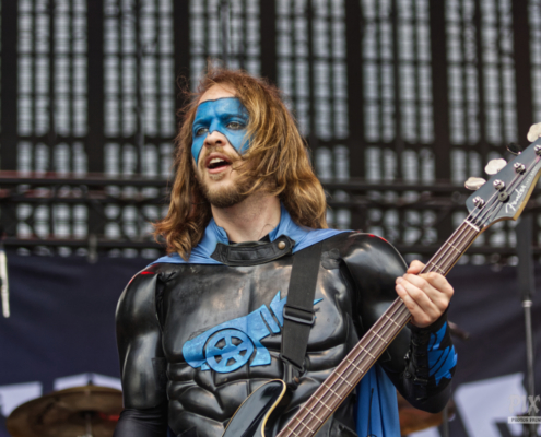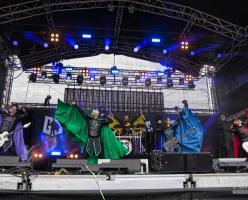 Bunt – Bunter – Grailknights. Grün, gelb, rot, violett und blau – diese Farben kennt der Metalfan eigentlich nur aus der Natur, aber nicht aus dem Kleiderschrank. Aber genau das ist das Markenzeichen der ‚bunten Vögel‘ aus Hannover. Die Grailknights bringen mit ihrer stimmungsvollen, gestenreichen Show und ihren coolen Posen in Superheldenkostümen echt Schwung und Stimmung auf so ein Festivalareal. Die Powermetal Band, die unter anderem auch schon mit Sabaton auf Tour war, hatte genau das richtige Gespür, um die Musikfans mitzureisen. Die Band war von der schönen Kulisse des Festivals beeindruckt und sprühte selbst vor Spielfreude. Die Songs vom aktuellen Album ‚Muscle Bound for Glory‘, sowie Klassiker aus der über 20-jährigen Bandgeschichte brachten tolle Stimmung ins Publikum und verleitete nicht Wenige hin und wieder sogar zum Mitsingen bzw -grölen. Musikalisch und kostümtechnisch ein willkommener Farbtupfer des Area 53 Festivals 2024.