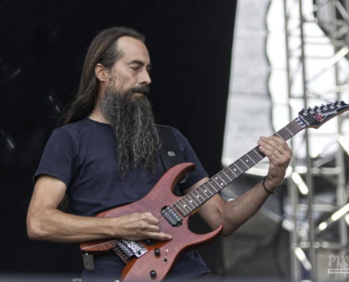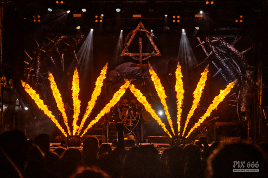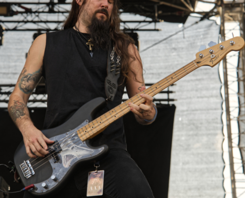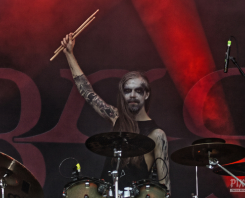 Mit ein bisschen Verspätung stand dann der Headliner des Area 53 Festivals 2024 auf der Bühne. Behemoth aus Polen haben es mehrfach geschafft, mit ihrem Extreme-Metal in ihrer Heimat die Spitzenposition der Albumscharts zu erobern. Auch im deutschsprachigen Raum geht es für die Jungs um Sänger Adam regelmäßig in die Top20. Die Show begann mit dem Titel ‚ Once Upon a Pale Horse‘ vom aktuellsten Album. „Wer von euch ist vor 1991 geboren?“ fragte Adam dann in Richtung prall gefülltes Festivalgelände. „Das ist das Jahr, in dem Behemoth geboren wurde.“ Die Musiker hatten spektakuläre Mikrofonständer, außerdem waren links und rechts etwa drei Meter hohe Podeste aufgebaut, auf die hin und wieder Bassist und Gitarrist einen Ausflug machten. Das war auch teilweise von Nöten, da es am Rand der Bühne aller paar Minuten richtig heiß wurde. Feuer schoss unentwegt nach oben – mal gekreuzt, dann wieder fächerförmig. Dann gab es einen Song, den Behemoth noch nie live gespielt hatten bis jetzt – ‚Cursed Angel of Doom‘. Das Publikum war völlig in Ekstase und angetan von der umwerfenden Metalshow – an ein frühzeitiges Nachhause gehen war nicht zu denken, niemand wollte auch nur eine einzige Minute von diesem Spektakel verpassen. Egal, wo man auf dem Festivalgelände stand – die Show von Behemoth war ein purer Genuss für Ohren und Augen.