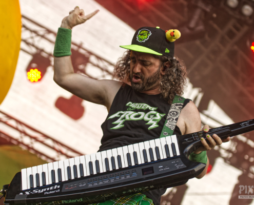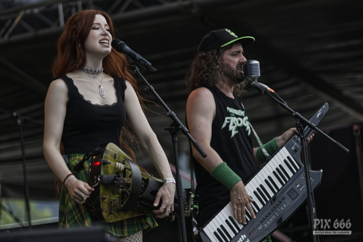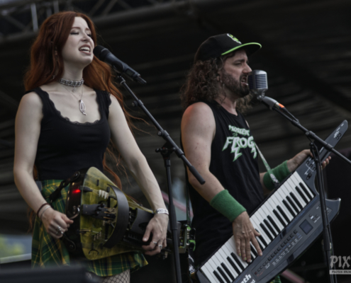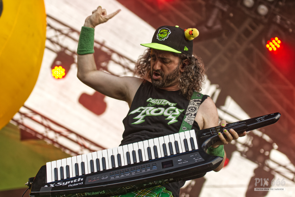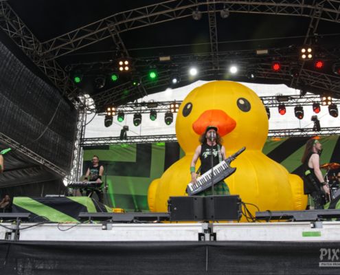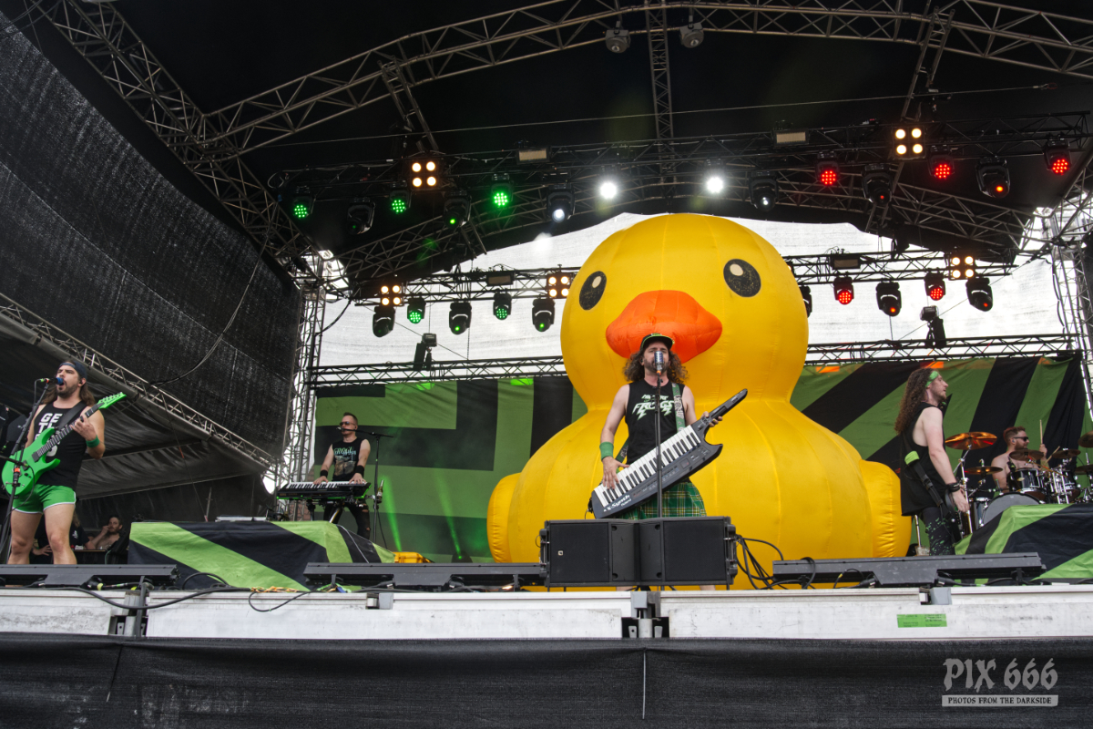 Auch heute gab es einen farblichen ‚Ausrutscher‘ beim Area 53 Festival. Die traditionelle riesige gelbe Ente auf die Bühne sowie die Vorliebe der Band Alestorm für grüne Hosen und Gitarre, sowie den schicken grüngelben Schottenrock sind ja eh längst bekannt. Die Jungs lieferten wie gewohnt eine coole Liveshow ab und stachelten die Fans so richtig an „Ich hab gehört, ihr seid das lauteste Publikum.“ Wie immer bei Alestorm Konzerten war die Stimmung phänomenal – auch das Wetter passte nach wie vor. Ab dem vierten Song gab es eine Überraschung , denn die Band bekam weiblichen Zuwachs auf der Bühne. Die deutsche Drehorgelspielerin Patty Gurdy verlieh der Show das gewisse Etwas und nicht nur mit ihrer genialen Gesangseinlage zum Bespiel bei ‚Zombies ate my Brain‘ weckte sie die Hoffnung bei vielen Fans der Band – bitte, bitte lass Patty eines Tages fixes Bandmitglied werden. Schauen wir einfach, was die Zukunft bringt. Auf jeden Fall war bei der Alestorm Show das Stimmungsbarometer so ziemlich am Anschlag.