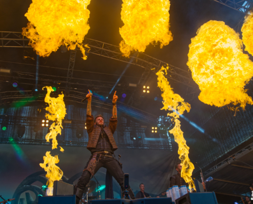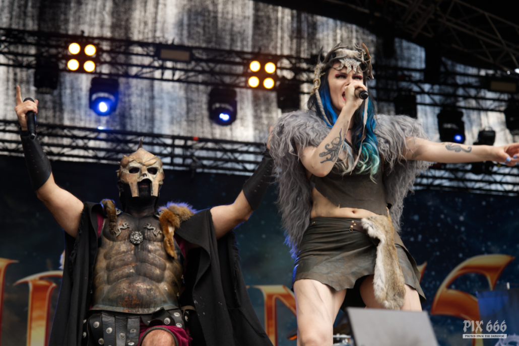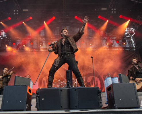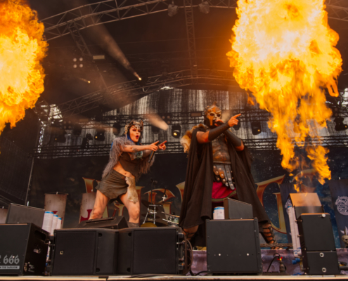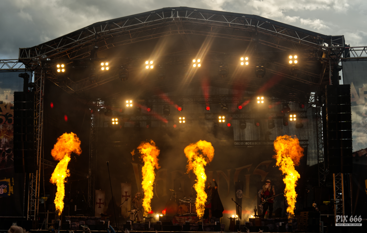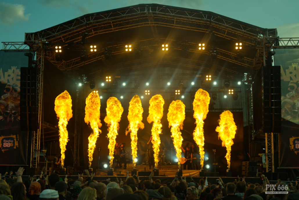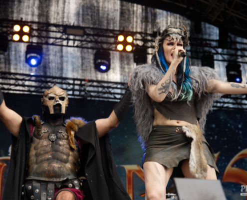 Der Kriegshammer wurde geschwungen und das Area 53 Festival 2025 bebte unter der epischen Wucht der Warkings. Mit einer Show, die irgendwo zwischen antiker Mythologie, Power-Metal und Pyro-Overkill rangierte, lieferten die Krieger eine der aufwendigsten und spektakulärsten Performances des Wochenendes. Das aktuelle Album ‚Armageddon‘, welches am 04. Juli 2025 erschien, hatte es pünktlich zum Area 53 Wochenende bis auf Platz 6 der deutschen Charts geschafft – das Publikum feierte die neuen Singles, genauso wie die Klassiker, mit denen die Warkings das Area 53 bereits 2019 und 2022 im Sturm eroberten. Ein Fan in einem riesigen schwarzen Luftreifen, der auf Händen durch das Publikum surfte, wurde zum Highlight in der Crowd und zog für einen Song die Aufmerksamkeit auf sich. Warkings ließen es sich nicht nehmen, zwischen den Songs viel mit dem Publikum zu sprechen – mal episch, mal augenzwinkernd, aber immer charismatisch. Die Show selbst war ein wahres Spektakel: Feuerfontänen, Nebel, Lichtgewitter – begleitet von hymnenhaften Songs wie ‚Spartacus‘, ‚Sparta‘, oder ‚Gladiator‘. Warkings waren mehr als nur eine Band – sie waren ein Ereignis und das Area 53 Festival ihre Schlachtbühne. Das war beeindruckend und stimmungsvoll und fand viel zu schnell ein Ende.