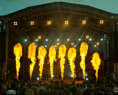 Kanonenfieber lieferten am Samstagabend eine energiegeladene Show, die vor allem durch eine beeindruckende Pyroshow bestach. Flammen und Funken begleiteten die kraftvollen Klänge der Band und sorgten für eine intensive Atmosphäre vor der Bühne. Das Projekt Kanonenfieber gibt es seit 2020 und es hat in der Musikwelt tatsächlich eingeschlagen, wie eine Kanonenkugel. Bereits das Debutalbum ‚Menschenmühle‘ erregte jede Menge Aufmerksamkeit und der Nachfolger im Jahr 2024 schaffte dann sensationell den Sprung auf Platz 3 der deutschen Albumcharts. Die Thematik der Songs rund um den ersten Weltkrieg waren dann auch bei der Bühnendeko präsent – Stacheldraht, Sandsäcke wie in einem Schützengraben sowie Kanonen säumten die große Bühne. Und immer wieder stieg Feuer auf. Bei einem Song schneite es dann sogar, alles war gut auf die Songs abgestimmt. Kanonenfieber bewiesen mit ihrem kraftvollen Set und der großartigen Pyroshow, warum sie auf Festivals für Begeisterung sorgen. Eine Show, die man so schnell nicht vergisst. Für einige war der Auftritt von Kanonenfieber das Highlight des letzten Tages. Wer mehr von Kanonenfieber sehen mag, muss sich für eine Österreich Show noch bis März 2026 gedulden, dann spielen die Musiker um Sänger und Bandgründer Noise im Orpheum Graz.