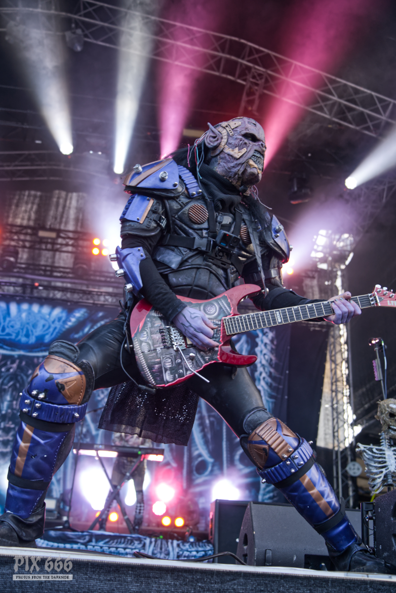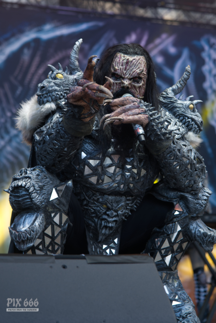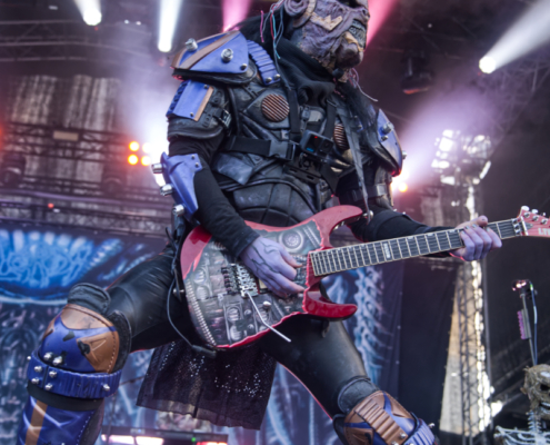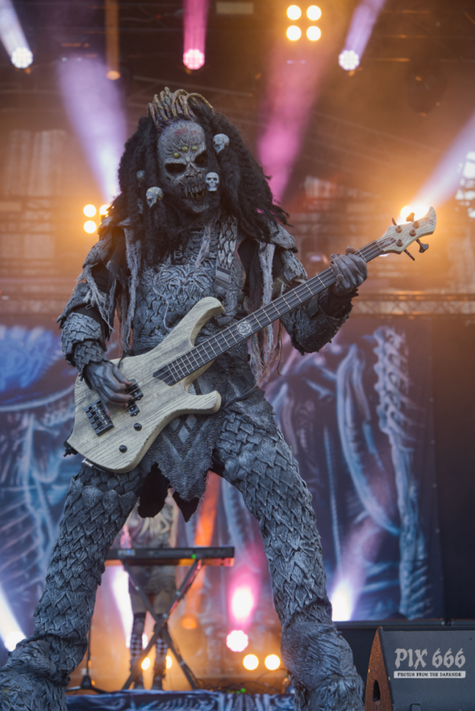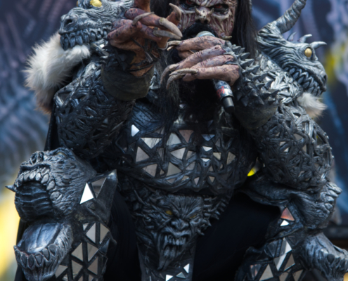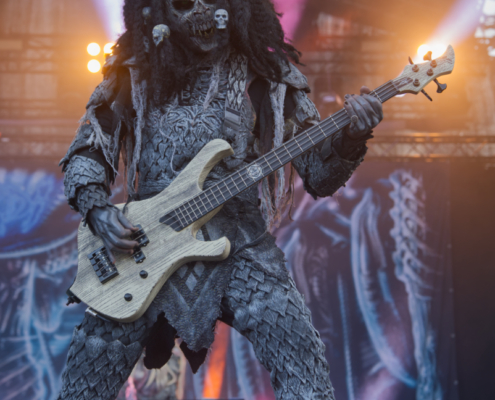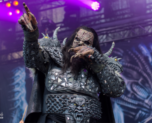 Und weiter ging es mit Metal-Legenden – denn am Freitagabend betraten nun Lordi die Bühne. Die finnischen Monster-Rocker verwandelten das Gelände in eine bizarre Horror-Metal-Show mit ihren längst berühmt gewordenen Kostümen und einem ordentlichen Schuss Selbstironie. Was die Besucher des Area 53 Festivals erlebten, war ein Spektakel, das sowohl visuell als auch musikalisch voll ins Schwarze traf. Schon beim ersten Song war klar – Lordi sind gekommen, um abzuliefern. Mr. Lordi selbst, massiv wie eh und je, thronte in seinem typischen Leder-Monster-Outfit über der Bühne und schmetterte seine Zeilen mit beeindruckender Stimmgewalt ins Publikum. Zwischen den Songs gab es kurze, witzige bis makabere Ansagen, und immer wieder gab es kleine Showeinlagen, die sich wie ein roter Faden durch das Konzert zogen. Zum Beispiel wurde ausgiebig der Unterschied im Deutschen zwischen ‚Ja‘ und ‚Ja Ja‘ analysiert. Aber natürlich kam die Musik auch nicht zu kurz, die Band war bestens eingespielt, die Gitarren kamen fett rüber. Natürlich gab es zum Schluss auch noch den weltberühmten Song ‚Hard Rock Hallelujah‘, der inzwischen weit über 100 Millionen Views auf YouTube hat. Auch ohne Pyro-Effekte lieferten Lordi eine sehens- und hörenswerte Show ab und das Area 53 Publikum war total aus dem Häuschen.