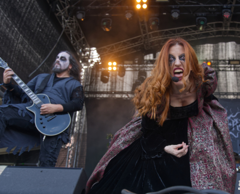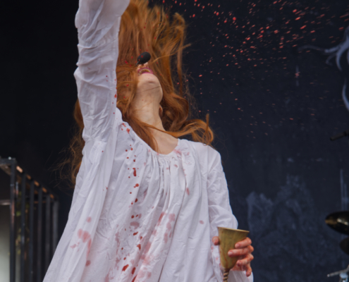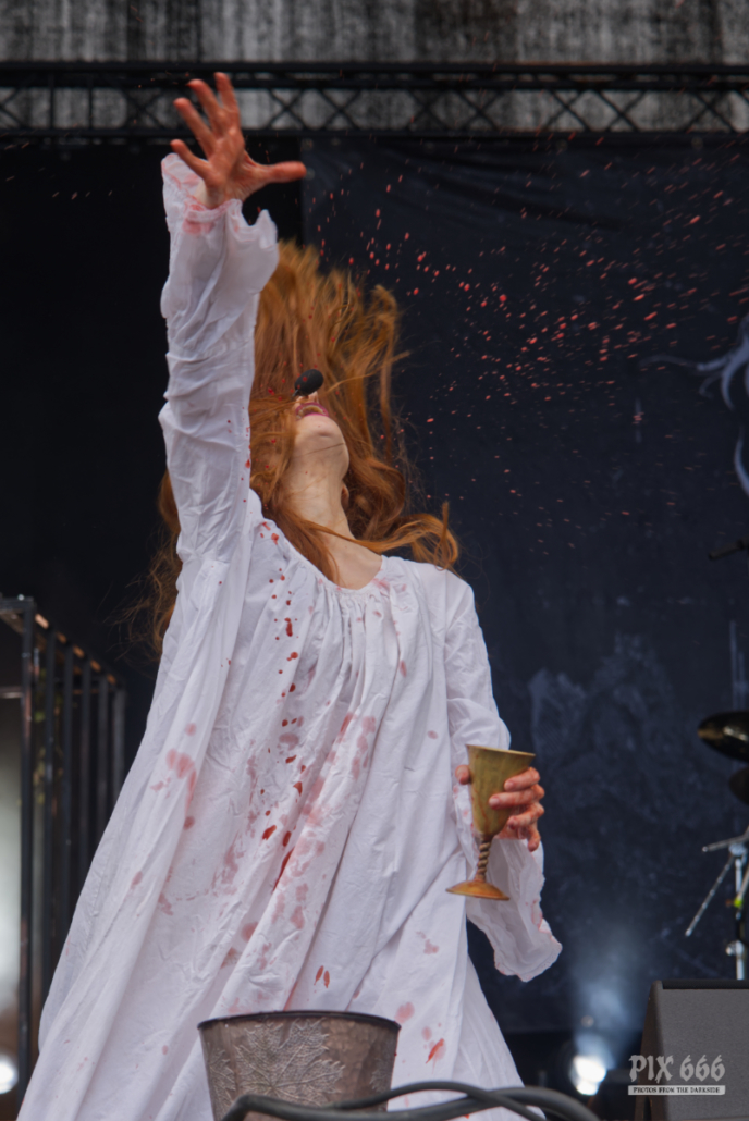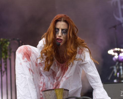 Was Erzsébet aus Spanien am Samstag auf die Bühne des Area 53 Festivals brachten, war mehr als nur ein Konzert – es war ein makabrer Theaterakt, ein okkultes Ritual, ein düsterer Trip durch Schmerz, Wahnsinn und Eleganz. Mit kunstvoll inszenierter Theatralik, blutgetränkten Requisiten und einem Käfig auf der Bühne zog Erzsébet das Publikum magisch an und führte die begeisterte Menge in eine Welt irgendwo zwischen Horrorfilm und Konzerterlebnis. Ob sich dabei der eine oder andere Zuschauer ein wenig gegruselt hat? Wahrscheinlich. 😊 Die ersten Reihen blieben von dem Blut nicht verschont, es spritzte teilweise bis über die erste Reihe hinaus. Doch genau das machte den Reiz aus. Erzsébet schafften es, Faszination und Begeisterung in einer Show zu vereinen, die wohl keiner so schnell vergessen wird. Das morbide Konzept mit einer Mischung aus Black Metal, Doom und symphonischen Elementen schlug ein wie eine Bombe. Besonders ‚Darvulia’s Eye‘ und ‚Domina Vestra‘ sorgten für Gänsehaut – nicht nur wegen der Musik, sondern auch wegen der intensiven visuellen Begleitung. Nach einigen Singles und einer EP hat die 2020 in Barcelona gegründete Band im vergangenen Jahr ihr Debutalbum ‚Six Hundred And Fitfy‘ veröffentlicht. Erzsébet lieferten eine kompromisslos inszenierte, blutrote Show ab, die das Publikum zwischen Staunen und Schaudern zurückließ. Nach der Show wurde die Autogrammstunde der Band von den begeisterten Fans förmlich gestürmt – auch am Merch blieb nicht mehr viel übrig.