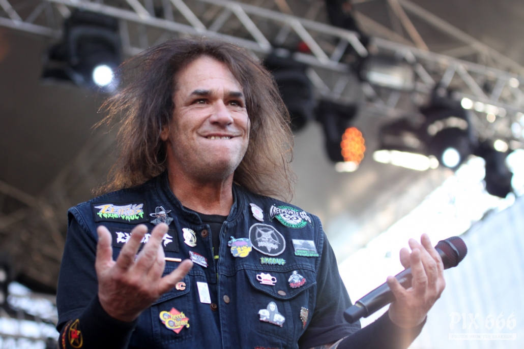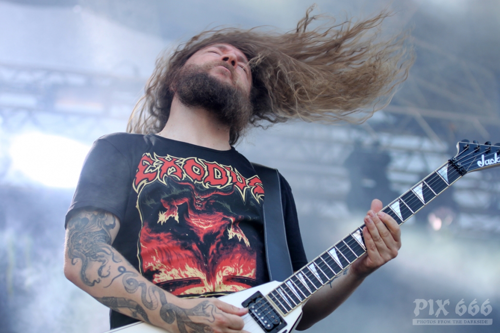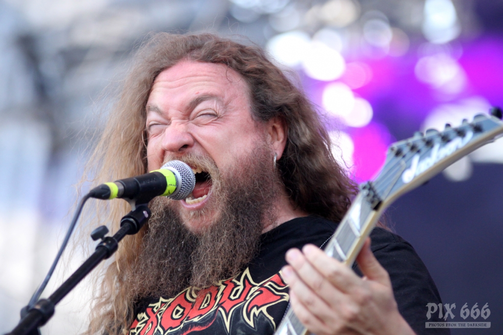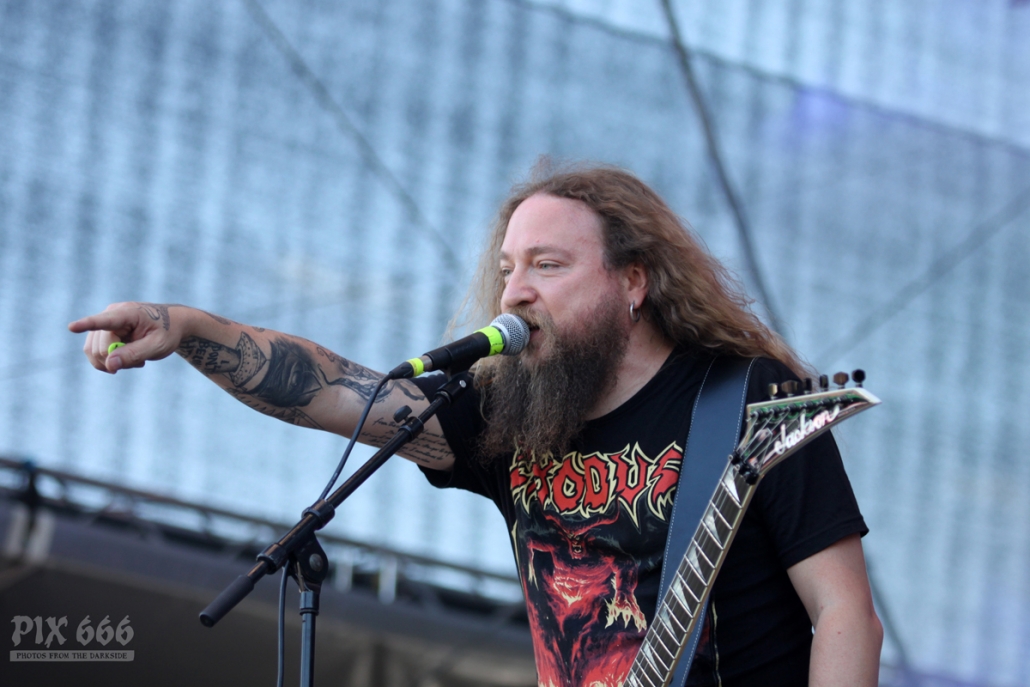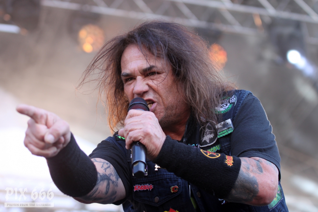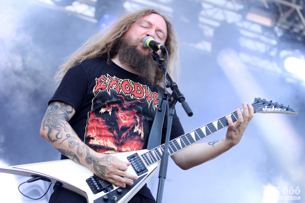 Exodus hatten ein ziemlich geiles Backdrop auf Bühnenbreite. Das Konzert startete mit dem neuen Song ‚The Beatings Will Continue‘, zu dem die Band letzten Sommer auch einen Videoclip veröffentlicht hat. Die Fans hatten während des Konzertes ziemlich oft die Hände in der Höhe – natürlich mit abgespreiztem kleinen Finger, sowie Zeigefinger – so muss das bei Metal… und mitgesungen wurde bei einigen Passagen auch lautstark. Dann gab es zwischen den Songs sogar Exodus Sprechchöre.