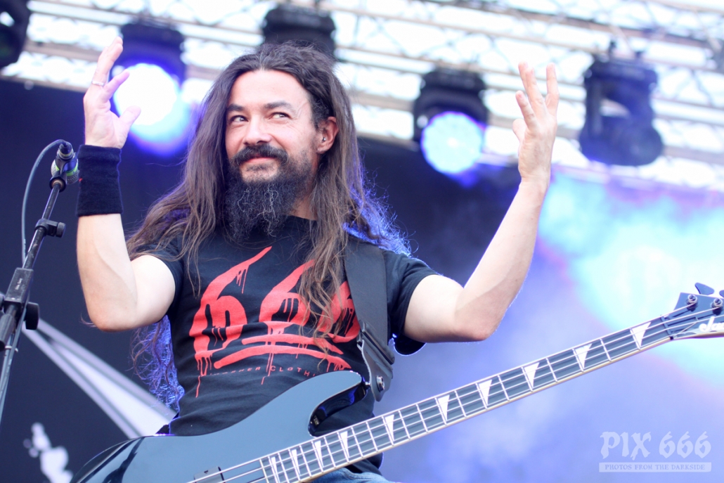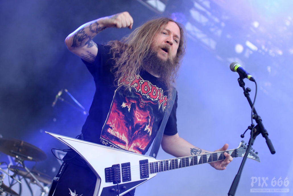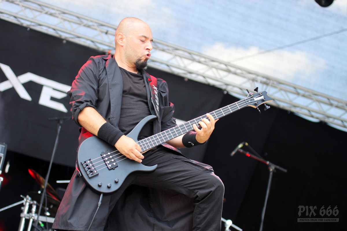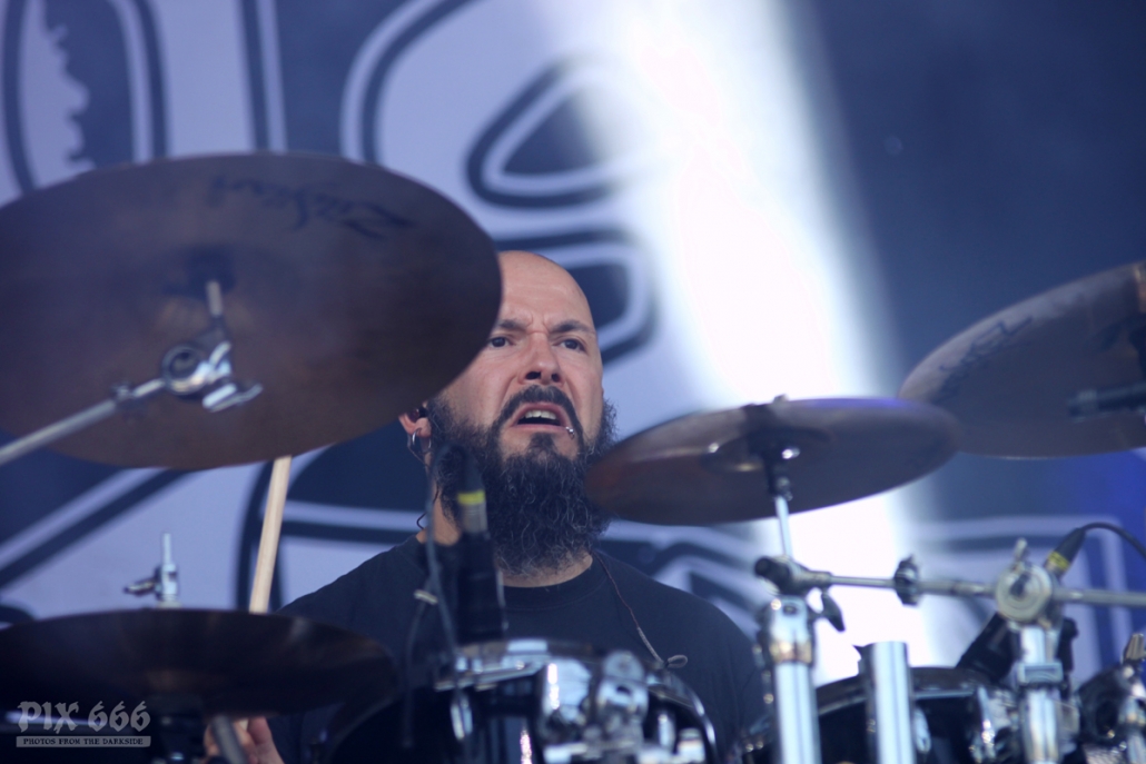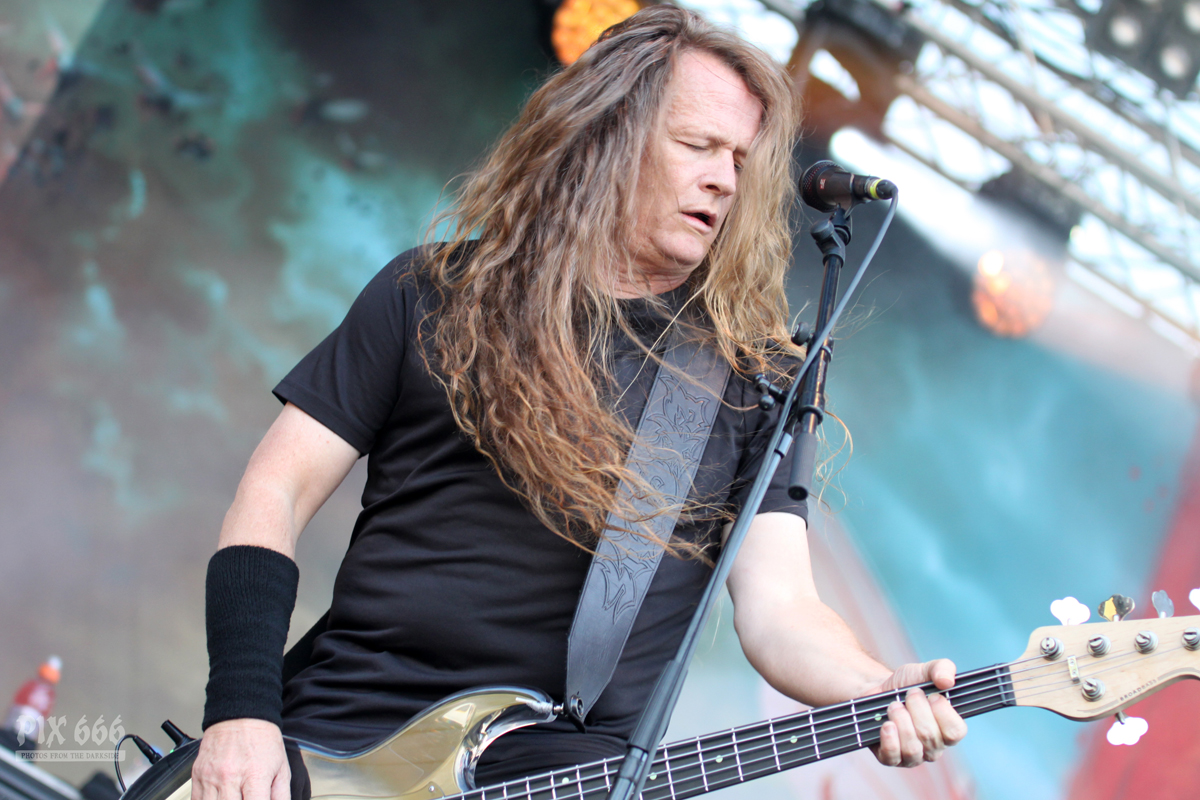 Exodus hatten ein ziemlich geiles Backdrop auf Bühnenbreite. Das Konzert startete mit dem neuen Song ‚The Beatings Will Continue‘, zu dem die Band letzten Sommer auch einen Videoclip veröffentlicht hat. Die Fans hatten während des Konzertes ziemlich oft die Hände in der Höhe – natürlich mit abgespreiztem kleinen Finger, sowie Zeigefinger – so muss das bei Metal… und mitgesungen wurde bei einigen Passagen auch lautstark. Dann gab es zwischen den Songs sogar Exodus Sprechchöre.