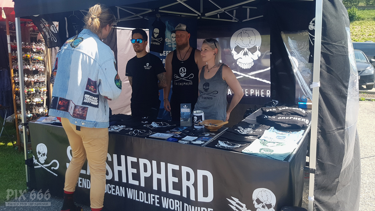 Am dritten Tag haben wir uns dann endlich mal Zeit genommen, die Stände, die etwa 100 Meter entfernt vom Festivalgelände aufgebaut waren, genauer unter die Lupe zu nehmen. Es gab einen CD und Vinyl-Stand mit üppiger Auswahl, dann nebenan Schmuck, Klamotten, sowie jede Menge coole Metal-Patches. Weiters gab es einen Stand der Meeresschutzorganisation Sea Shepherd, an dem die Mitarbeiter freundlich über ihre Aktivitäten Auskunft gaben – und sie hatten auch unglaublich schöne Shirts, Hoodies uvm. zu verkaufen. Ein Teil der Verkaufserlöse fließt in die internationalen Kampagnen der Organisation zum Schutz des Ozeans und seiner Bewohner. #ForTheOcean https://www.sea-shepherd.at/ – So begann unser Samstag gleich mal mit einer guten Tat.
