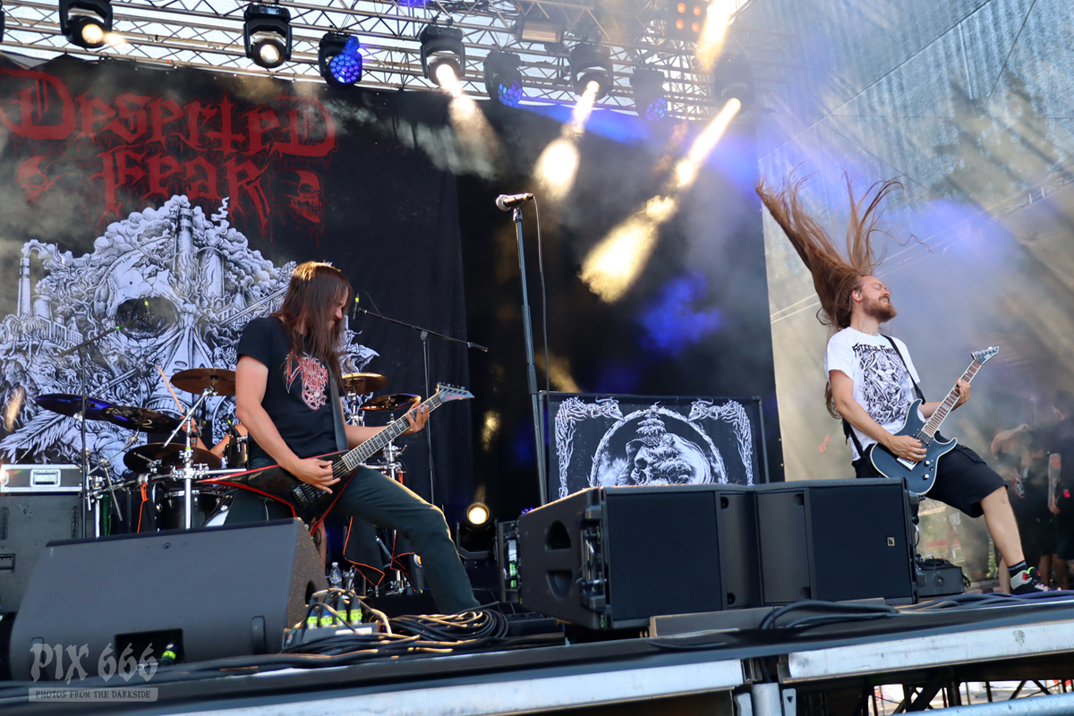 „Wir sind froh, mal wieder in Österreich zu spielen. Wir sind Deserted Fear aus Deutschland,“ sagte Gitarrist Fabian. In Anspielung auf die das tolle Festivalgelände fragte er dann. „Ist die Mauer aus Pappe oder ist das echt? – Respekt, schöne Location.“