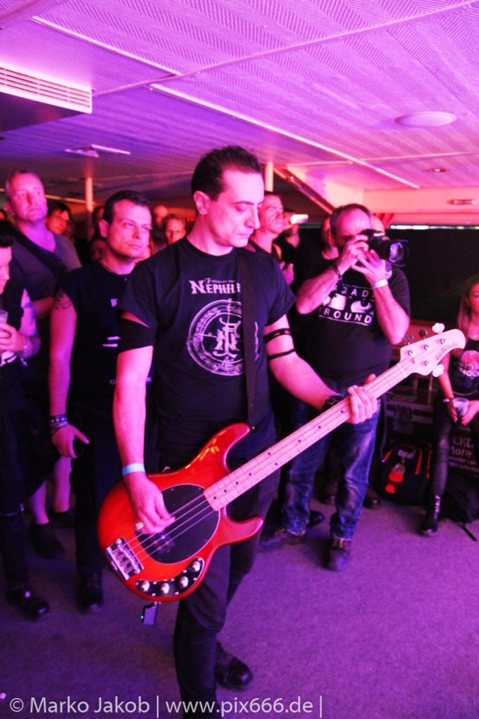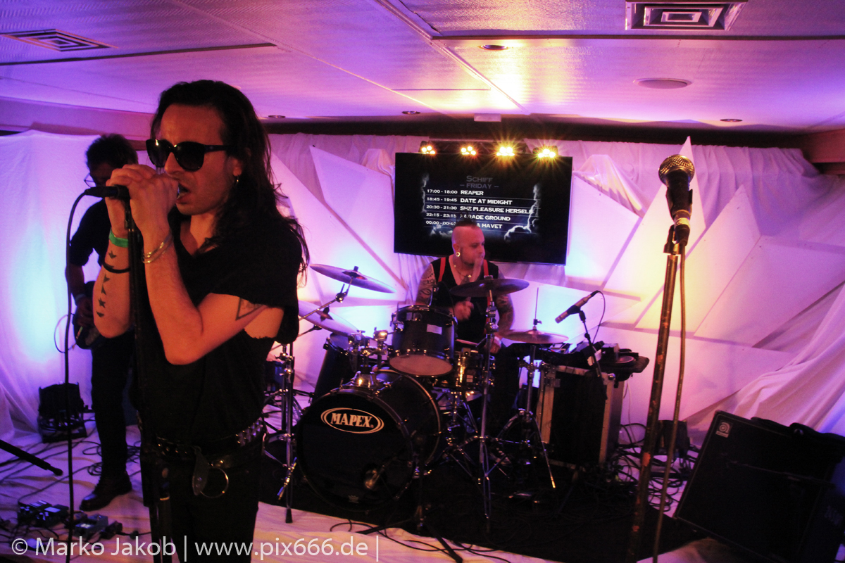 Date At Midnight vermischen perfekt Alternative, Gothic und Postpunk. Die Band wurde 2007 gegründet und veröffentlichte ein Jahr später die Debut EP ‚Date At Midnight‘. 2016 erschien das aktuelle Album ‚Songs To Fall And Forget‘. Diesen Monat wird die aktuelle EP ‚Reverse Resilience‘ erscheinen. Zur Überraschung für die Fans hatte die Band einige der neuen Songs mit nach Hameln gebracht und präsentierte diese Stücke erstmals live vor Publikum. Aber auch von den anderen Alben und EPs waren Titel im Programm, so zum Beispiel ‚A Story So Old‘ von ihrem Debut. Die Stimmung auf dem Konzertschiff war toll und die Nähe zu den Fans hatte was von einem Wohnzimmerkonzert. So kam es auch vor, dass Pasquale einige Male mitten ins Publikum ging und dort weiter an seinem Bass zupfte. Ein toller, atmosphärischer Sound, der Lust auf mehr macht, vor allem auf die neuen Songs der kommenden EP.