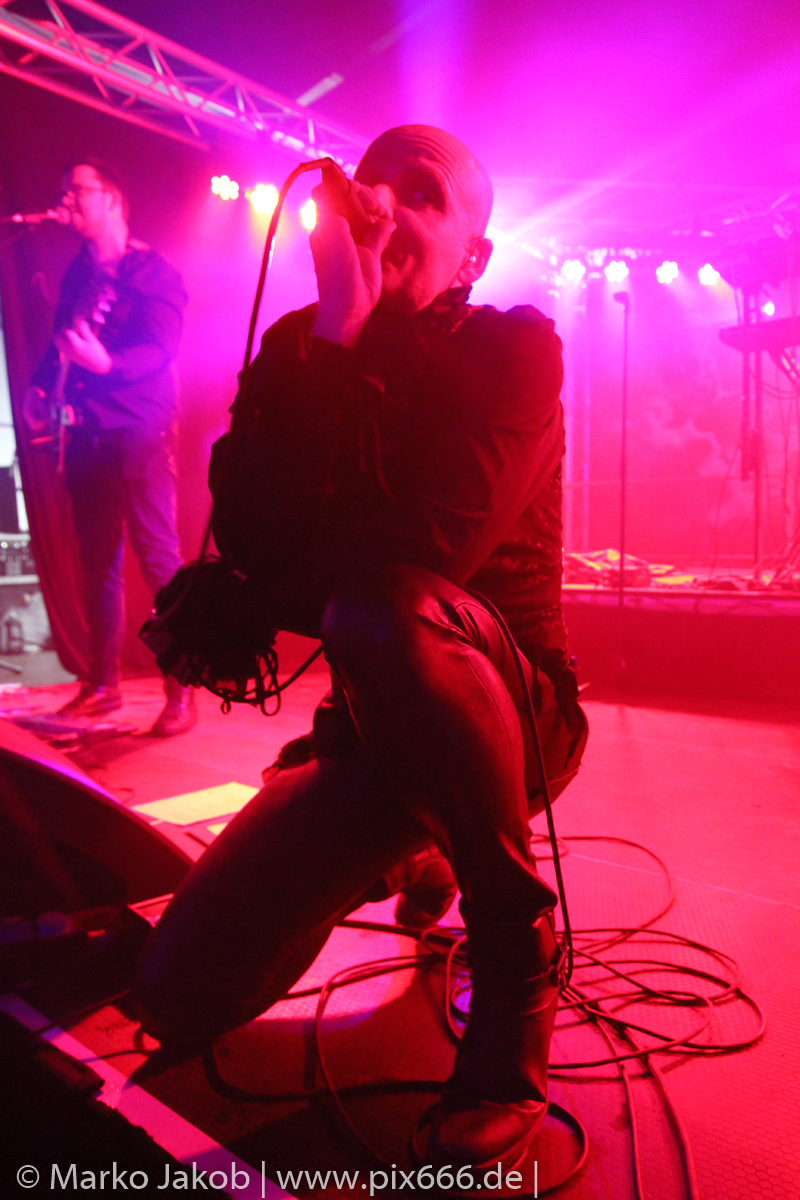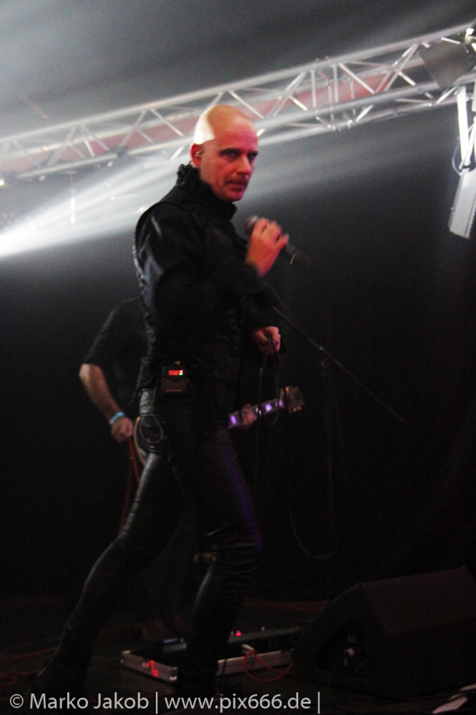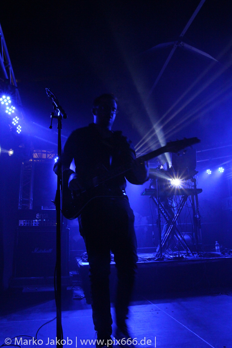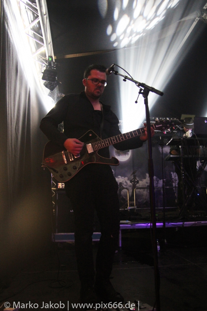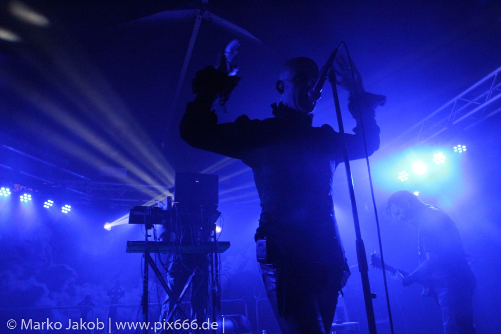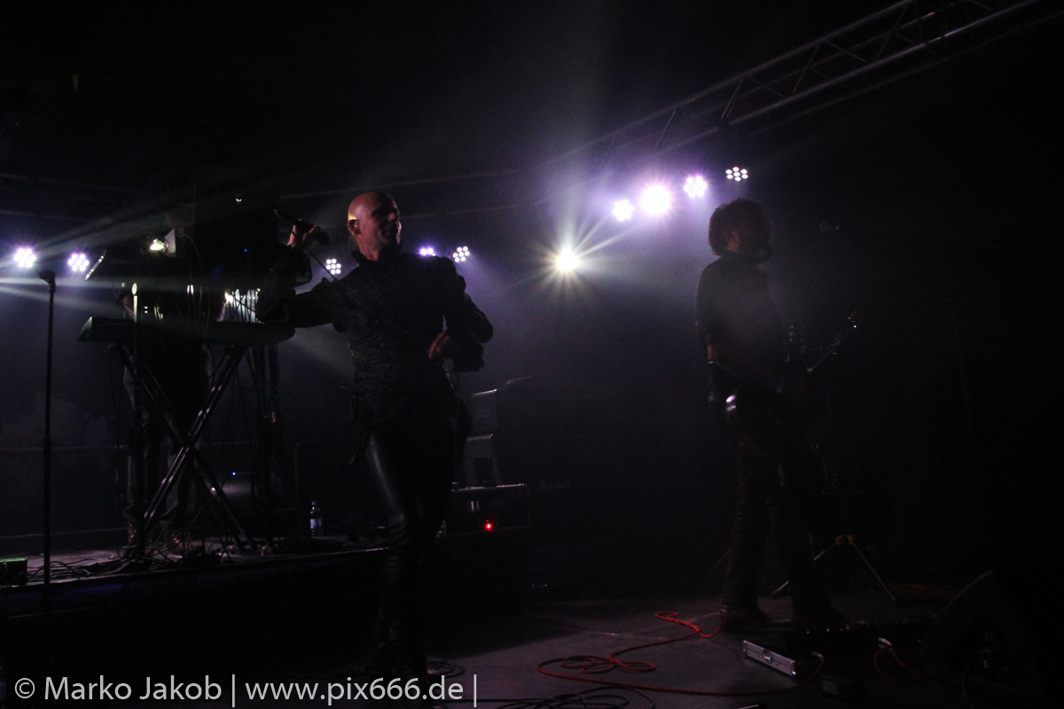 Die belgische Band The Arch wurde bereits 1986 gegründet. Sie haben inzwischen zahlreiche Alben veröffentlicht. Im August erschien ihre neue Single ‚Phantom Chase‘. Durch die gekonnte Kombination aus elektronischen Sounds und treibenden Wave Gitarren spricht diese Musik natürlich eine Vielzahl von Fans an. Die eingängige Musik animierte zahlreiche Besucher zum Dauertanzen. Bei einigen Songs, wie ‚Eyes Wide Open‘ vom Album ‚Fate‘ wurde sogar mitgesungen. Die Bühne war zumeist und blaues oder roten Licht gehüllt und relativ dunkel gehalten. Das passte perfekt zum Sound und erzeugte eine tolle Stimmung vom ersten bis zum letzten Ton.