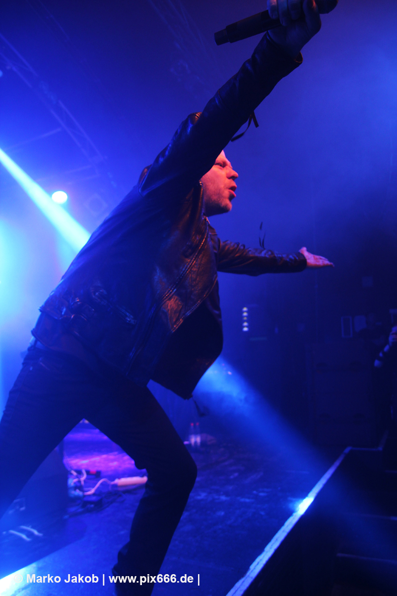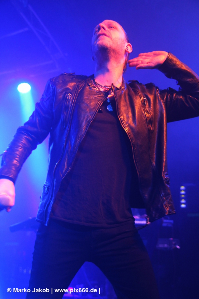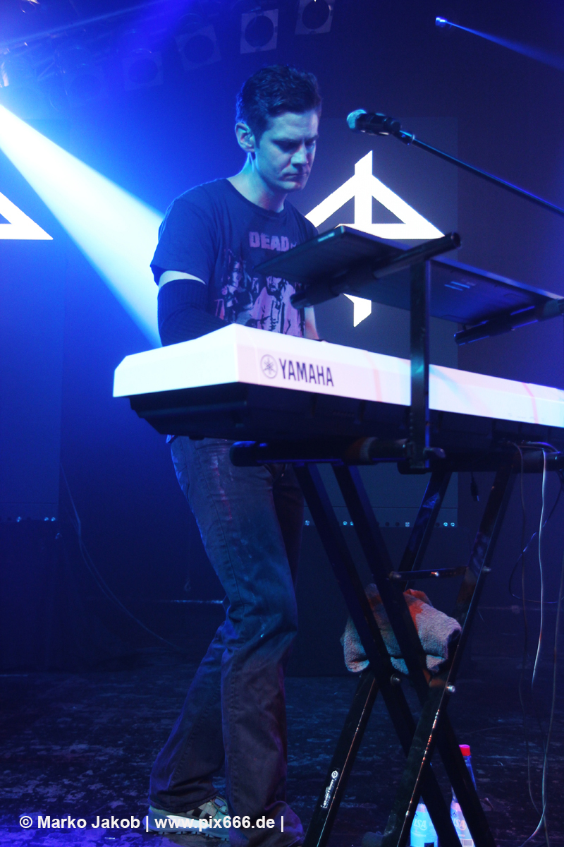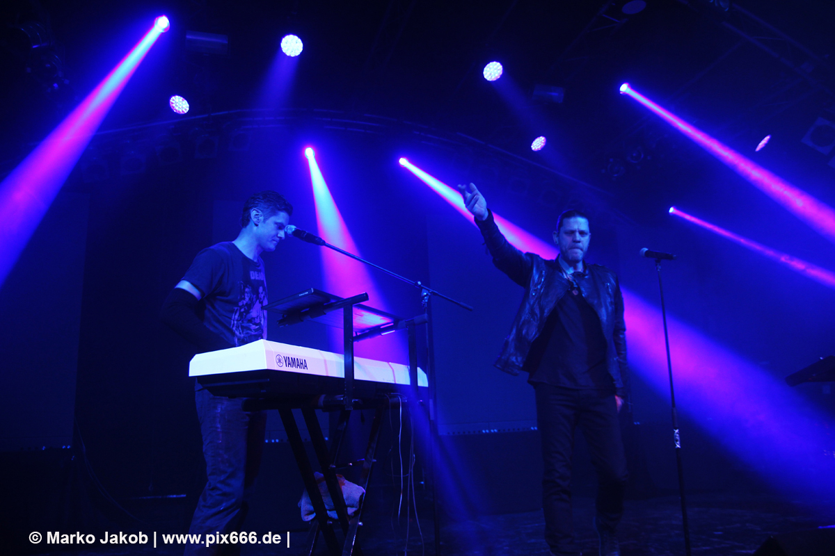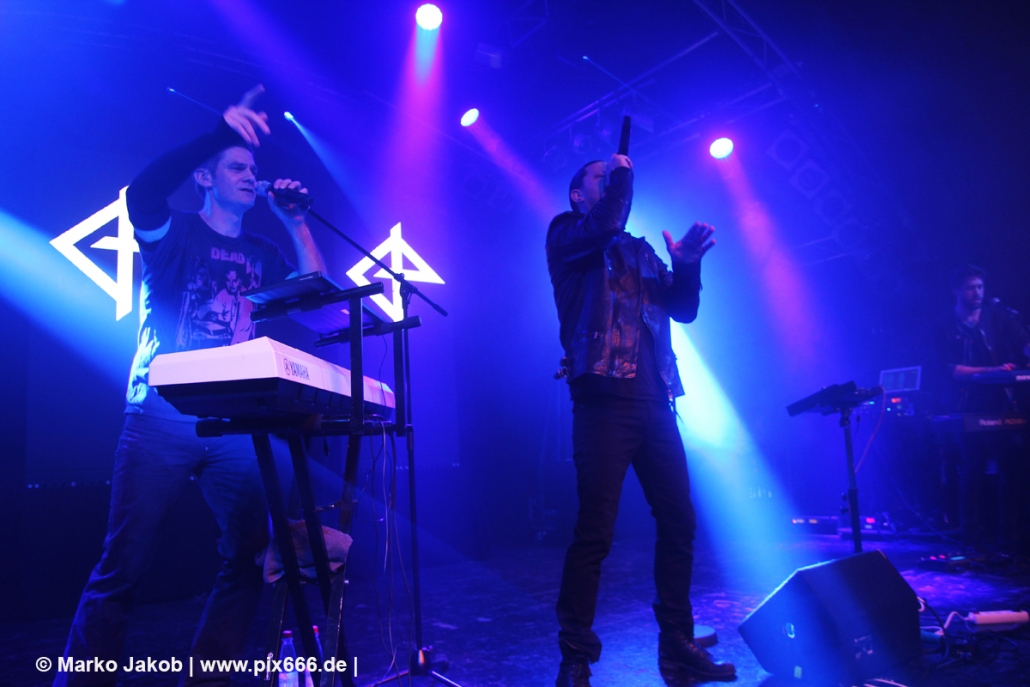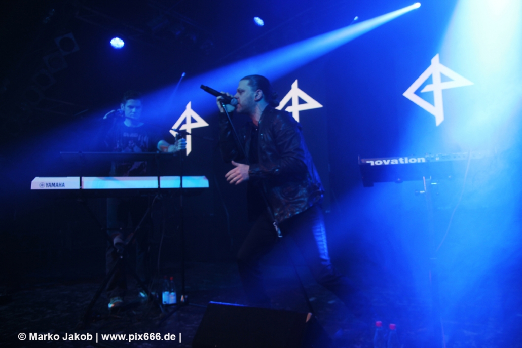 Nach 30 Minuten Pause ging es dann los. Das Konzert wurde von zwei Songs vom ‚Weapon Of Choice‘ Album eröffnet, ehe dann mit ‚Decipher Me‘ vom Album ‚Hell In Eden‘ der erste Diary Of Dreams Song erklang. Von Beginn an war mega Stimmung. Dann war Torben bei ‚Ignite‘ völlig in Ekstase – er konnte sich auch vorher hinter seinem Keyboard schon kaum zurückhalten, seinen Gefühlen freien Lauf zu lassen. Dann war Adrian wieder an der Reihe und die Hamburger Markthalle kochte schon zu Beginn des Konzertes. Nun wurde fast in der ganzen Markthalle getanzt, auch ganz hinten auf den Treppen. Das sah echt cool aus – ähnlich wie in einer riesigen Discothek. Dann mischte sich rhythmisches Klatschen unter die Musik. Die Videoprojektion auf vier Leinwänden, das Licht, der Nebel und die Musik – alles war eine perfekte Einheit. Nun richteten die Musiker einige Worte an die Fans: „Wir sind eine neue Band – ‚Coma Alliance‘ – und wir haben uns nicht erschossen – mit der Pistole vom Albumcover – und begrüßen euch, Hamburg, und haben noch neue Songs vom Debütalbum mit.“ Auf der vierteiligen Videowand waren jetzt die Buchstaben C O M A zu sehen. Der Auftritt war einfach nur toll, emotional und stimmungsvoll. Ein Fan nannte es sogar einen ‚musikalischen Orgasmus‘.