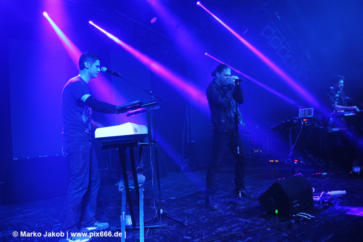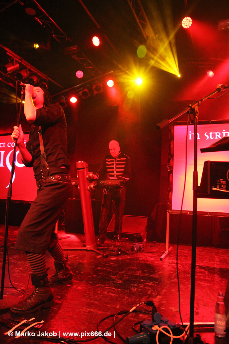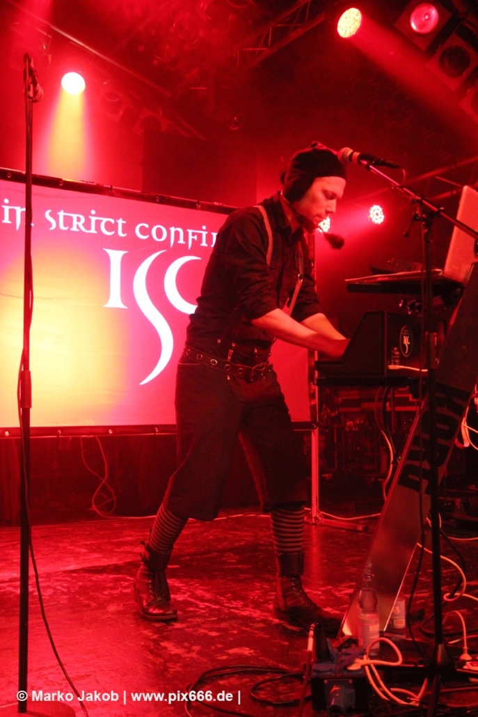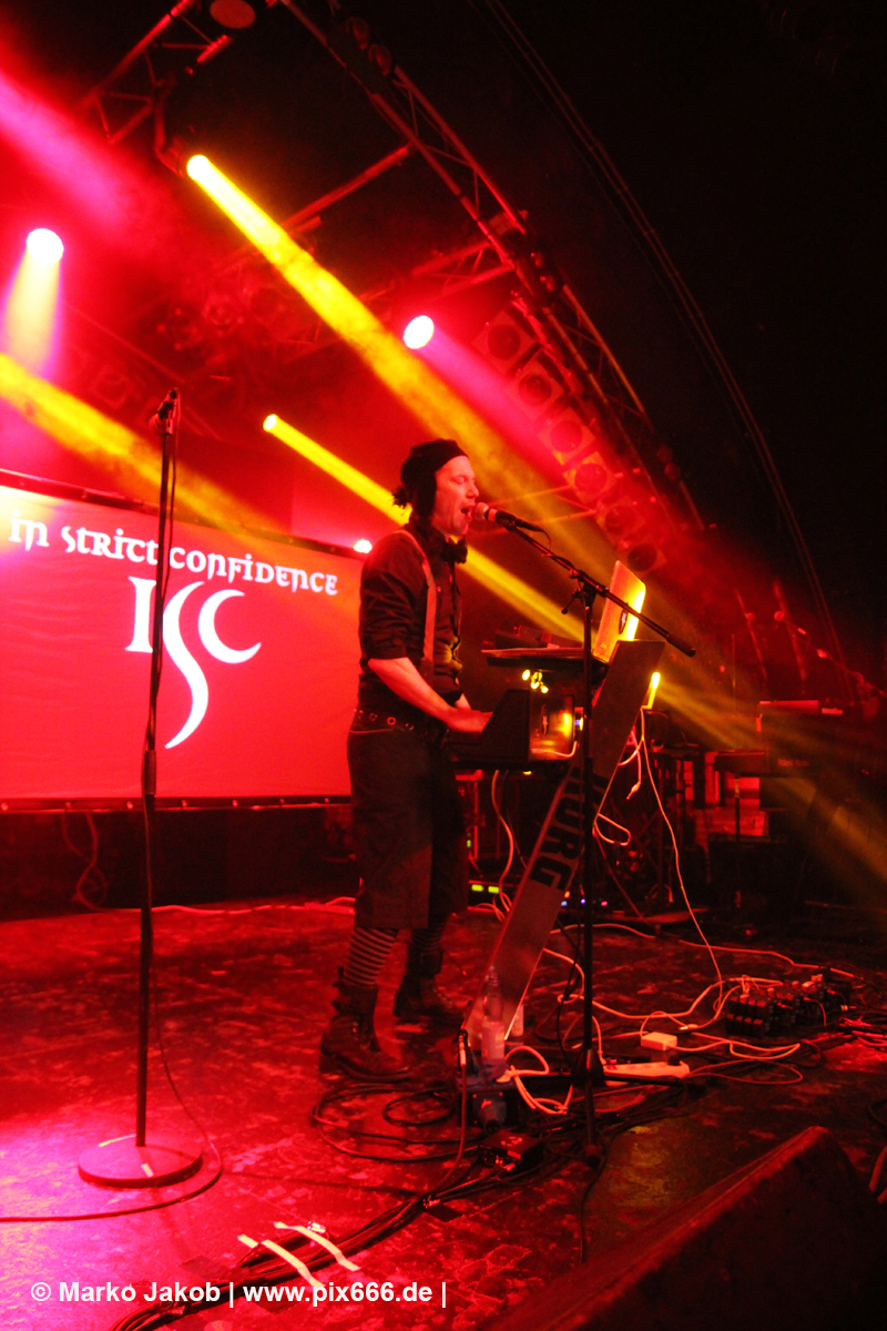 Um etwa 19.50 Uhr betrat die Band die Bühne. In Strict Confidence waren zu dritt in Hamburg. Ihre Performance wurde durch zwei Videowände optisch gut untermalt. Das Konzert begann mit dem Song ‚My Despair‘ aus dem Jahr 2009. Der Sound war toll und die Markthalle schon ganz gut gefüllt.