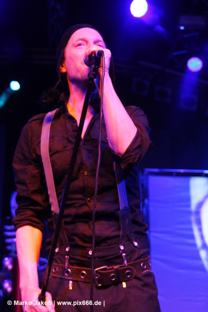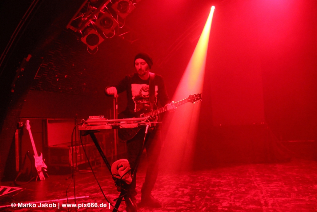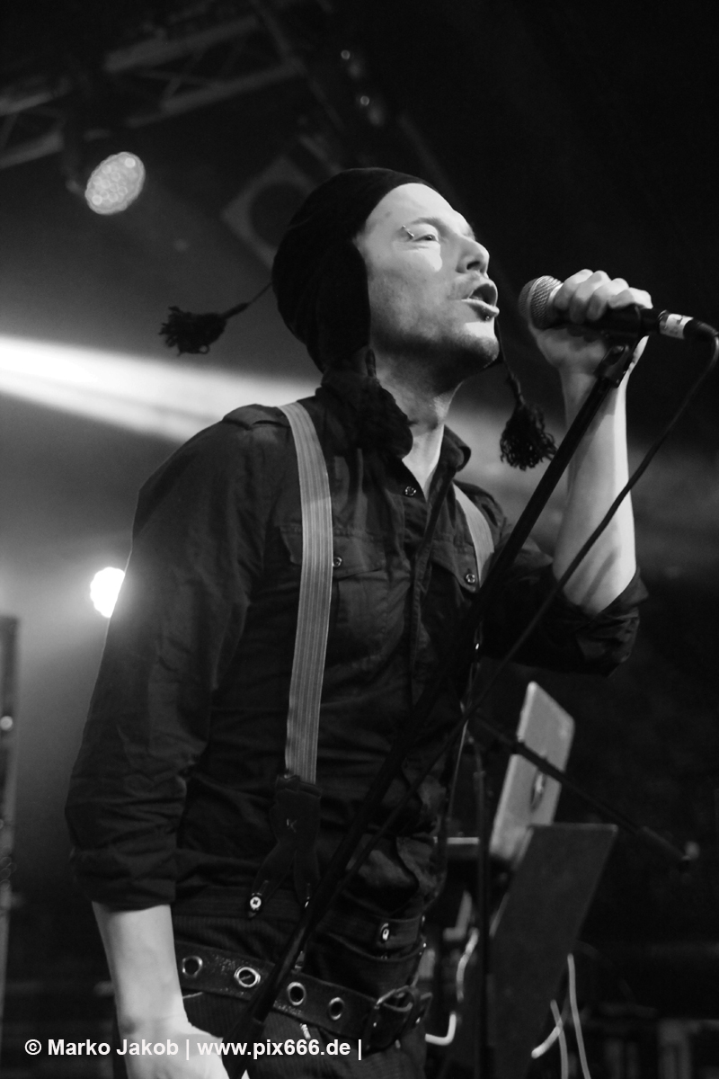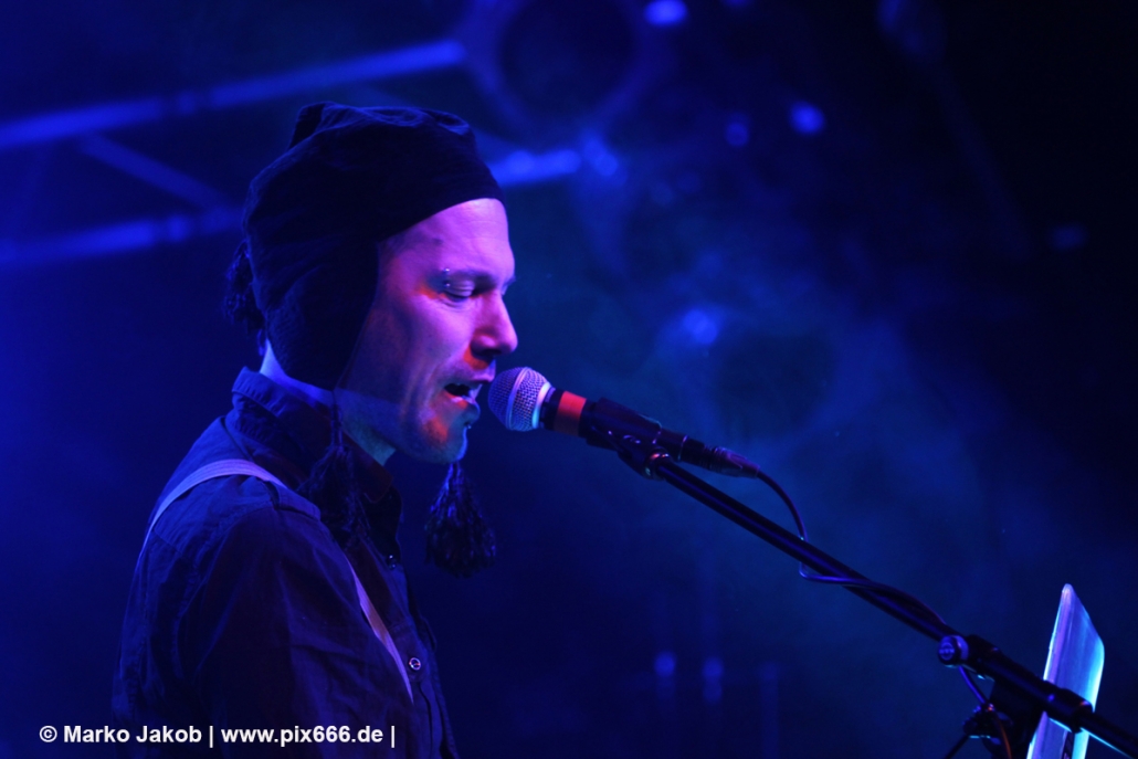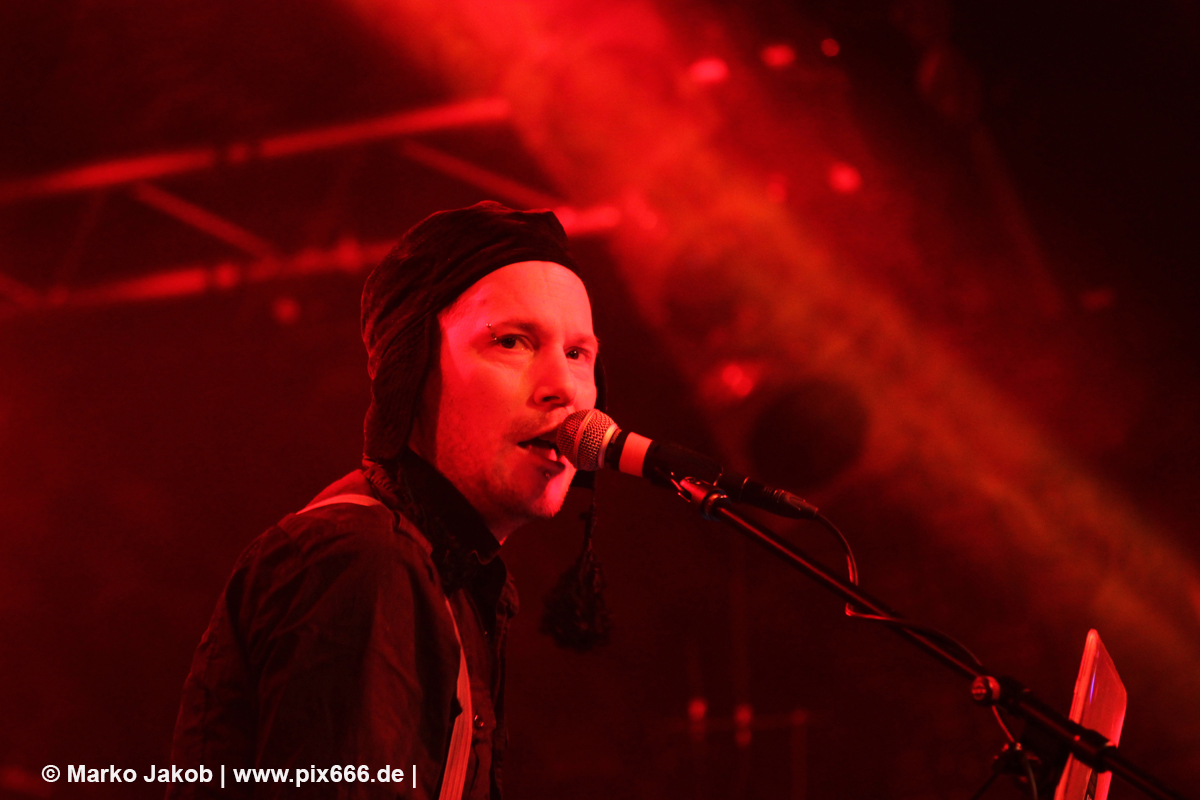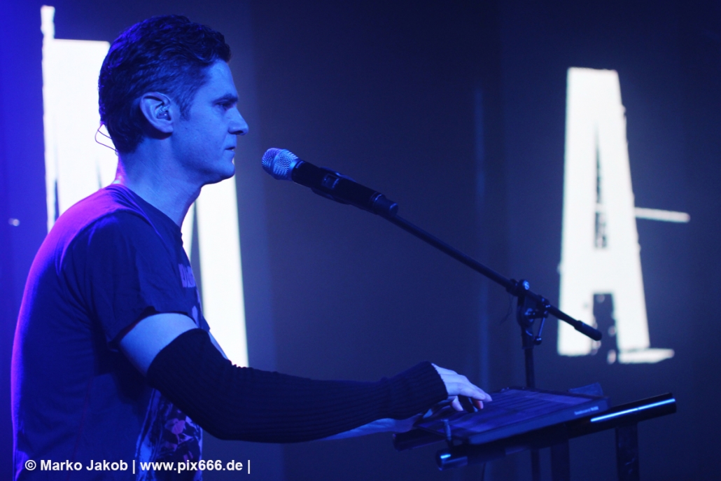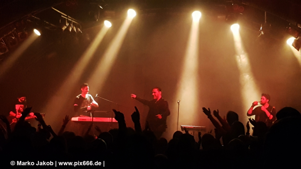 Wunderschöne sphärische Keys schallten dann bei ‚Son Of A Thief‘ durch die Halle. Adrian wurde beim Singen durch energische ‚So sick‘ -Schreie von Torben unterstützt. ‚Kein Mord‘ sangen dann beide im Duett. Bei ‚Miracle‘, färbte sich alles in ein tolles, rotes Licht. Später lagen sich die beiden Sänger während eines Songs sogar in den Armen – man merkte wieviel Spaß sie hatten. Bei ‚Butterfly Dance‘ klatsche das ganze Publikum im Takt mit – das sah wundervoll aus. ‚Child of Entertainment‘ wurde dann wieder im Duett gesungen. Es wurde immer wärmer in der der Markthalle. Nach dem sich die Band von den Hamburgern verabschiedet hatte, stampften alle mit den Füßen auf dem Boden und schrien nach einer Zugabe. Nach kurzer Zeit ging es mit ‚HLA‘ – einem Diorama Song – weiter. Danach sagte Adrian: „ich hab‘ auch noch einen“. Auch vor der nächsten Zugabe stampften die Leute auf den Boden -dieses Mal noch lauter und energischer als zuvor – bis die Band erneut zurückkam. Es folgten drei weitere Songs – am Ende sang das Publikum ganz alleine den Refrain von ‚Traumtänzer‘.