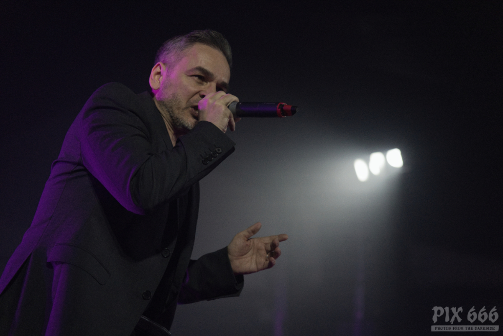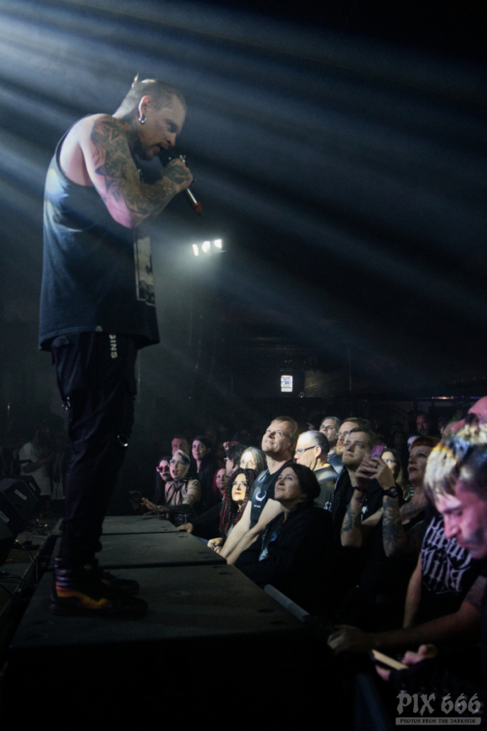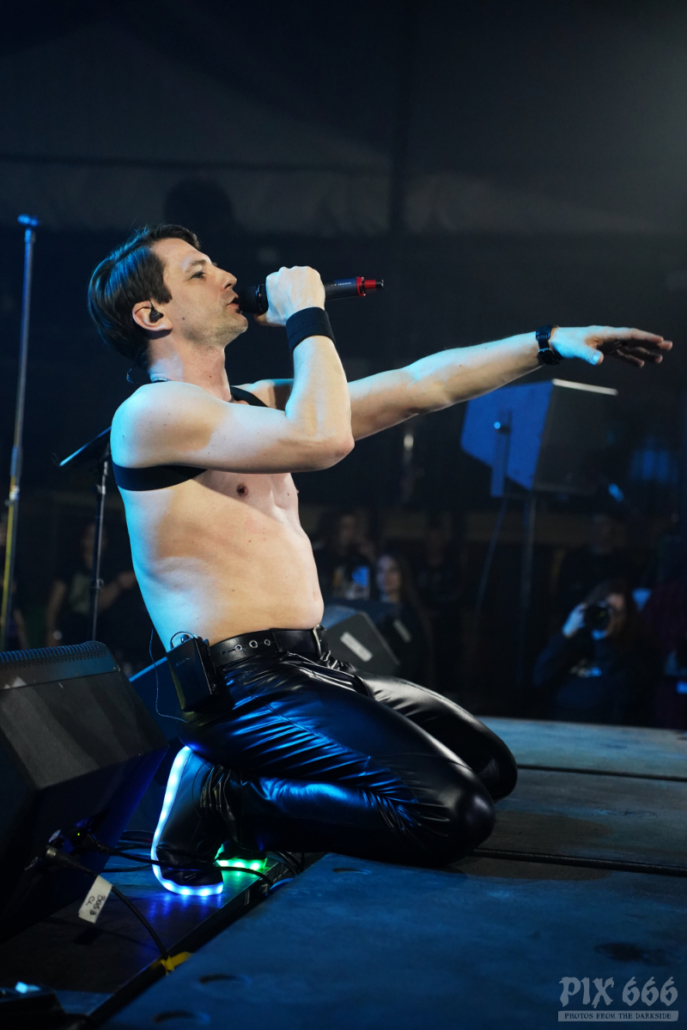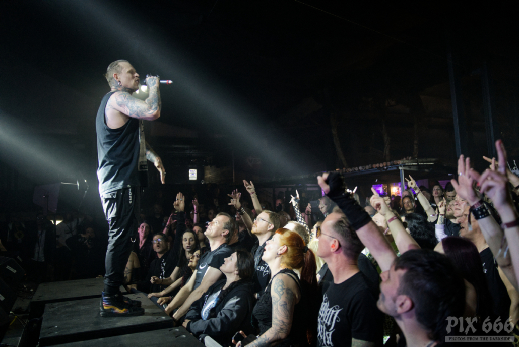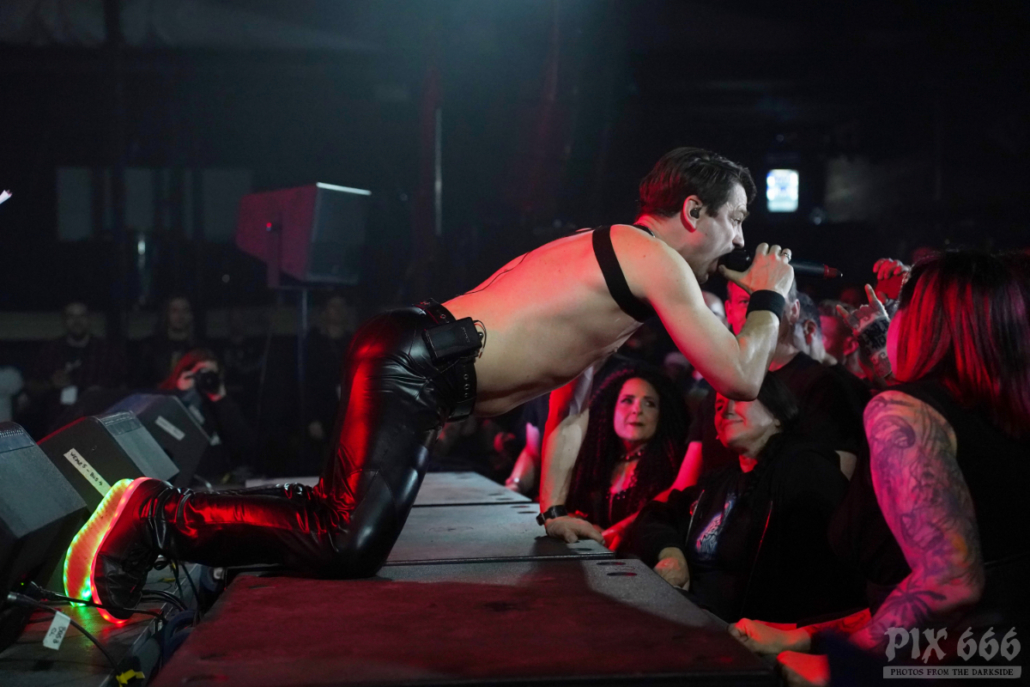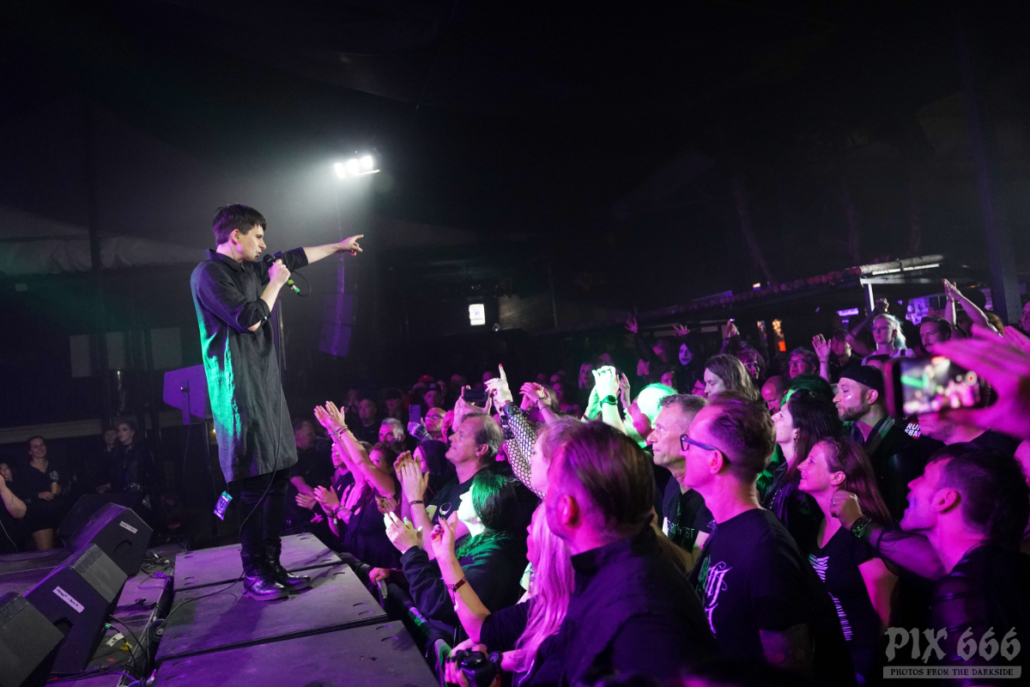 Auftritte von Icon Of Coil sind in den letzten Jahren zu einer Seltenheit geworden – die Priorität von Andy LaPlegua liegt dann wohl doch eher bei seiner anderen Band Combichrist. Deshalb kann man davon ausgehen, dass viele im Publikum zum ersten Mal eine Show von Andy’s Future Pop Projekt live gesehen haben. Die Fans kamen heute nicht zum Ausruhen – weiter ging es mit Tanzen – angeheizt vom norwegischen Frontmann und von den stampfenden Beats der Songs, wie zum Beispiel ‚Regret‘ aus dem Jahr 2000. Lederjacke aus und weiter ging es wie ein Wiesel über die Bühne. Die Uhr zeigte inzwischen kurz vor Mitternacht und das Dark Malta Publikum war einfach nicht müde zu bekommen, trotz der ununterbrochenen, schweißtreibenden Tanzeinlagen. Auch auf der Bühne wurde es scheinbar immer heißer – nun musste auch noch die fast bodenlange Kapuzenjacke weichen und weiter ging es im ärmellosen Shirt. „Habt ihr eine gute Zeit?“ fragte Andy nur wenige Zentimeter von den Fans entfernt. Ohja, definitiv hatten alle in der Location einen tollen Abend, der nun mit dem Song ‚Dead Enough For Life‘ gekrönt wurde – was für eine tolle Stimmung – fast jeder im Gianpula Mainroom hat gemeinsam mit Andy diesen Hit mitgesungen.
