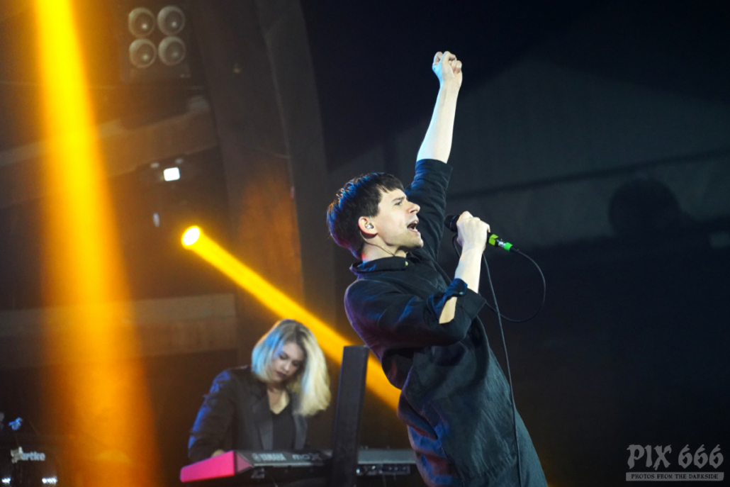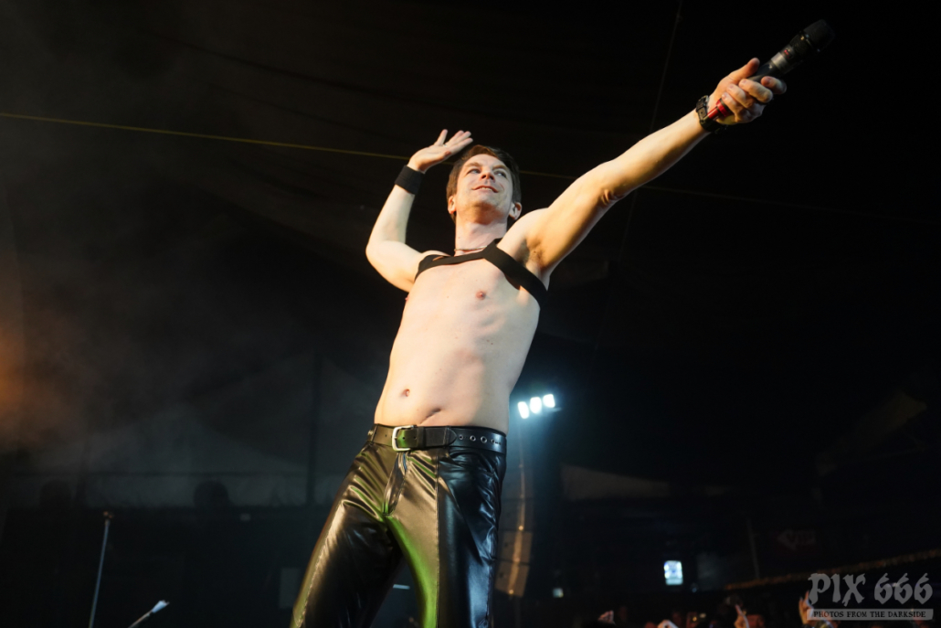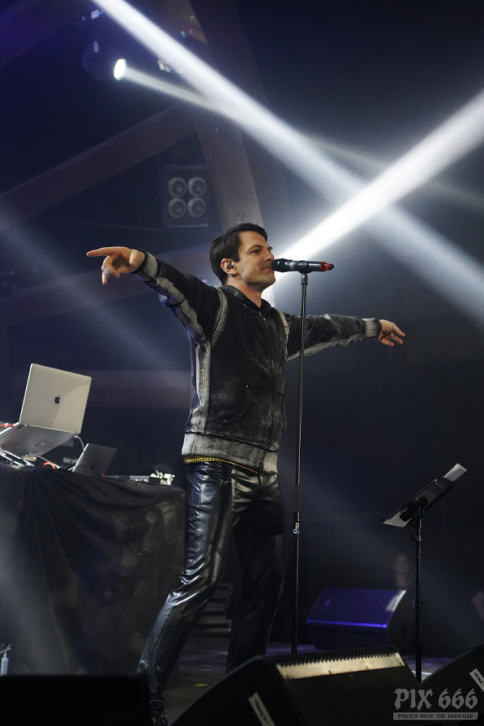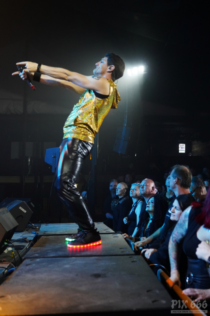 Elektrisch und tanzbar ging es weiter, aber eine ganze Spur ruhiger als zuvor. Feinster Synthpop mit Frozen Plasma aus Deutschland war nun angesagt. Felix und Vasi haben auch als Duo eine extreme Bühnenpräsenz und animieren das Publikum spielerisch einfach zum Mitmachen. Vor allem der Sänger der Band gab hier 45 Minuten Vollgas. Mit seinen leuchtenden Schuhen wirbelte er über die Bühne und wirkte manchmal wie ein Animateur in einem Fitnessstudio. Nach ein paar Songs hieß es Jacke aus – die beiden Herren standen nun in goldenen Glitzershirts auf der Bühne. Die Setlist war mit einer guten Mischung an Frozen Plasma Hits vollgepackt. Auch eine Coverversion des Songs ‚Living on Video‘ wurde gespielt. Nun musste auch noch das Shirt weichen und es ging ‚oben ohne‘ weiter. Bei dem grandiosen Sound kam man sich vor wie in einer Livedisco – bei ‚Irony‘ hieß es dann ein letztes Mal Hände schwenken.