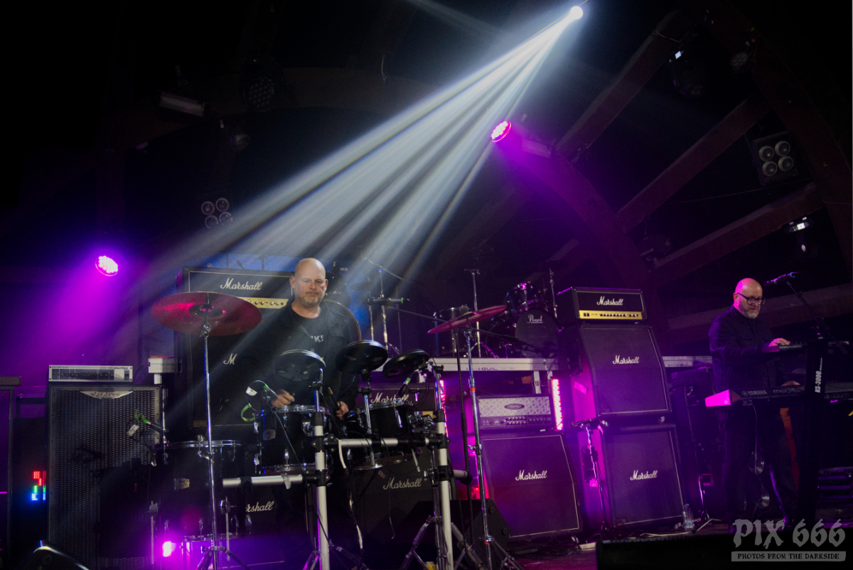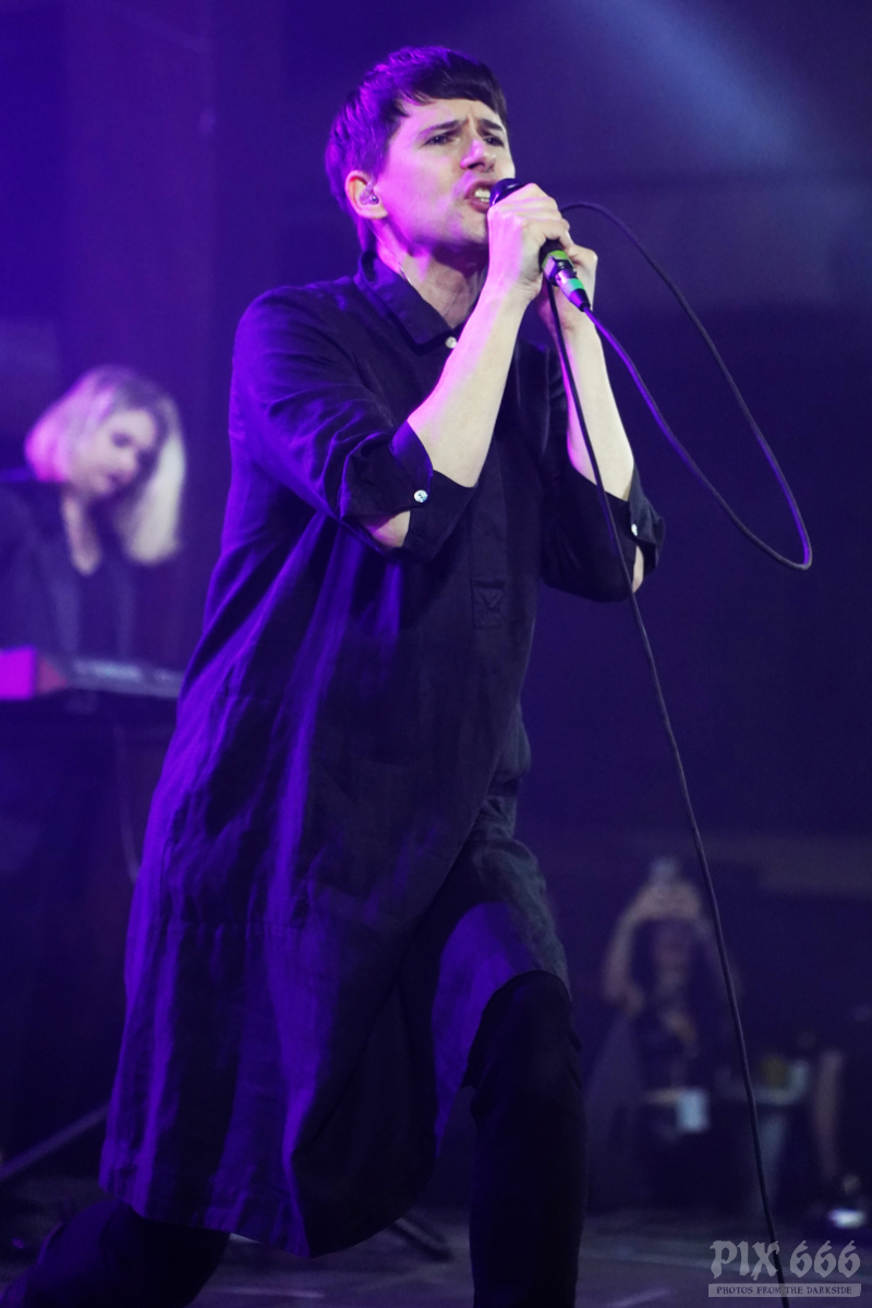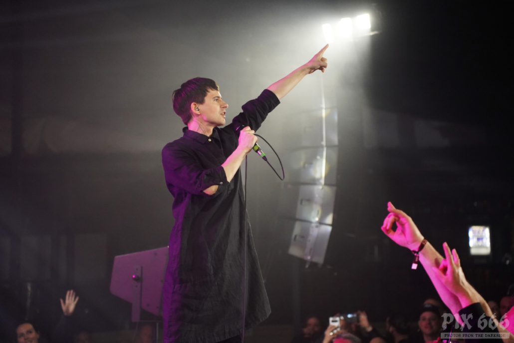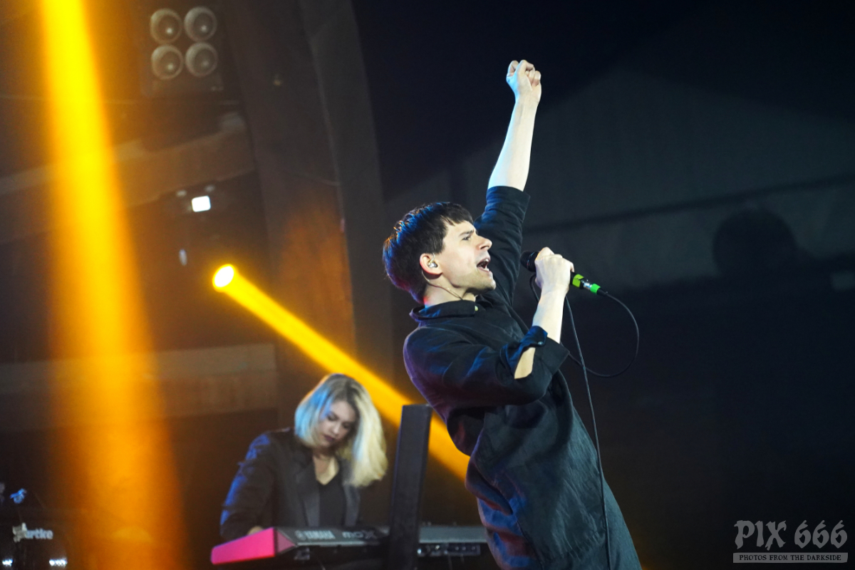 Elektrisch und tanzbar ging es weiter, aber eine ganze Spur ruhiger als zuvor. Feinster Synthpop mit Frozen Plasma aus Deutschland war nun angesagt. Felix und Vasi haben auch als Duo eine extreme Bühnenpräsenz und animieren das Publikum spielerisch einfach zum Mitmachen. Vor allem der Sänger der Band gab hier 45 Minuten Vollgas. Mit seinen leuchtenden Schuhen wirbelte er über die Bühne und wirkte manchmal wie ein Animateur in einem Fitnessstudio. Nach ein paar Songs hieß es Jacke aus – die beiden Herren standen nun in goldenen Glitzershirts auf der Bühne. Die Setlist war mit einer guten Mischung an Frozen Plasma Hits vollgepackt. Auch eine Coverversion des Songs ‚Living on Video‘ wurde gespielt. Nun musste auch noch das Shirt weichen und es ging ‚oben ohne‘ weiter. Bei dem grandiosen Sound kam man sich vor wie in einer Livedisco – bei ‚Irony‘ hieß es dann ein letztes Mal Hände schwenken.