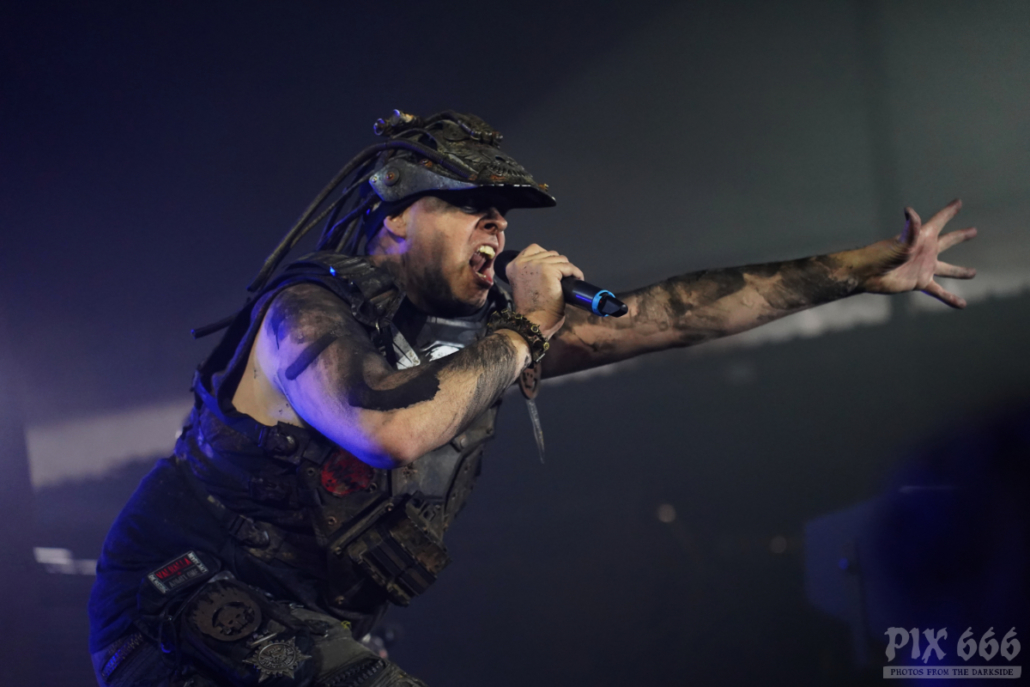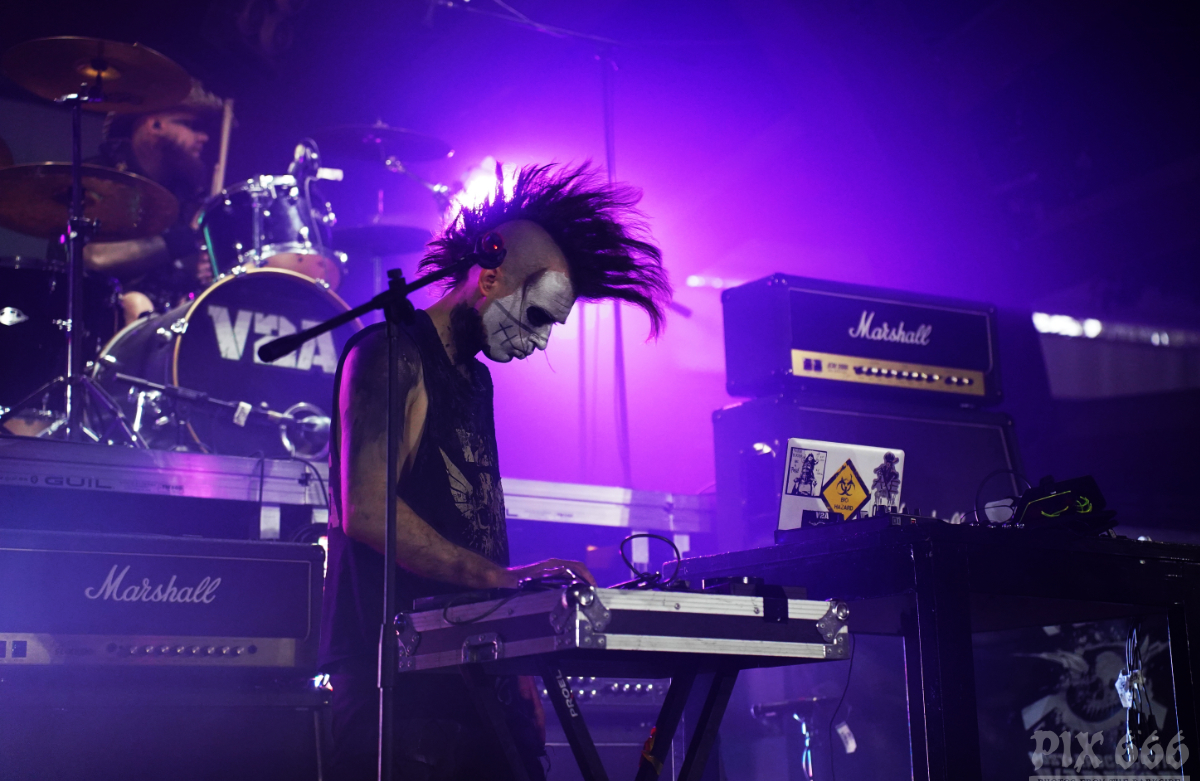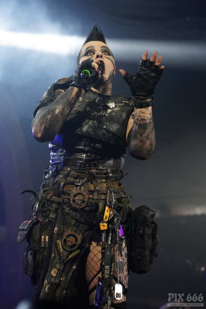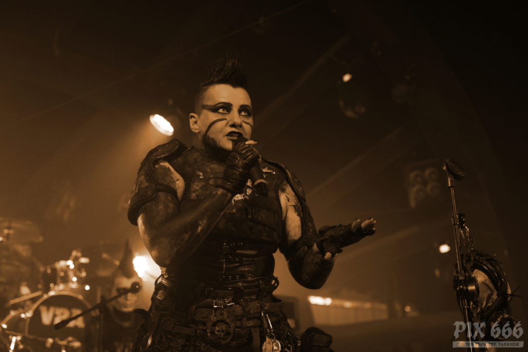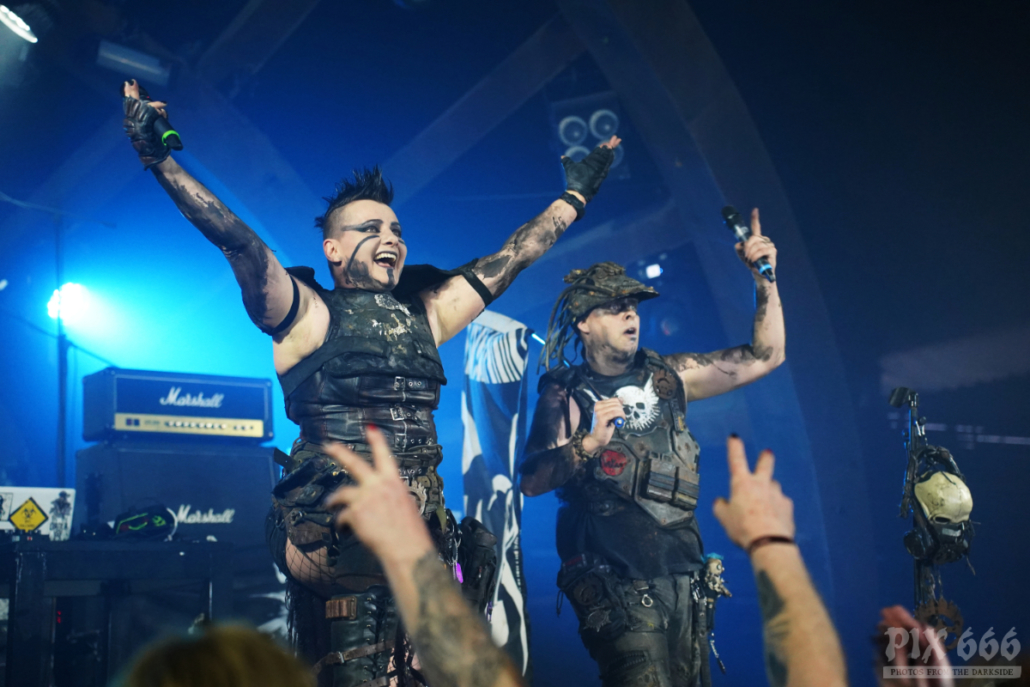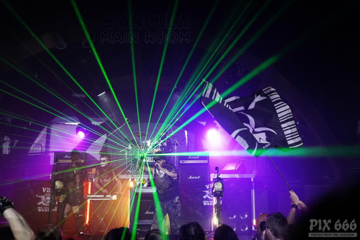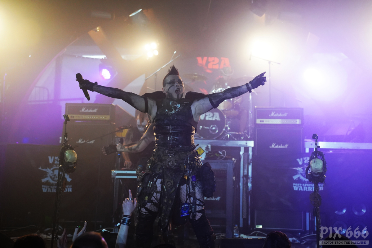Die 2001 gegründete Band V2A verwandelte den Gianpula Mainroom in einen Tanzpalast. Die Industrialband mit den coolen apocalyptischen Outfits riss das Publikum mit ihrer Energie und Ausstrahlung förmlich mit. Dann durften die Fans auch mal gemeinsam mit der Band die mitgebrachten Flaggen schwenken. Das Publikum wurde auch im weiteren Verlauf der Show gut mit einbezogen – jetzt wurde die komplette erste Reihe mit einem Silberspray im Gesicht eingesprüht – das sah wirklich cool aus und hat eine Portion Extra-Spaß erzeugt. Die Band war offensichtlich total happy, dass sie Teil des Dark Malta Festivals sein durfte. Es folgte Song auf Song und die Tänzer waren immer noch nicht müde. Besonders gut bei den Fans kam die Coverversion des Shock Therapy Klassikers ‚Hate Is a 4-Letter Word‘ an. Am Ende der Show blieb auch Dark Malta Host Eric13 nicht von einer Ladung Spray verschont.