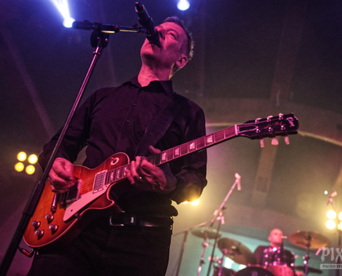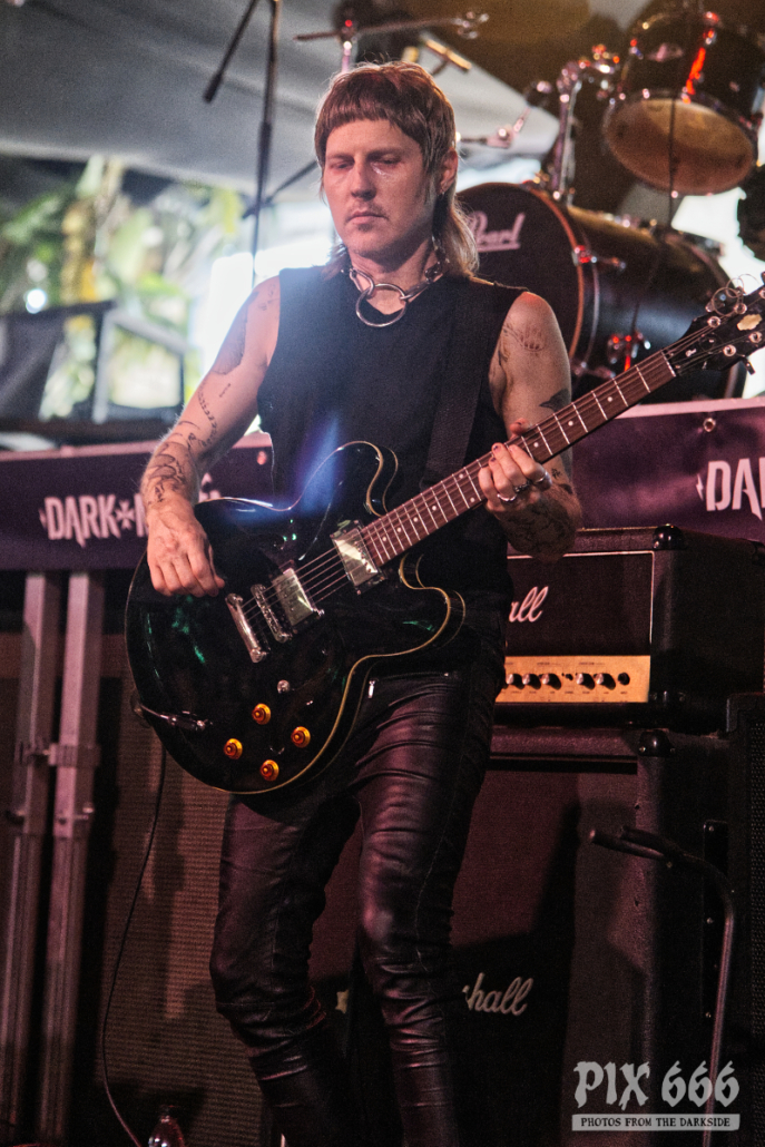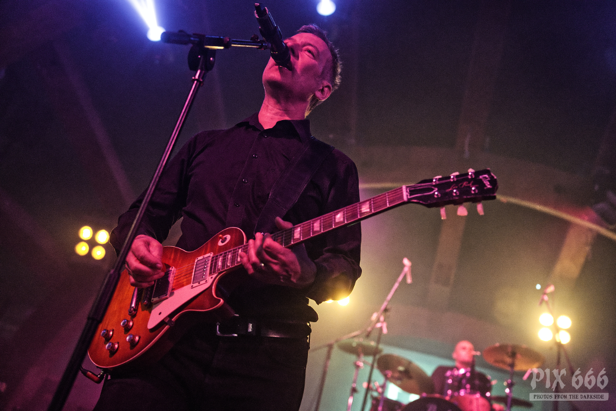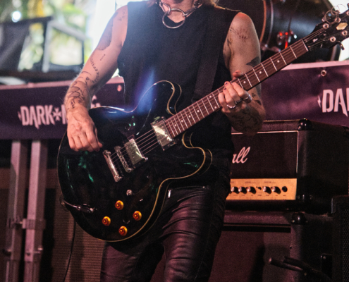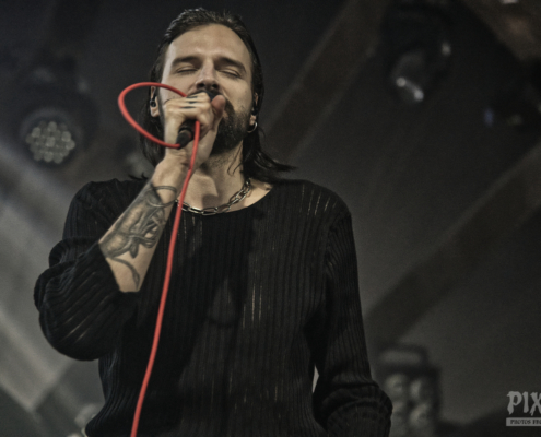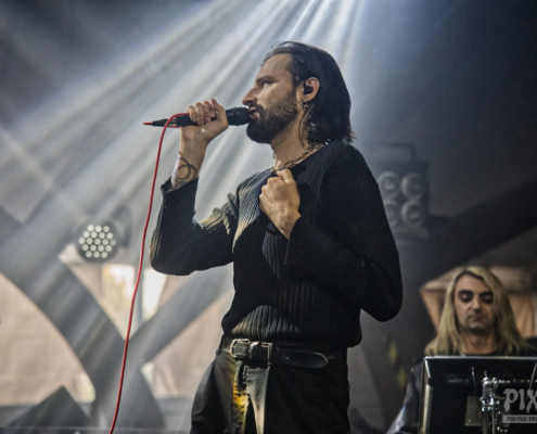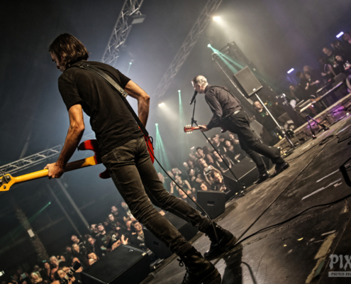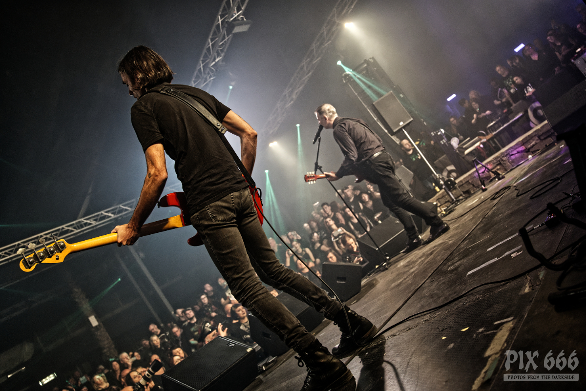 Nun war wieder Gitarrenzeit – Zeit für Pink Turns Blue. Die legendäre deutsche Rock/Dark Wave Band entführte das Publikum mit ihren wunderschönen Soundharmonien auf eine Reise durch ihre Welt. Mit dem Opener vom aktuellen Album ‚Tainted‘ ging es los. ‚Not Even Trying‘ ist geprägt von geschmeidigen Gitarrenklängen, die eine Wohltat für die schon strapazierten Ohren waren. Die neueren Songs der Band, wie auch ‚ So Why Not Save The World‘ fügten sich nahtlos in das gesamte Konzept ein. Die Bewegungen im Publikum wurden dann bei ‚Walking On Both Sides‘ schneller und schneller – ein toller, flotter Wave-Song. Schöne gelbe Laserstrahler beleuchteten das Publikum und sorgten für eine wunderschöne, melancholische Stimmung. Natürlich ging es bei weitem nicht so wild zu, wie zuvor bei der Aggrotech-Band, aber trotzdem spürte man eine sehr angenehme Energie unter den Festivalbesuchern. Pink Turns Blue verzauberten das Publikum mit ihrer einzigartigen Klangwelt und zog es in ihren Bann. Mit ihrem zeitlosen Sound und ihrer beeindruckenden Bühnenpräsenz bewiesen Pink Turns Blue einmal mehr, warum sie zu den Größen der Rock- und Dark Wave-Szene gehören. Ihr Auftritt hinterließ einen bleibenden Eindruck und hatte mit ‚Your Master is Calling‘ aus dem Jahr 1988 noch ein großes Highlight in der Hinterhand – dieser Song hat inzwischen schon 4.2 Mio YouTube Aufrufe. Der Gianpula Main Room war nun in blaues Laserlicht gehüllt und das Publikum verabschiedete die Band mit einem verdienten, großen Applaus.