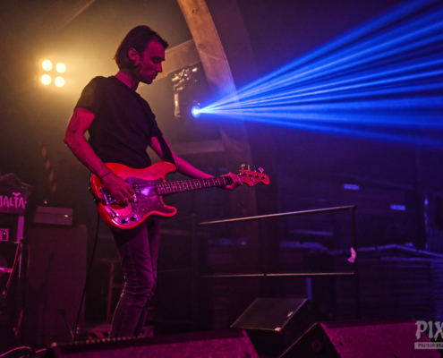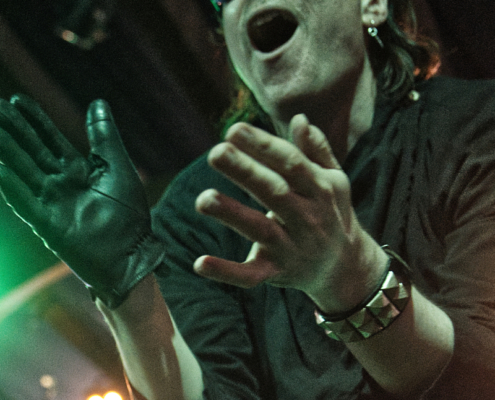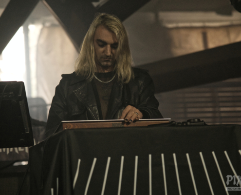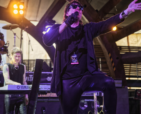 Als nächstes war Showtime für die 2019 gegründete Coldwave Band Ultra Sunn. Super unterhaltsam. Die gut aufgelegte Band, die aus Sam und Gaelle besteht, hatte für die Liveshow noch einen zusätzlichen Keyboarder dabei. Sam’s starke, angenehme Stimme und die tanzbaren Sounds lockten nun wieder mehr Musikfans in die Location. Inzwischen war es wieder richtig voll, die Pool Party im Außenbereich war beendet – nun hatten also alle wieder die volle Konzentration auf die Konzertlocation. Mit einem „Thank you“ bedankte sich der Sänger für den riesigen und lautstarken Applaus. Alle, die schon seit Stunden bei der Poolparty das Tanzbein geschwungen hatten, machten nun zum Sound der zwei Keyboards und des Drumcomputers einfach weiter. Schöne Stimmung jetzt bei ‚Shake your demons‘ und ‚Keep your eyes peeled‘. Schnell verging die Zeit beim Auftritt von Ultra Sunn und schon kündigte Sam den letzten Song an. „Danke, dass wir hier sein durften. Seid ihr bereit?“ hieß es vorm letzten Stück und die Fans klatschten, tanzten und sprangen nochmal um die Wette.