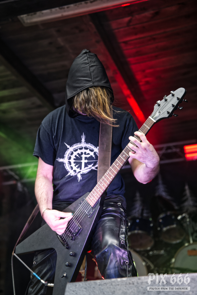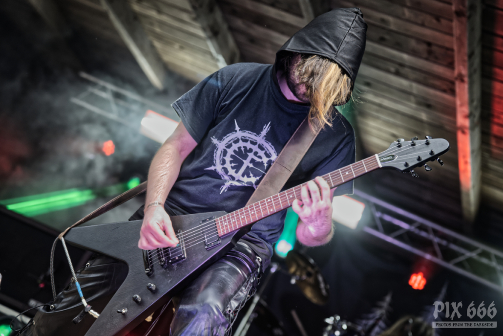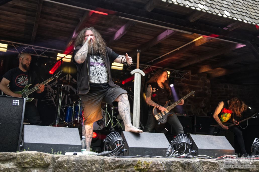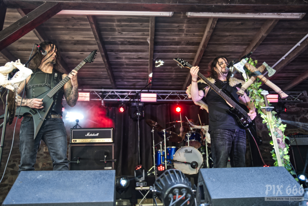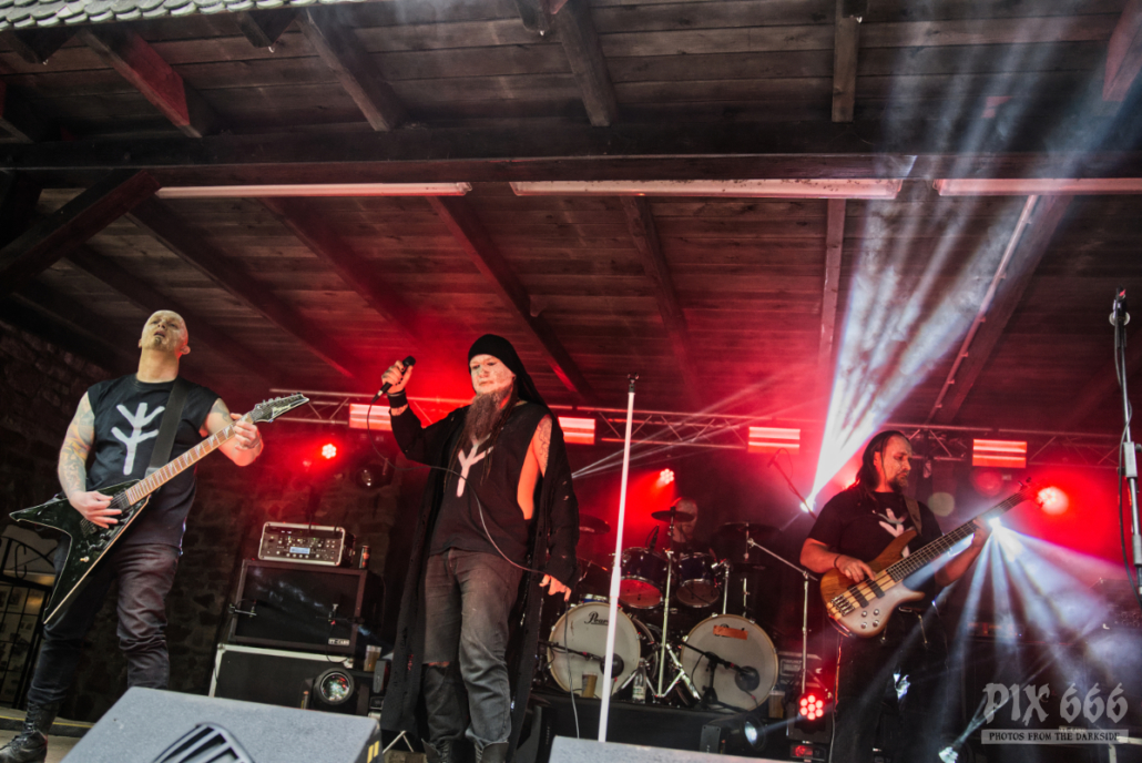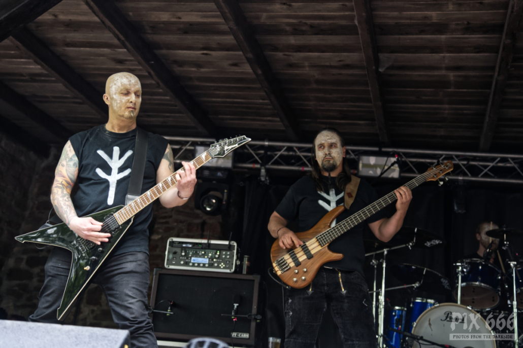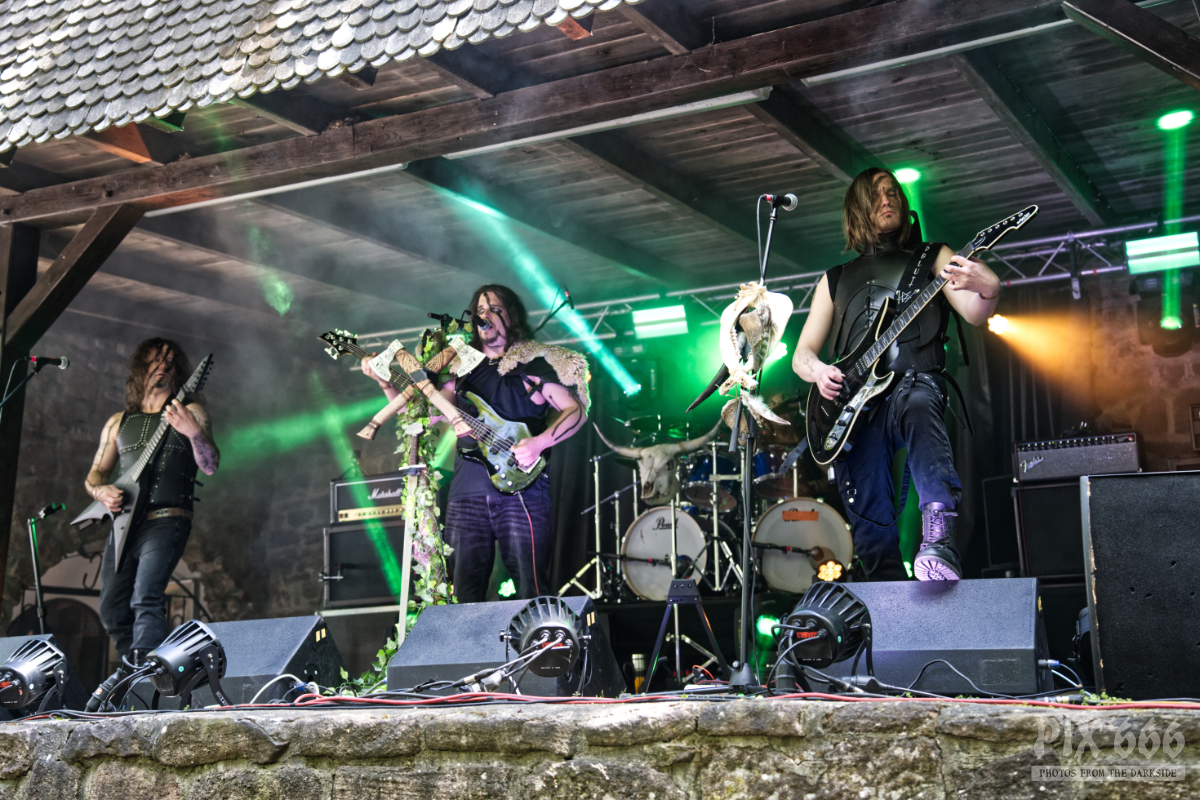 Die Band Nordblut aus Österreich wurde bereits vor über 10 Jahren gegründet. Nach einer sehr langen Pause wagte die Blackend Pagan Metal Band vor ein paar Jahren einen Neuanfang und veröffentlichte 2022 das Debutalbum ‚Av Liv og Kamp‘. „Wir sind froh das Dark Troll Festival eröffnen zu dürfen“. Bei strahlendem Sonnenschein hatte der Festivalopener schon fast die Hälfte der Besucher an die Bühne zwischen Burgruine und Burgmauern gelockt.