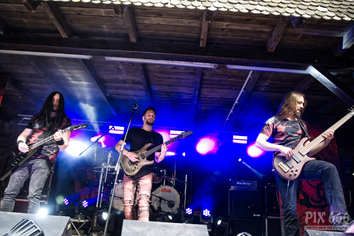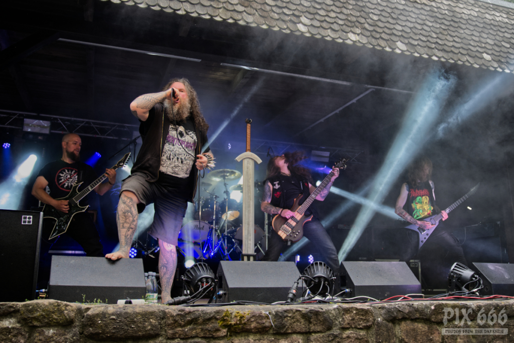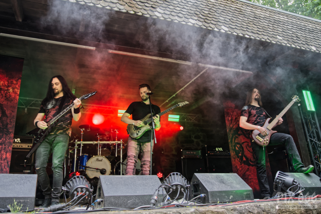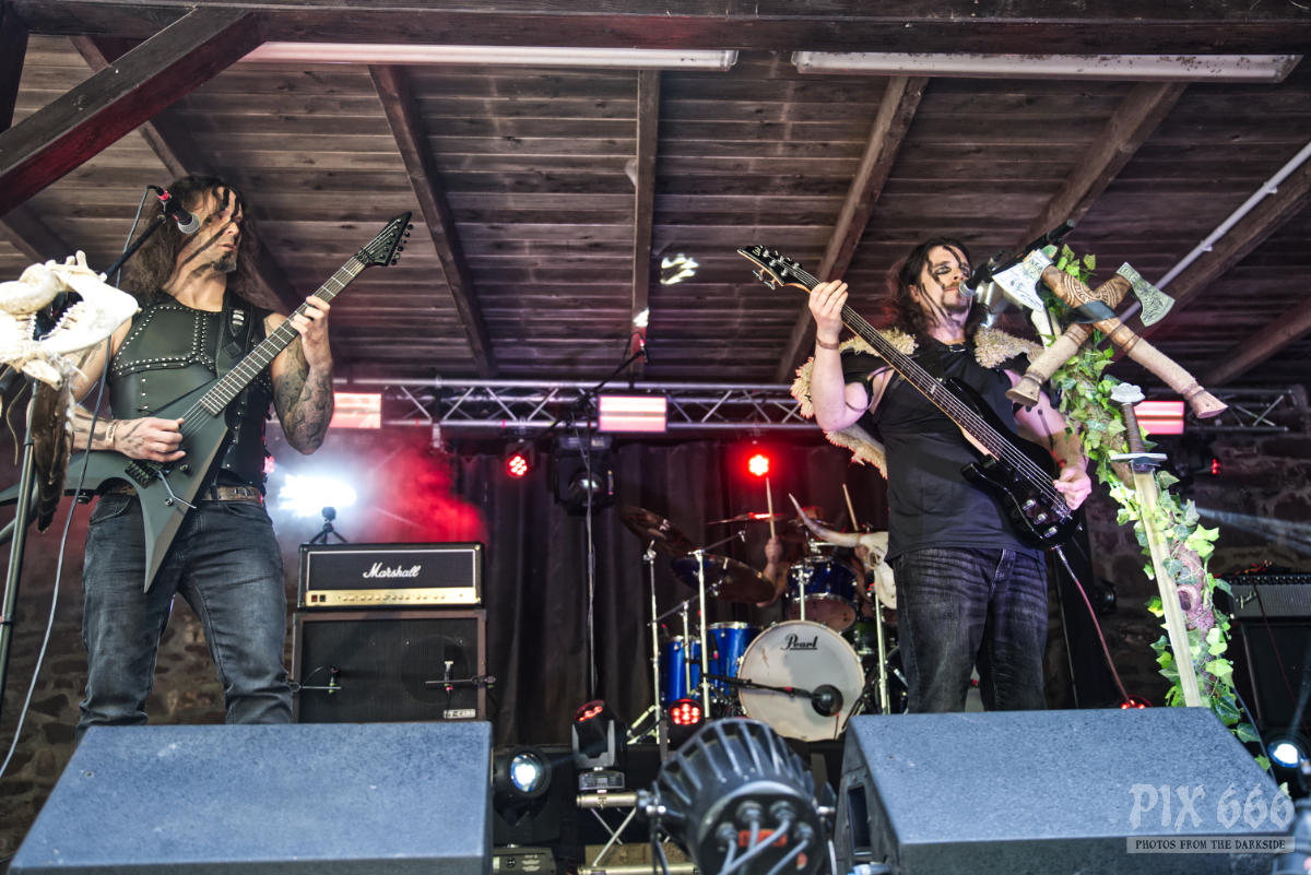 Der Veranstalter des Dark Troll Festivals hat die bayrische Band KromleK aus dem Tiefschlaf geweckt. Die eigentlich schon getrennte Band raffte sich nach endlos langen zwölf Jahren auf, und spielte ihre einzige Open Air Show 2023 auf der Schweinsburg Bornstedt. Die Musiker zeigten dann, wie man mit Kapuzen auf dem Kopf headbangen kann – vor der Bühne ging das natürlich ohne Kopfbedeckung und die langen Haare der Fans kreisten unentwegt. Im Publikum herrschte total coole Stimmung, für die sich die Band herzlich bedankte. Unter den Pagan Metal mischten sich auch ein paar Mittelalterliche Klänge – die Band nahm die Fans auf eine abwechslungsreiche Reise quer durch die drei Alben, die die Band während ihres Bestehens veröffentlicht hat. Ein toller Auftritt.