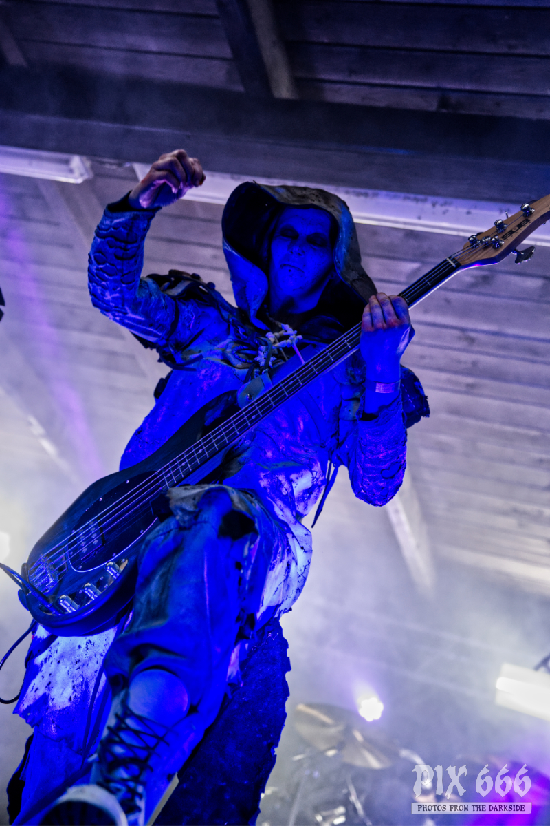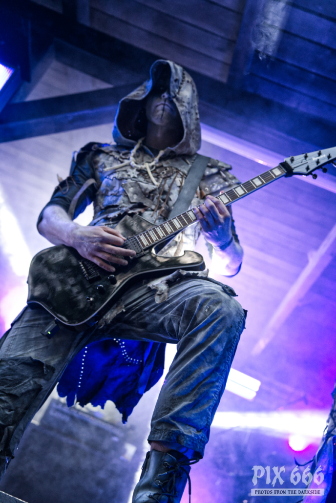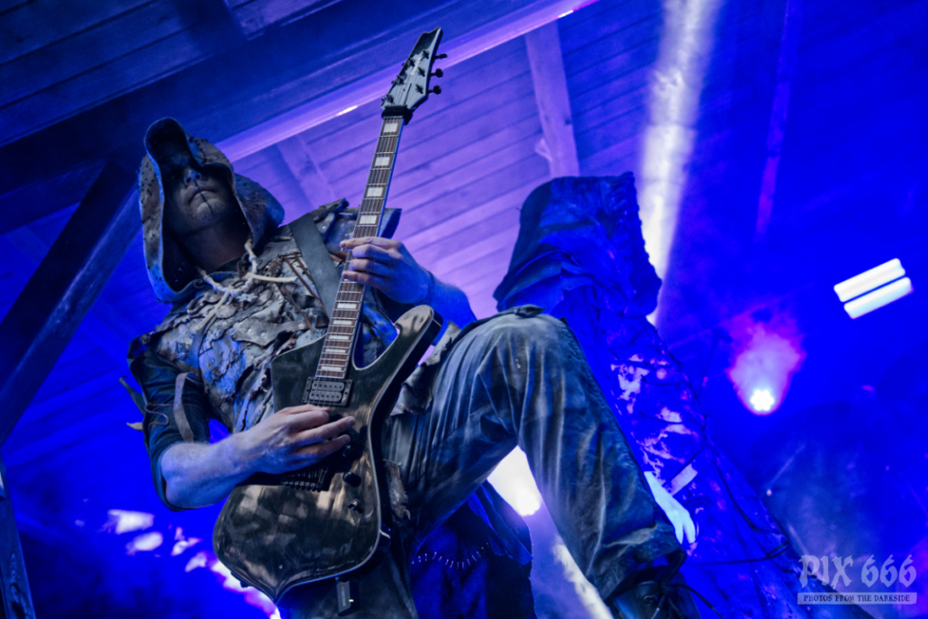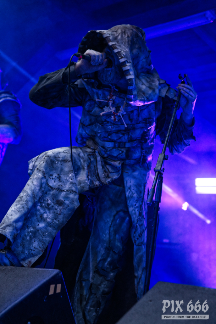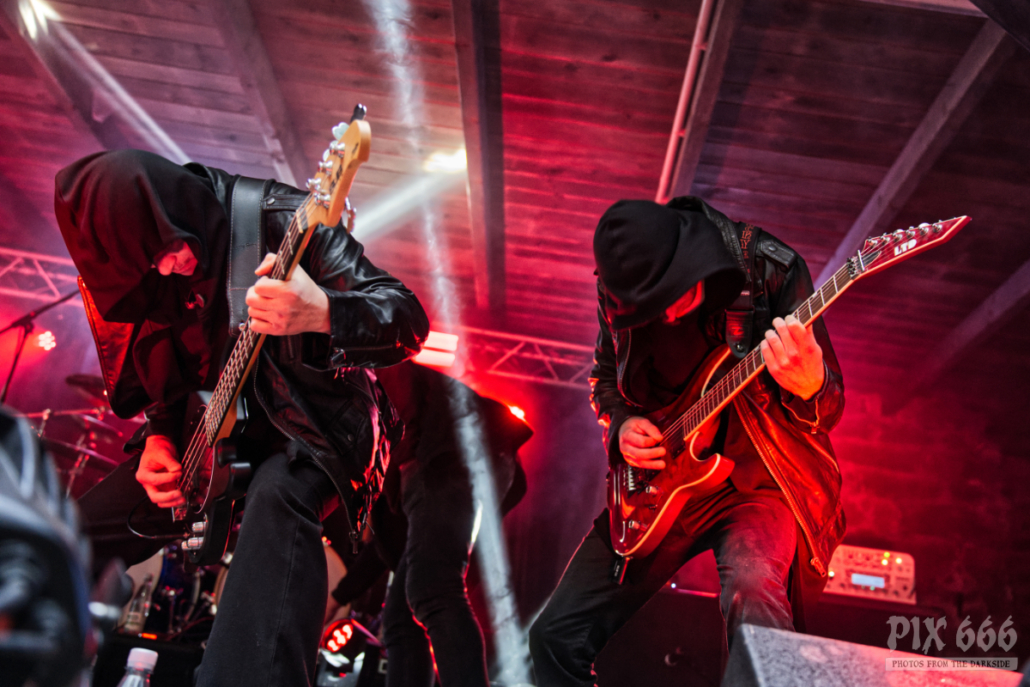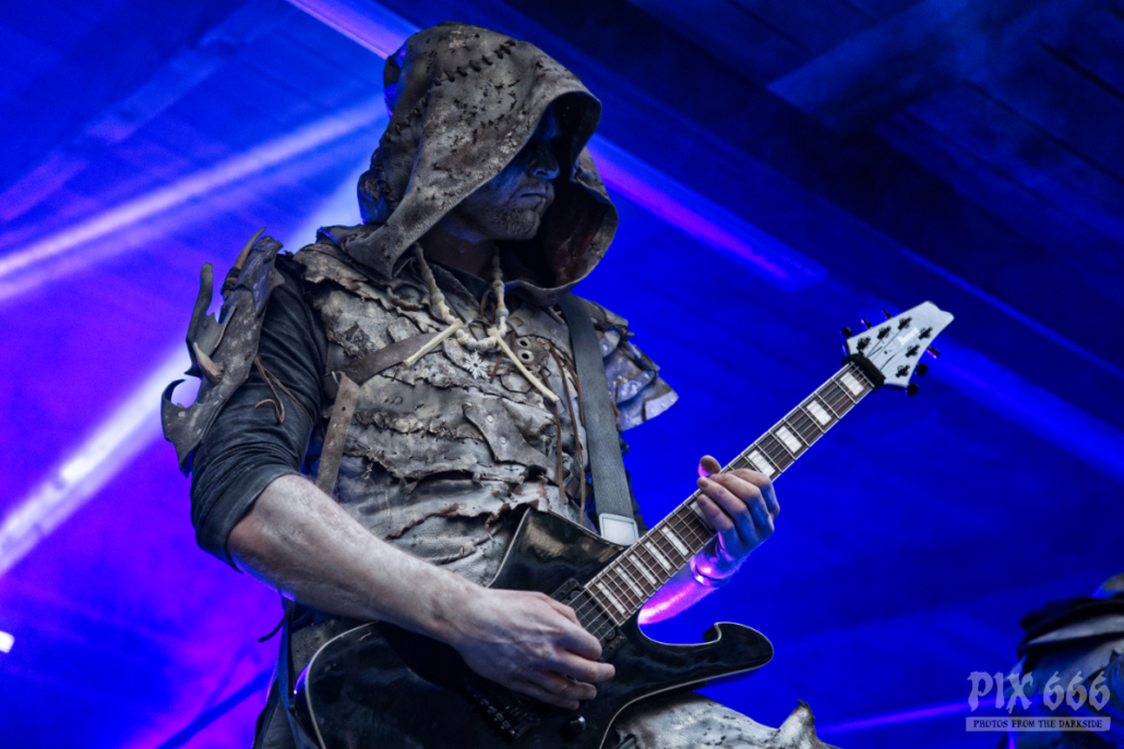 Nun war es bereits Abend geworden am ersten Festivaltag des Dark Troll 2023. Die nächste Band betrat in grau weißen Anzügen die Bühne, die großen Kapuzen hingen tief ins Gesicht. Es schien, als würden die Schweden gerade einen langen Marsch durch einen Schneesturm hinter sich haben. Während des Auftritts von Istapp verschwand die Sonne hinter dem Burgturm und das finstere, blaue Bühnenlicht sorgte für eine ganz besondere Stimmung. Dunkelheit und Kälte sind auch die Hauptthemen, mit denen sich die 2005 gegründete Black Metal Band beschäftigt. Die Fans tobten jetzt, das war ein richtig starker Auftritt.