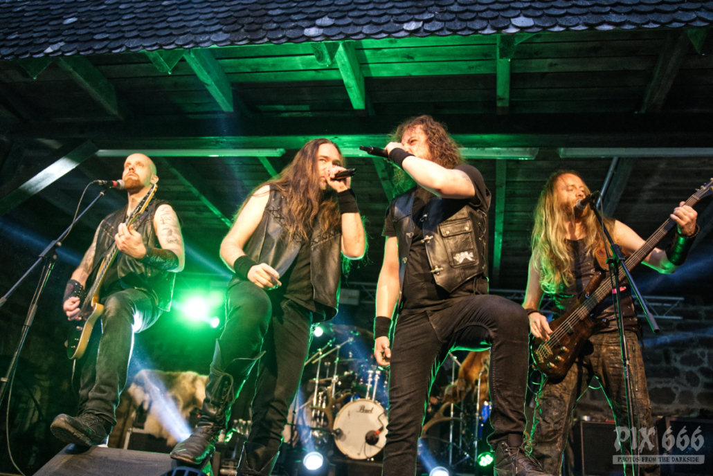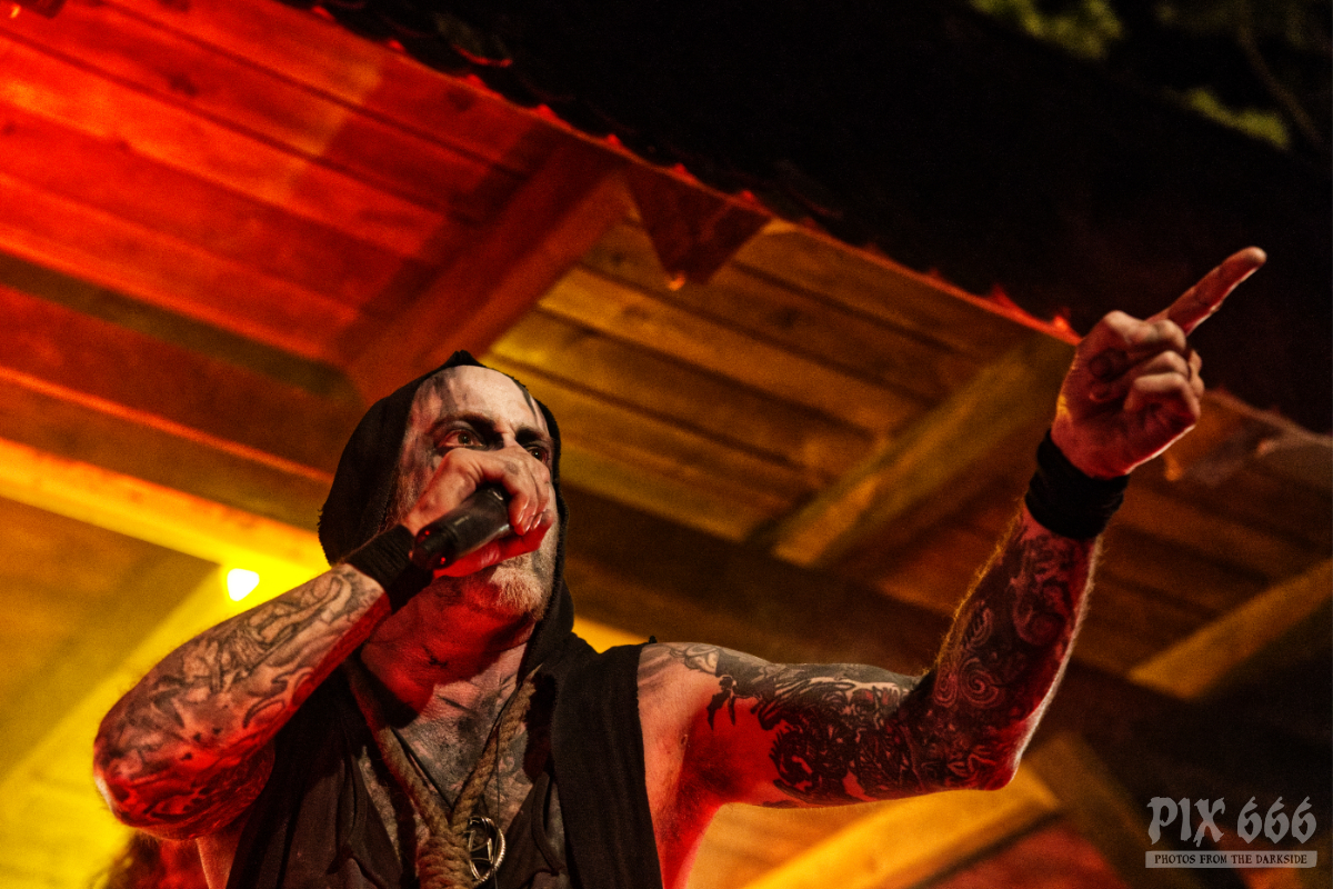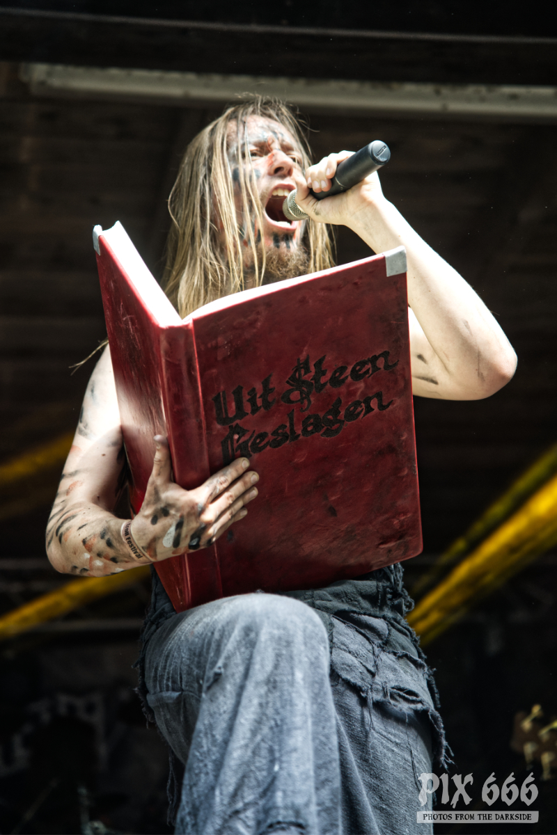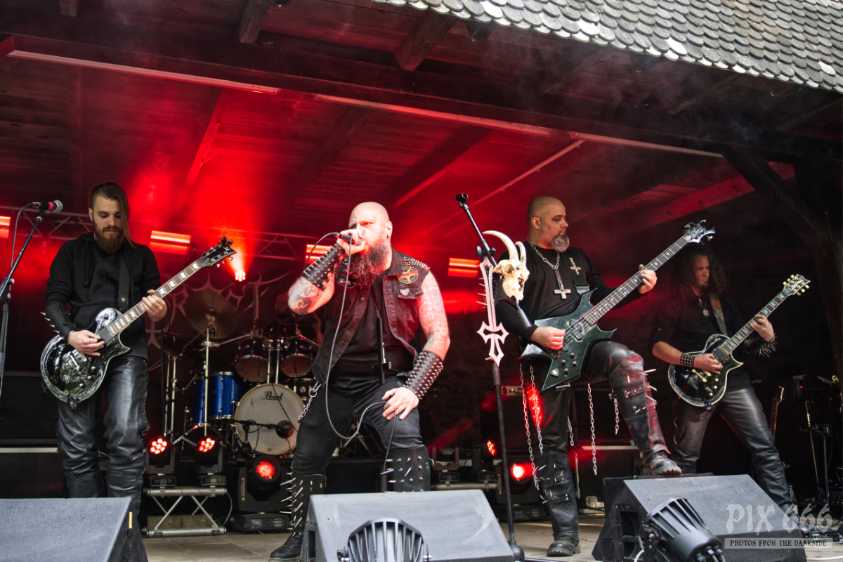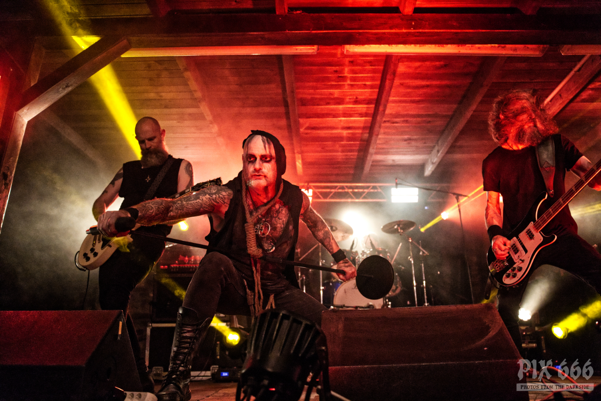Die Liste der Bands, denen Joris van Gelre seine Stimme leiht, ist ziemlich lang. Heute steht er mit Bezwering auf der Dark Troll Bühne, die 2018 unter dem Namen Wederganger ihr Abschiedskonzert auf dem Festival an der Schweinsburg gespielt hatten. Es war nach wie vor richtig gut gefüllt vor der Bühne, die Fans hatten Lust auf die Songs vom neuen Album ‚Dodenkroning‘. Die Band hatte einen Rinderschädel und reichlich Kerzen und Räucherstäbchen als Dekoration mitgebracht. Einige der Musiker hatten schwarz angemalte Gesichter. Bei der energiegeladenen Show wurde dann sogar der Mikrofonständer geschrottet und ließ sich nicht mehr aufstellen. Blaues, düsteres Licht sorgte für den passenden Rahmen für diese tolle Black-Metal Horrorshow.