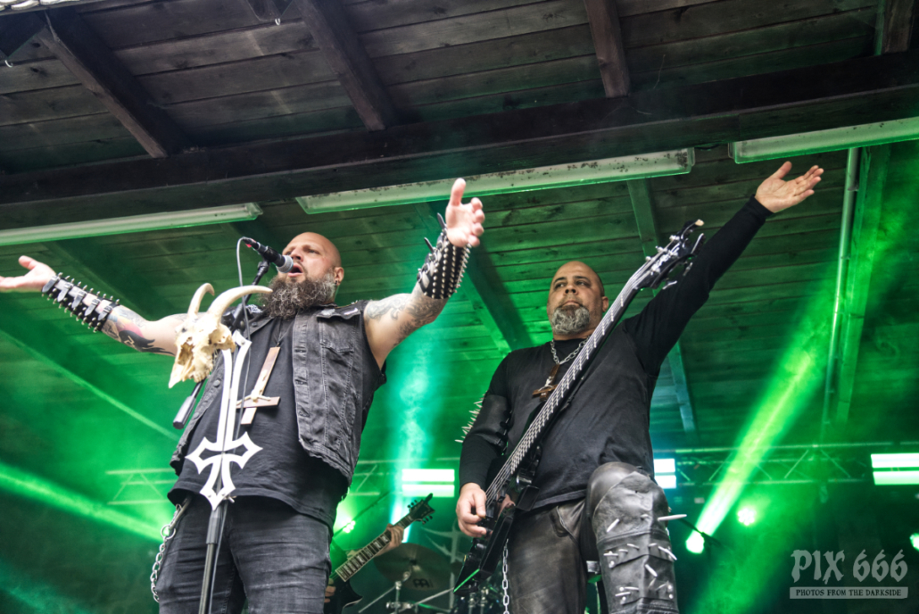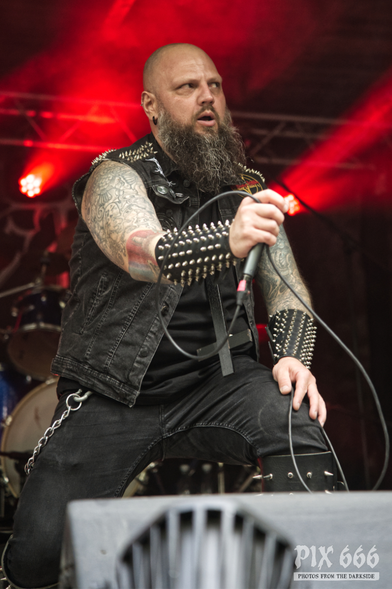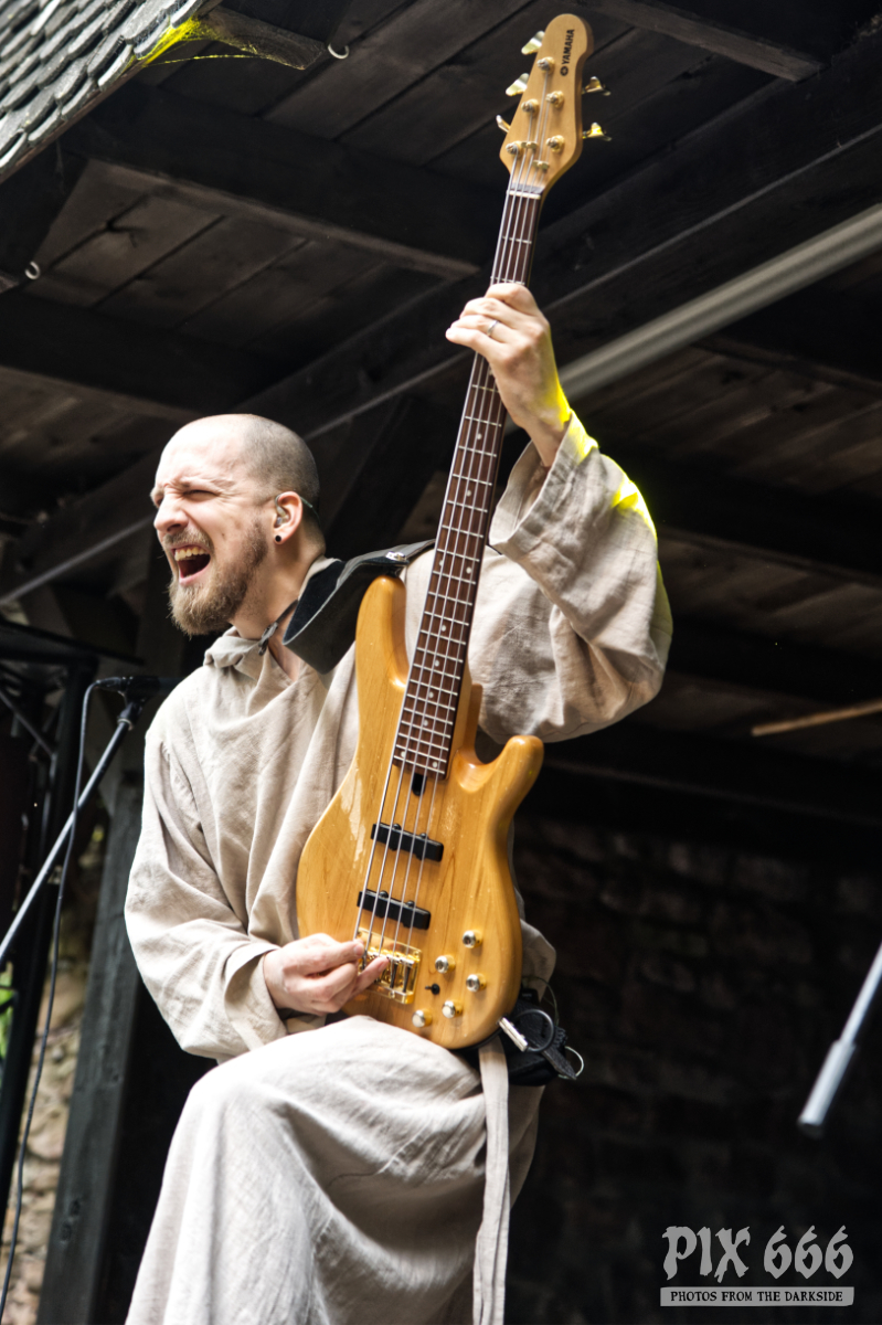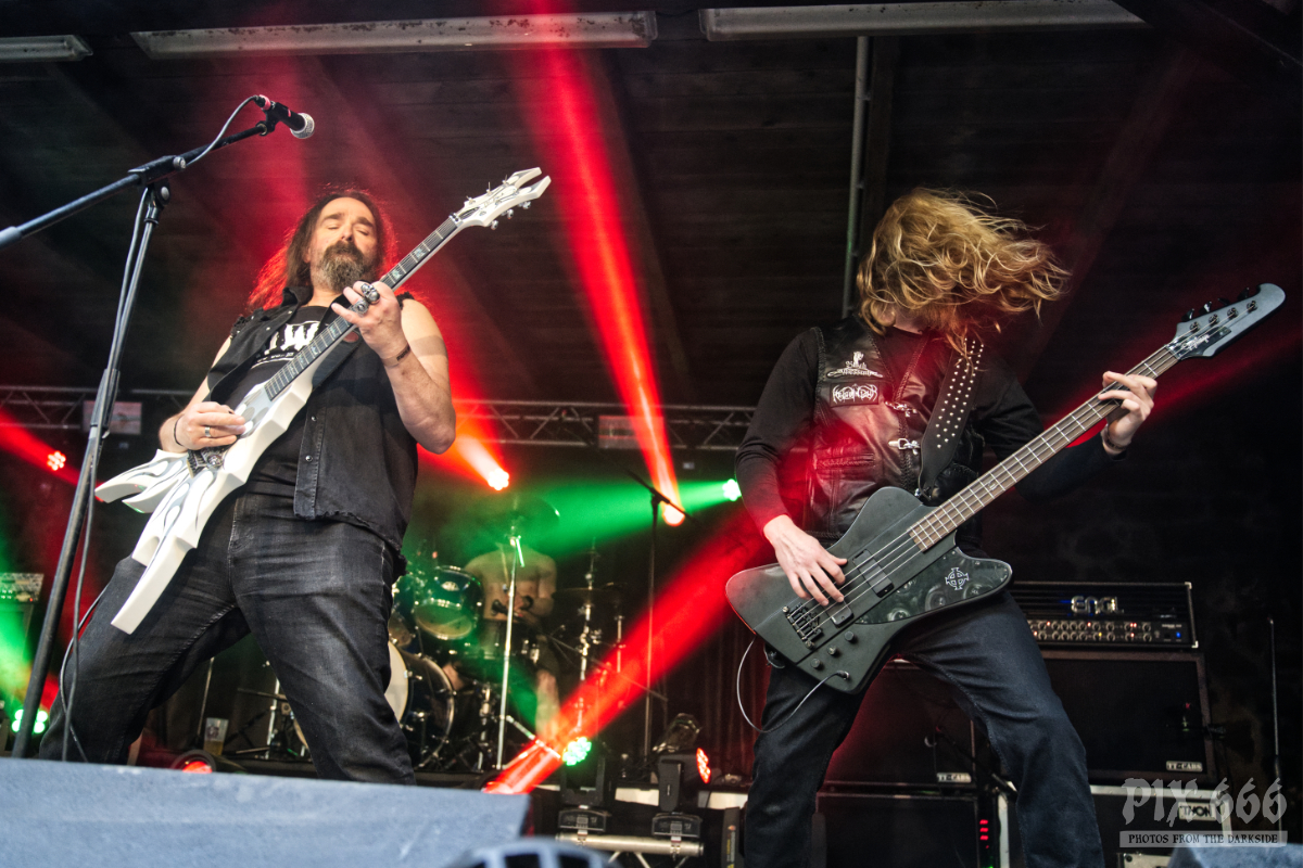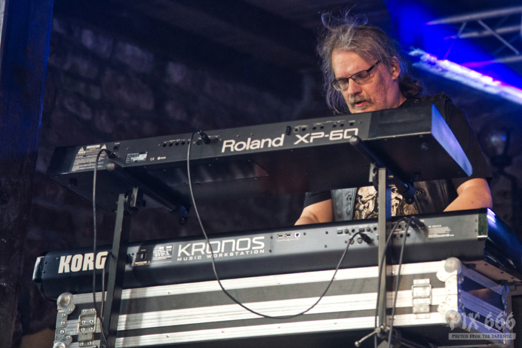 Die Liste der Bands, denen Joris van Gelre seine Stimme leiht, ist ziemlich lang. Heute steht er mit Bezwering auf der Dark Troll Bühne, die 2018 unter dem Namen Wederganger ihr Abschiedskonzert auf dem Festival an der Schweinsburg gespielt hatten. Es war nach wie vor richtig gut gefüllt vor der Bühne, die Fans hatten Lust auf die Songs vom neuen Album ‚Dodenkroning‘. Die Band hatte einen Rinderschädel und reichlich Kerzen und Räucherstäbchen als Dekoration mitgebracht. Einige der Musiker hatten schwarz angemalte Gesichter. Bei der energiegeladenen Show wurde dann sogar der Mikrofonständer geschrottet und ließ sich nicht mehr aufstellen. Blaues, düsteres Licht sorgte für den passenden Rahmen für diese tolle Black-Metal Horrorshow.
