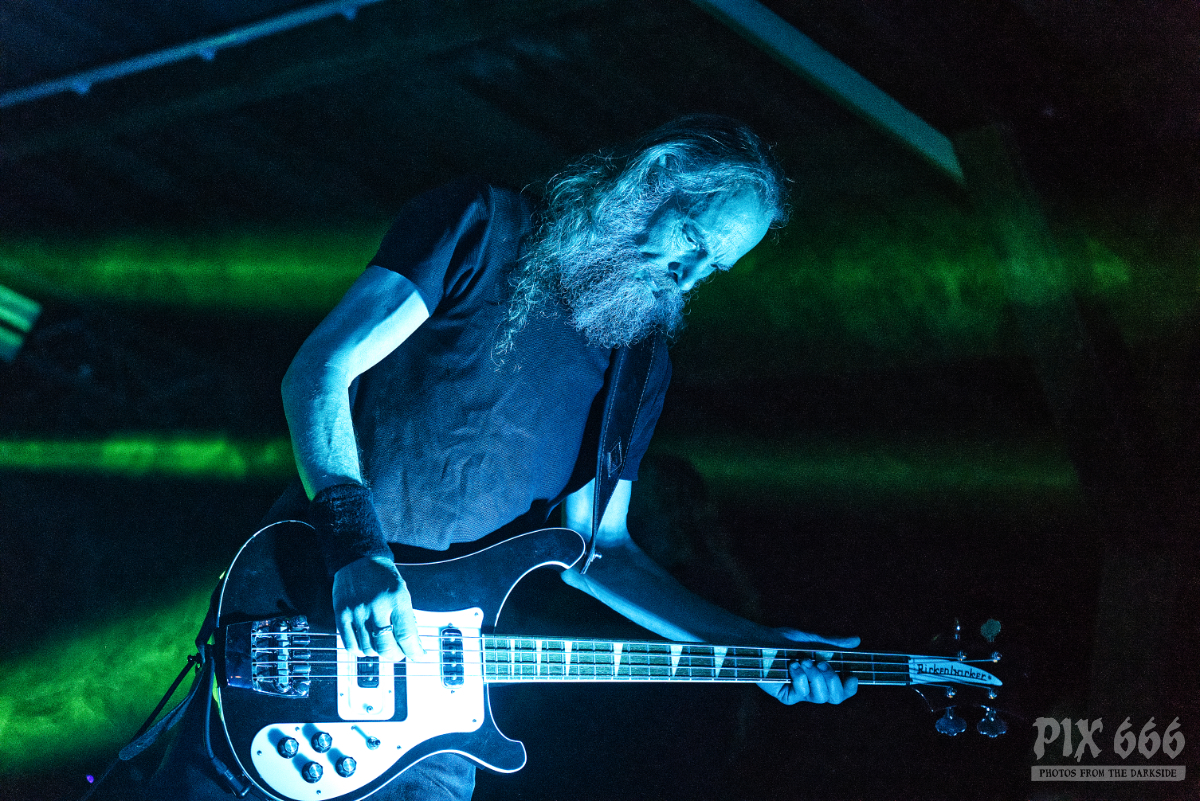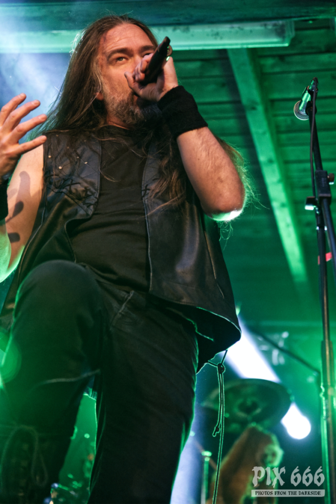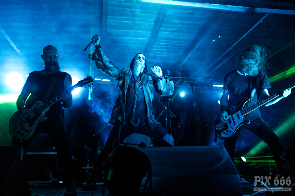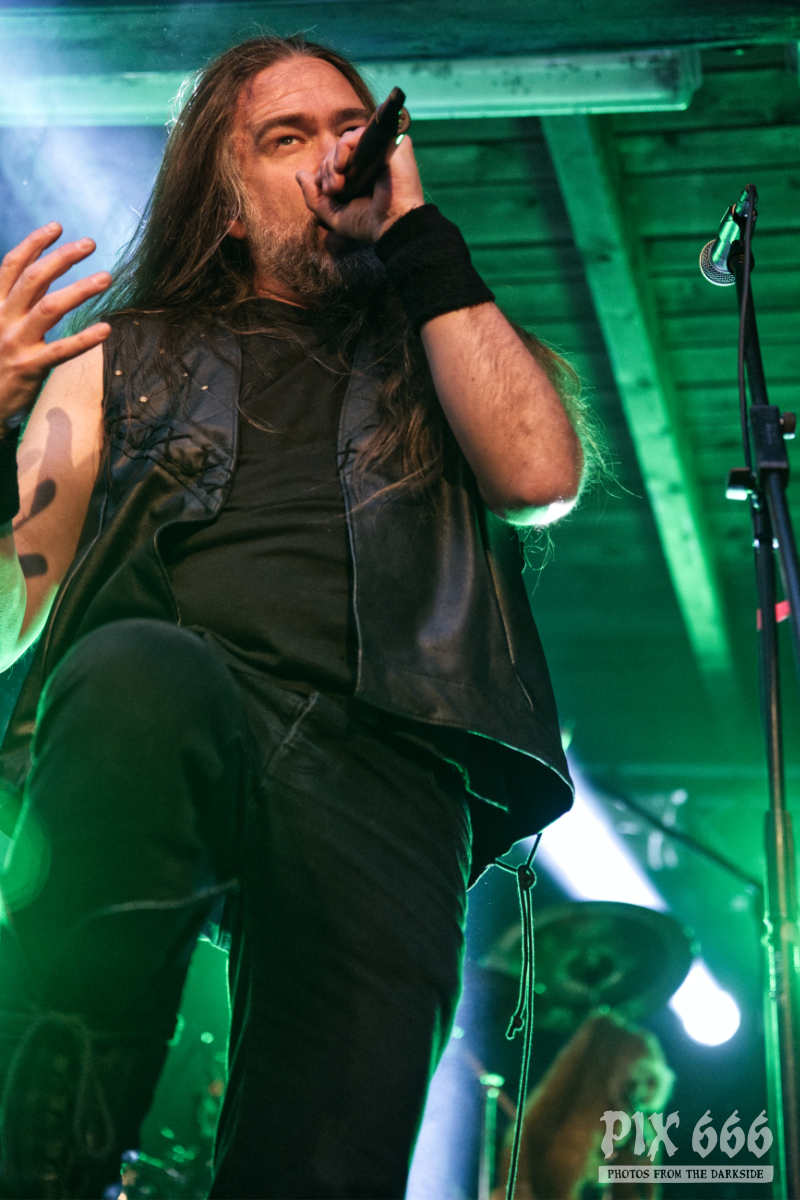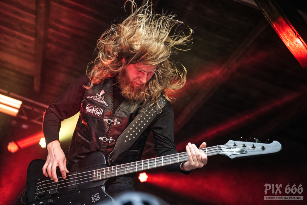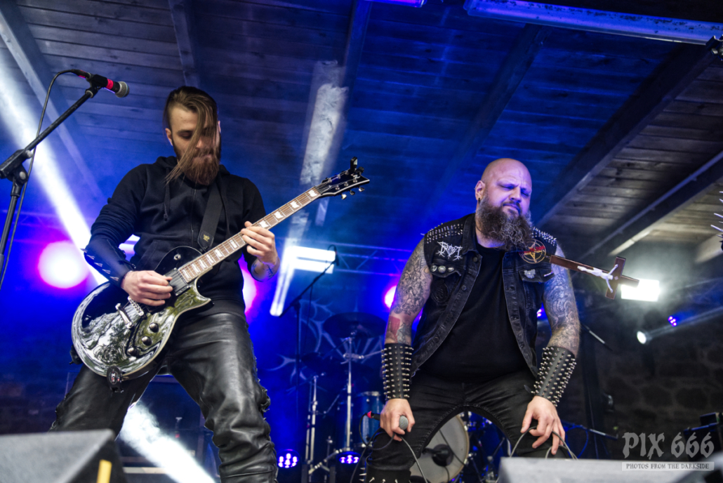 Die Liste der Bands, denen Joris van Gelre seine Stimme leiht, ist ziemlich lang. Heute steht er mit Bezwering auf der Dark Troll Bühne, die 2018 unter dem Namen Wederganger ihr Abschiedskonzert auf dem Festival an der Schweinsburg gespielt hatten. Es war nach wie vor richtig gut gefüllt vor der Bühne, die Fans hatten Lust auf die Songs vom neuen Album ‚Dodenkroning‘. Die Band hatte einen Rinderschädel und reichlich Kerzen und Räucherstäbchen als Dekoration mitgebracht. Einige der Musiker hatten schwarz angemalte Gesichter. Bei der energiegeladenen Show wurde dann sogar der Mikrofonständer geschrottet und ließ sich nicht mehr aufstellen. Blaues, düsteres Licht sorgte für den passenden Rahmen für diese tolle Black-Metal Horrorshow.