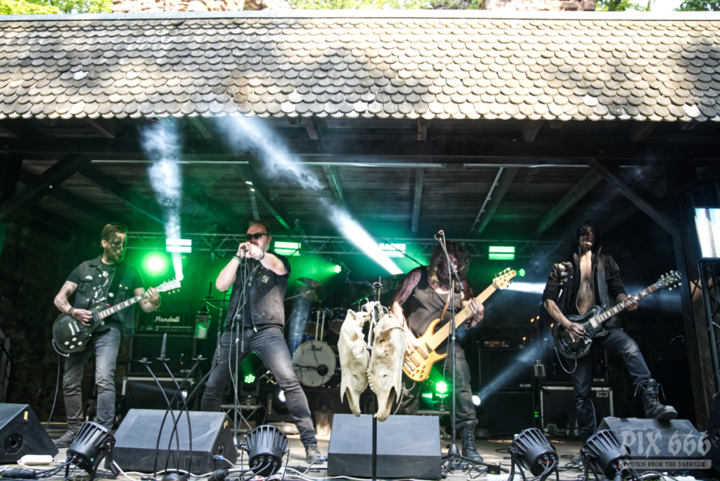 So langsam ging es nun schon auf die Zielgerade des Dark Troll Festival 2023. Die nächste Band ist nunmehr schon seit mehr als 30 Jahren aktiv und war bereits 2016 zu Gast an der Burgruine Bornstedt. Sänger Zagan erzählte, dass er während der Corona-Pandemie etwas zugenommen hatte und auch zu faul war, neue Songs zu schreiben. „Man will ja nicht immer dasselbe spielen, deshalb gibt es heute mal ein paar ganz alte Songs“. Black Messiah spielten also ein gut gemischtes Set aus alt und neu. Mit dabei war natürlich auch wieder das allseits bekannte und beliebte ‚Sauflied‘. Das Festivalgelände war nun voll bis zu den Burgmauern, die Fans feierten mit der Band eine Stunde lang, als gäbe es kein Morgen. Es wurde pausenlos mit dem Kopf gekreist oder gesprungen – da hat mit Sicherheit der ein oder andere ein paar Pfunde verloren. Das war wieder eine der unvergesslichen Shows, die uns die Band nun schon seit mehreren Jahrzehnten immer wieder bietet.