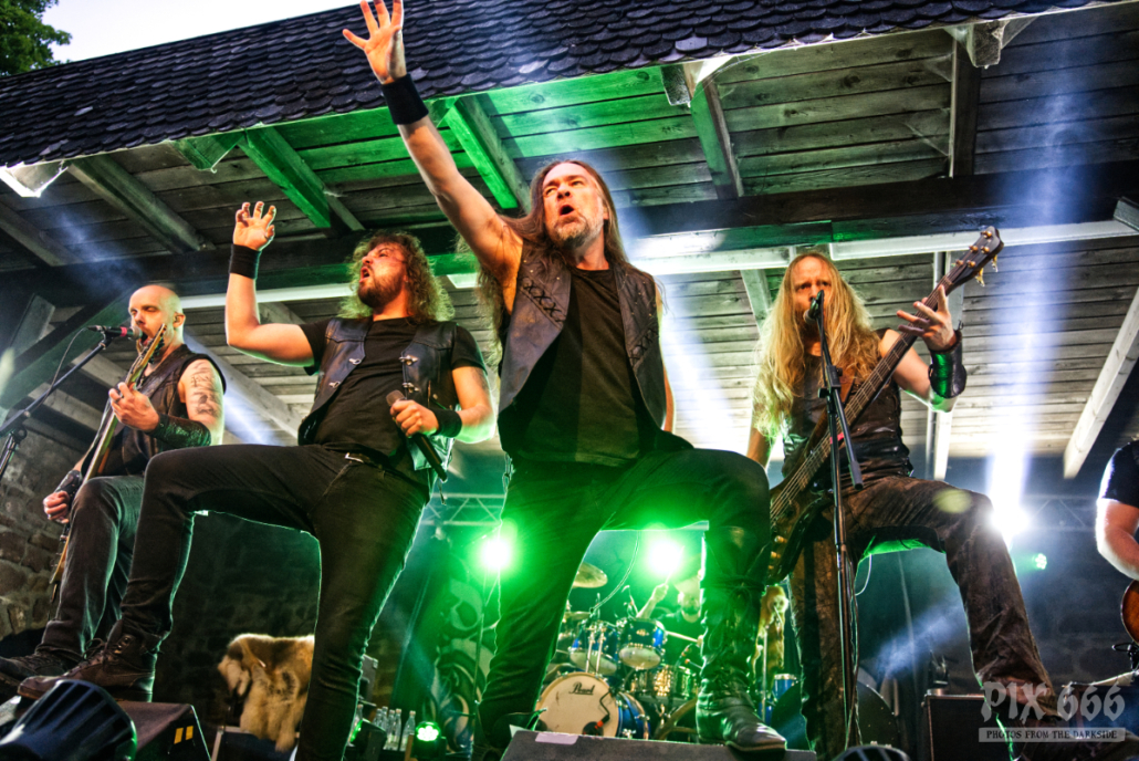 Heidevolk haben im Februar 2023 ihr neues Album ‚Wederkeer‘ veröffentlicht und die Fans in Bornstedt konnten sich auf einige der brandneuen Stücke, sowie auf die altbewährten Hits freuen. Die beiden Sänger Jacco und Daniel sorgten für jede Menge Wirbel auf der Bühne. Die Atmosphäre in der tollen Location war nun bei einsetzender Dunkelheit einfach nur gigantisch, die Stimmung überwältigend. „Wir haben einen weiteren Klassiker für euch – lasst uns durchdrehen.“ ‚Durchdrehen‘ beschreibt ganz gut, was sich am Fuße der Burg jetzt hier abspielte. „Habt ihr Spaß wollt ihr feiern? – Ich brauche eure Stimmen – ‚Drink met de Goden‘“. Nun wurde auch noch zusammen gesungen. Am Ende der wundervollen, mitreißenden Show bedankten sich Heidevolk noch herzlich bei den Organisatoren und bezeichneten das Dark Troll Festival als „eines der besten Festivals“.