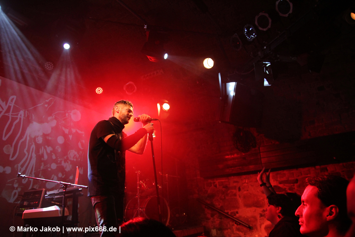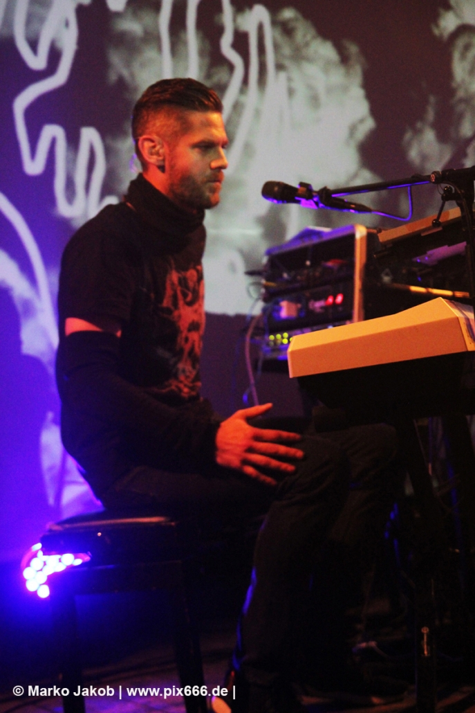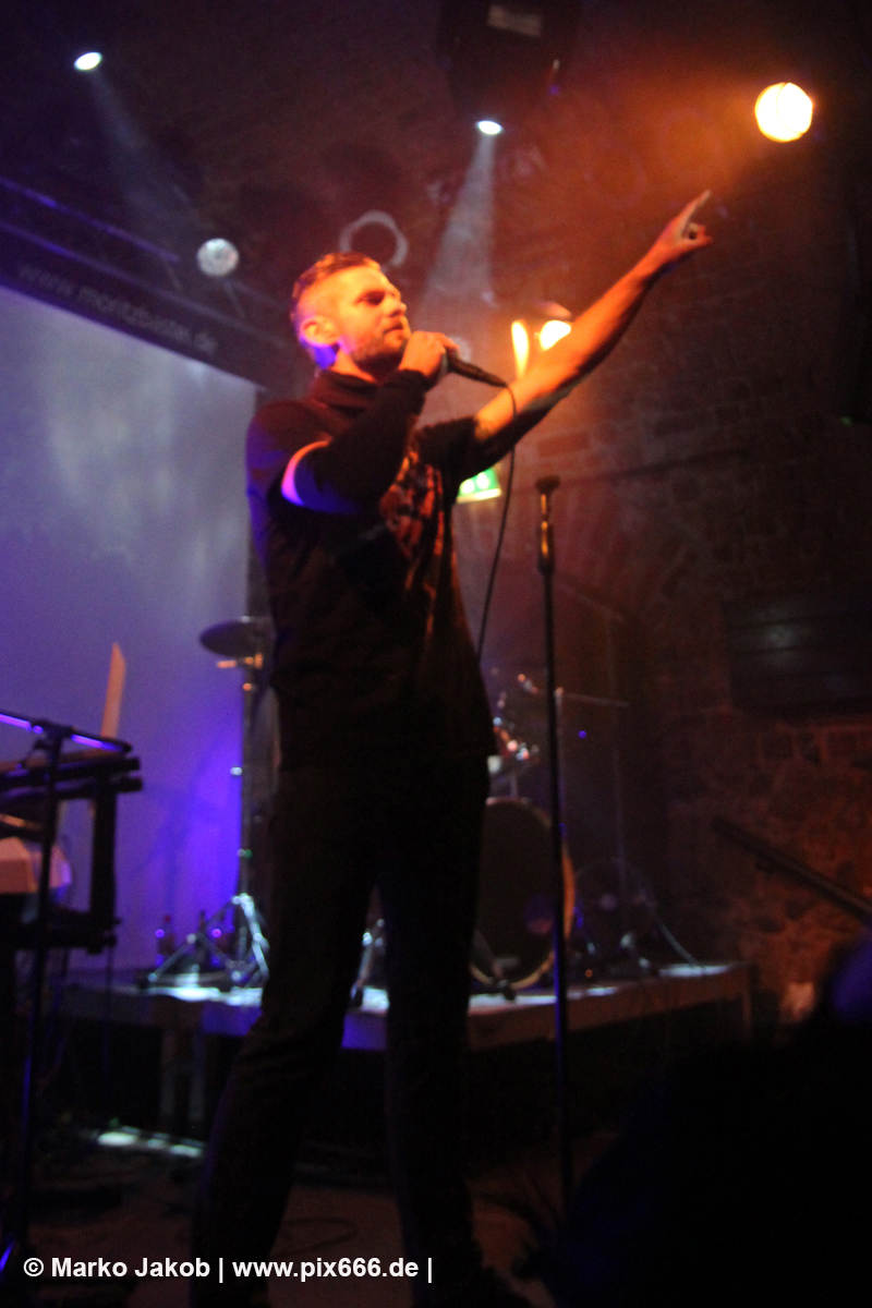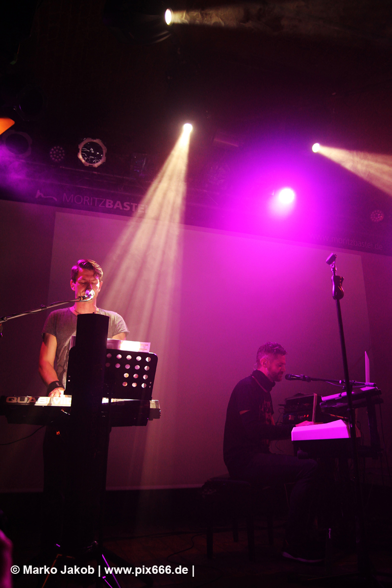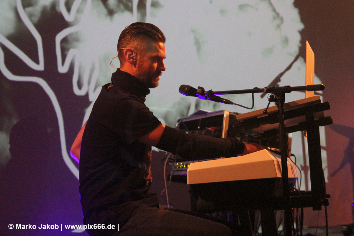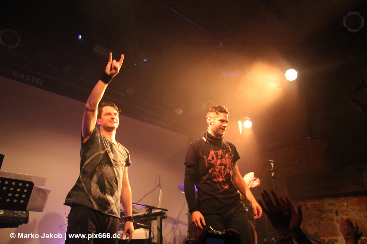 Torben erzählte dann, dass sich die Band vor Konzerten öfter mal zusammensetzt, und überlegt, welche Songs, die man selten oder gar nicht live gespielt hat, mit in das Set genommen werden könnten. Diesmal erhielten sie bei der Auswahl Hilfe von Vasi Vallis von Frozen Plasma, der sagte, ‚The Convenient Of Being Absent‘ ist euer bester Song. Thorben widmete den Song vom Album ‚The Art of Creating Confusing Spirits‘ aus dem Jahre 2002 seinem vor kurzem verstorbenen Hund. Das war ein wirklich trauriger Moment an diesem Konzertabend. Es ging mit einem weiteren ruhigen Song weiter – ‚Summit‘ aus dem Jahr 2013. Es folgten später mit ‚Exit The Grey‘ und ‚Synthesize Me‘ wieder schnellere Stücke und man hatte das Gefühl, es finde schon die Aftershow Disco statt. Die Fans in der prall gefüllten Moritzbastei tanzten fast alle pausenlos, soweit dies der Platz zugelassen hat. Nach dem Song ‚Off’ vom aktuellen Album war dann das reguläre Set vorbei. Der Jubel des Publikums war unbeschreiblich. Die Stimmung am Vortag in Nürnberg soll schon toll gewesen sein, aber Leipzig war nochmal eine Liga besser – das grenzte schon fast an den Bereich ‚mehr geht nicht‘.