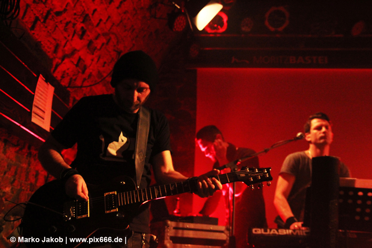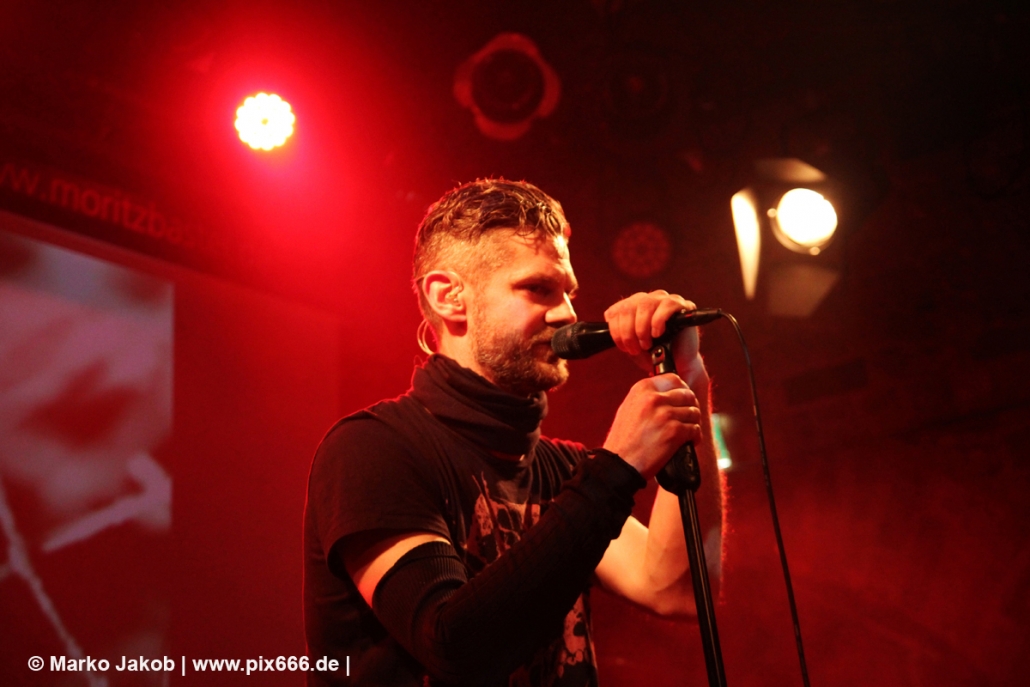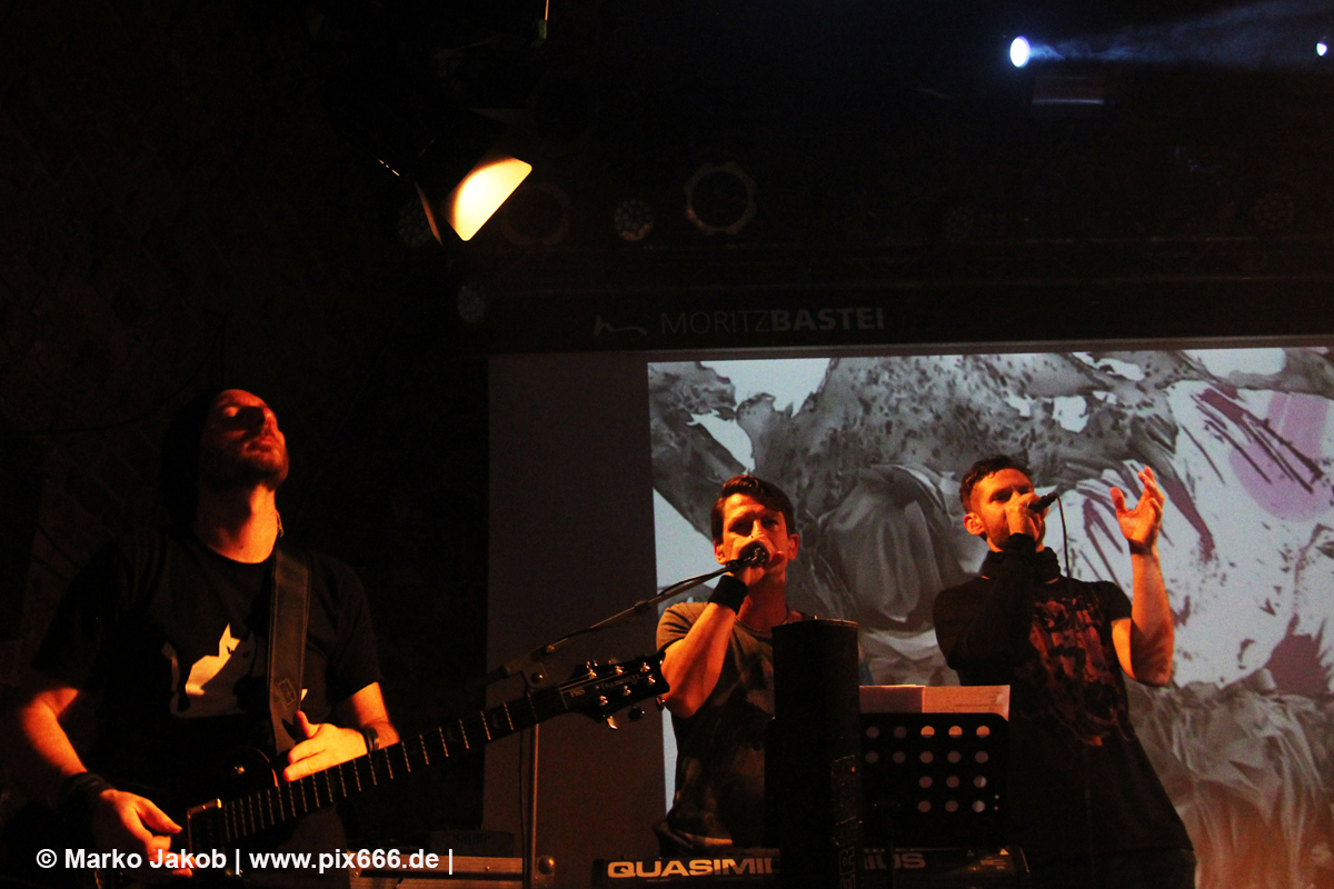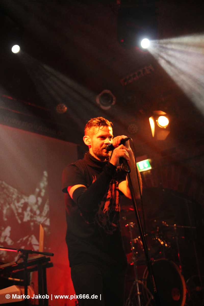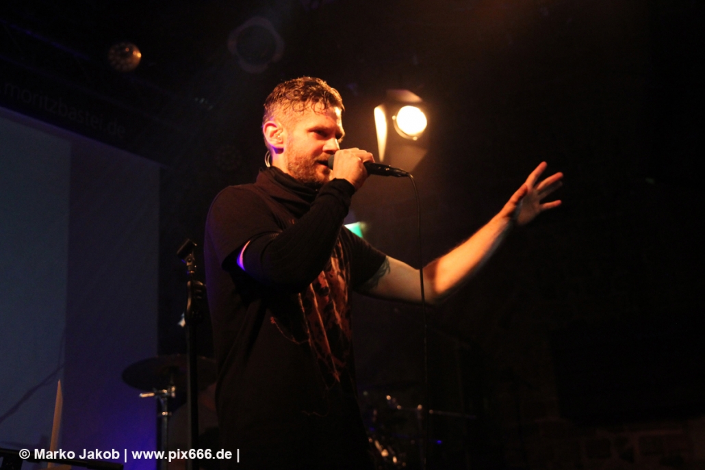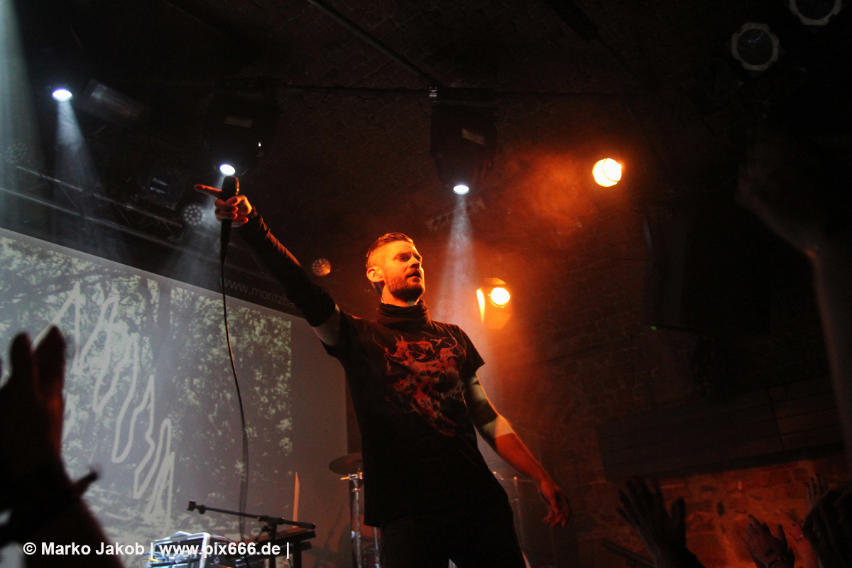 Torben erzählte dann, dass sich die Band vor Konzerten öfter mal zusammensetzt, und überlegt, welche Songs, die man selten oder gar nicht live gespielt hat, mit in das Set genommen werden könnten. Diesmal erhielten sie bei der Auswahl Hilfe von Vasi Vallis von Frozen Plasma, der sagte, ‚The Convenient Of Being Absent‘ ist euer bester Song. Thorben widmete den Song vom Album ‚The Art of Creating Confusing Spirits‘ aus dem Jahre 2002 seinem vor kurzem verstorbenen Hund. Das war ein wirklich trauriger Moment an diesem Konzertabend. Es ging mit einem weiteren ruhigen Song weiter – ‚Summit‘ aus dem Jahr 2013. Es folgten später mit ‚Exit The Grey‘ und ‚Synthesize Me‘ wieder schnellere Stücke und man hatte das Gefühl, es finde schon die Aftershow Disco statt. Die Fans in der prall gefüllten Moritzbastei tanzten fast alle pausenlos, soweit dies der Platz zugelassen hat. Nach dem Song ‚Off’ vom aktuellen Album war dann das reguläre Set vorbei. Der Jubel des Publikums war unbeschreiblich. Die Stimmung am Vortag in Nürnberg soll schon toll gewesen sein, aber Leipzig war nochmal eine Liga besser – das grenzte schon fast an den Bereich ‚mehr geht nicht‘.
