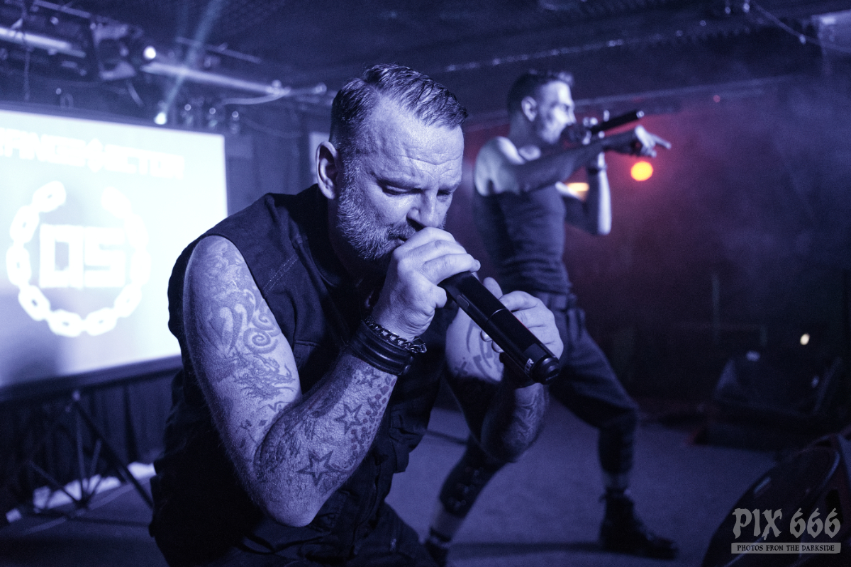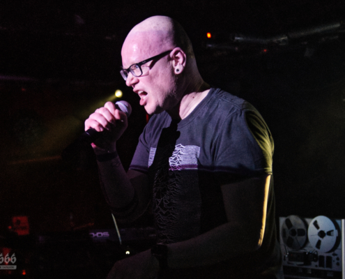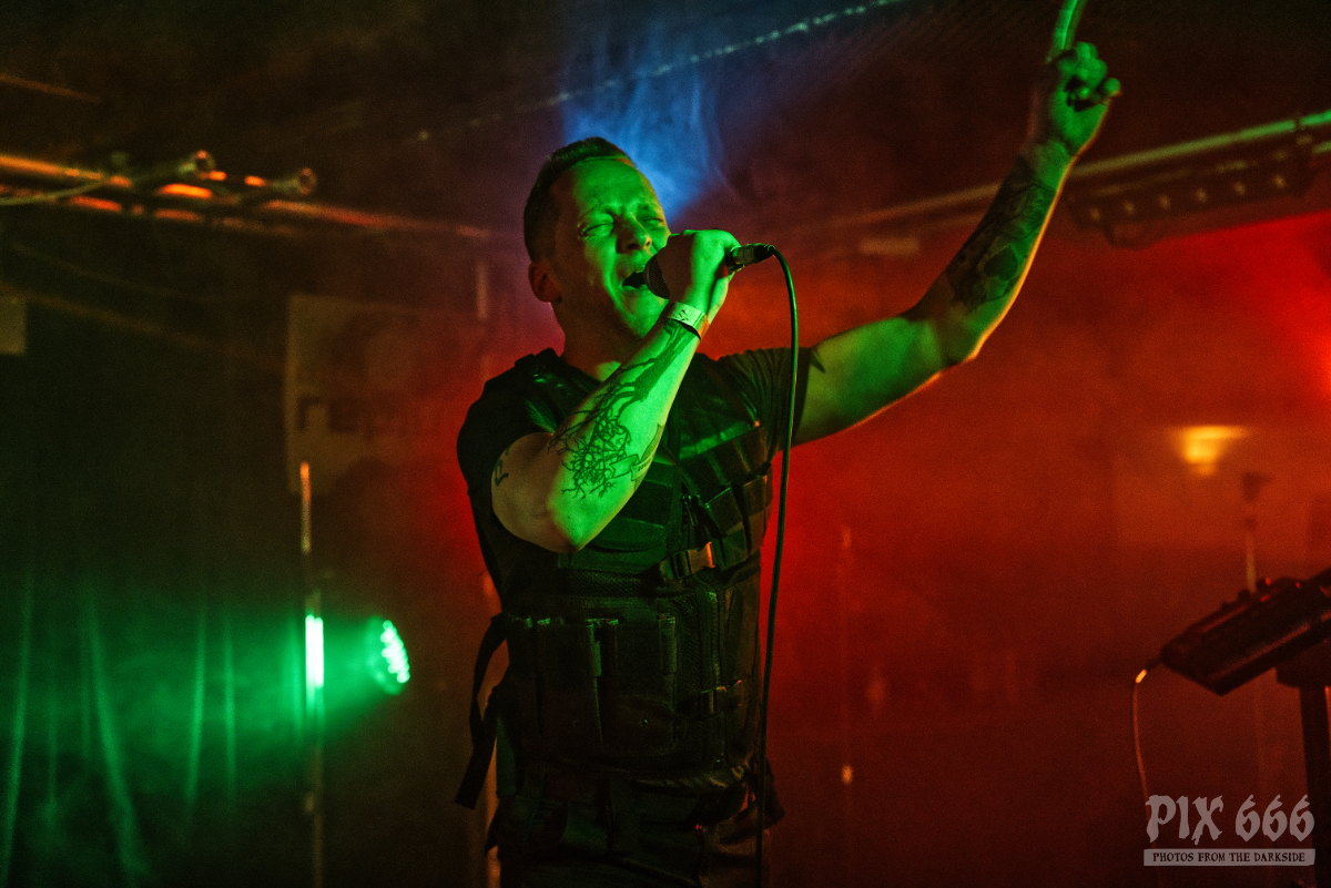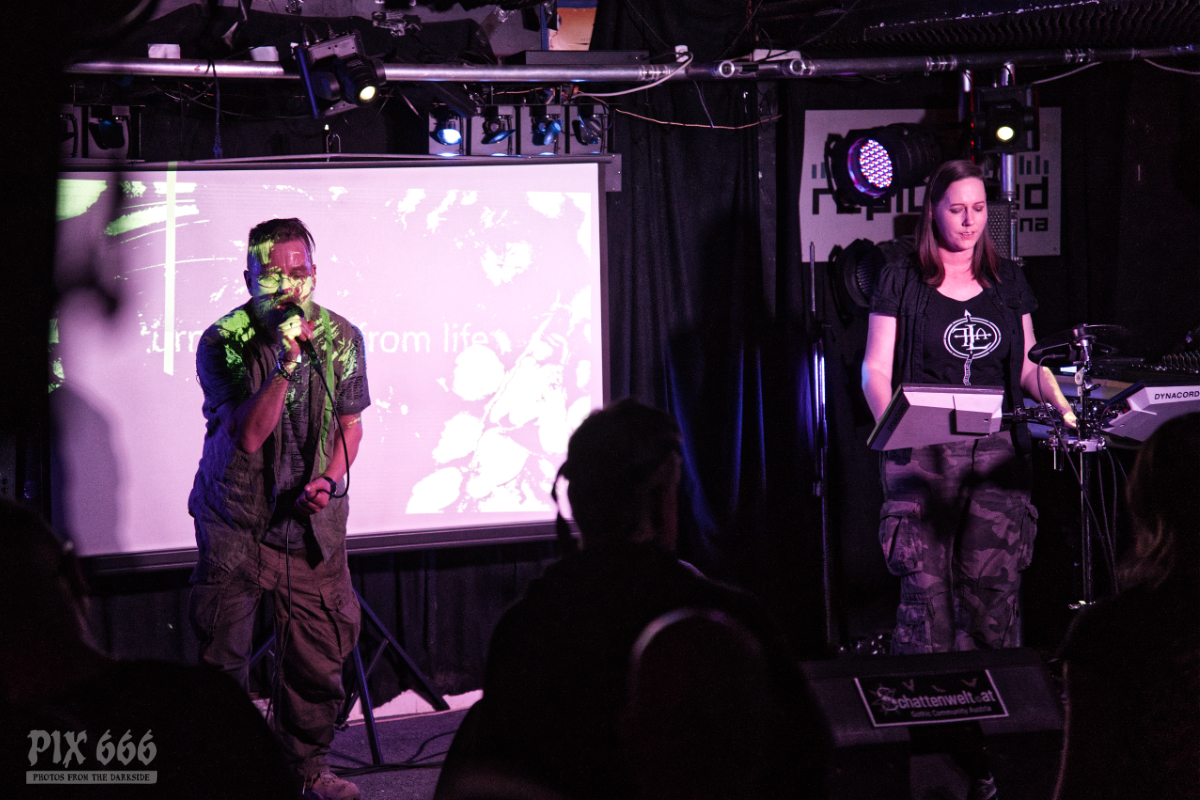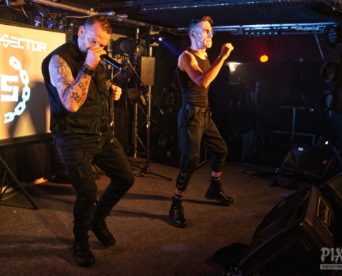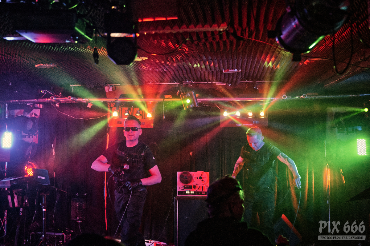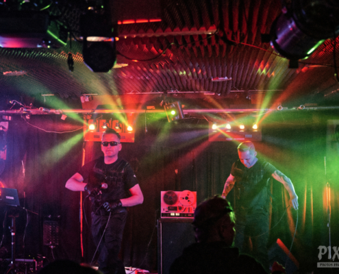 Der nächste Act kam ebenfalls aus Deutschland. Die Band g.o.l.e.m. wurde 2010 gegründet und hat inzwischen mehrere Singles und Alben veröffentlicht. Ihren Stil kann man als eine Mischung aus Electro-Industrial und EBM beschreiben. Brachiale Beats mit dem Electrodrum versetzte das Tanzvolk in Ekstase. Die Stimmung beim Duo aus München war von Beginn an fantastisch. Immer noch war es sehr dunkel im Replugged, aber das ist scheinbar die Standardbeleuchtung bei EBM Veranstaltungen. Beim Auftritt von g.o.l.e.m. blieb es nun nicht mehr nur beim Tanzen, der coole Beat verleitete die Fans inzwischen auch mal zum Springen. Die düsteren und atmosphärischen Klänge, gepaart mit verzerrten Vocals und treibenden Beats sorgten für perfekter Electro/EBM Feeling.