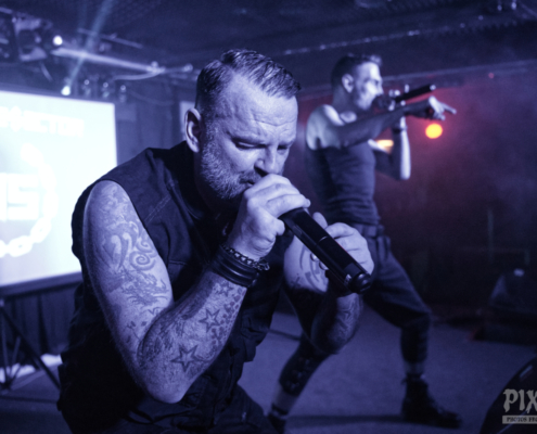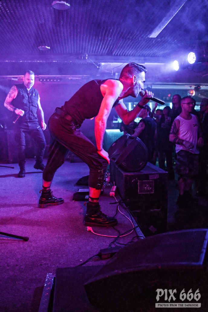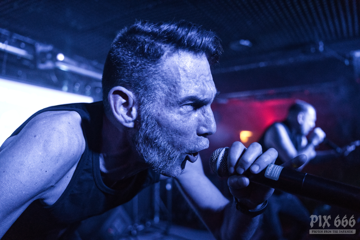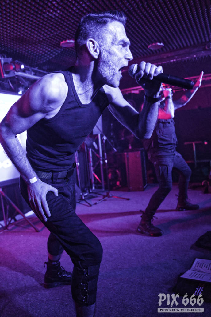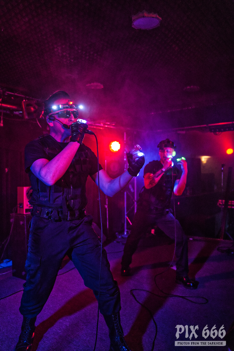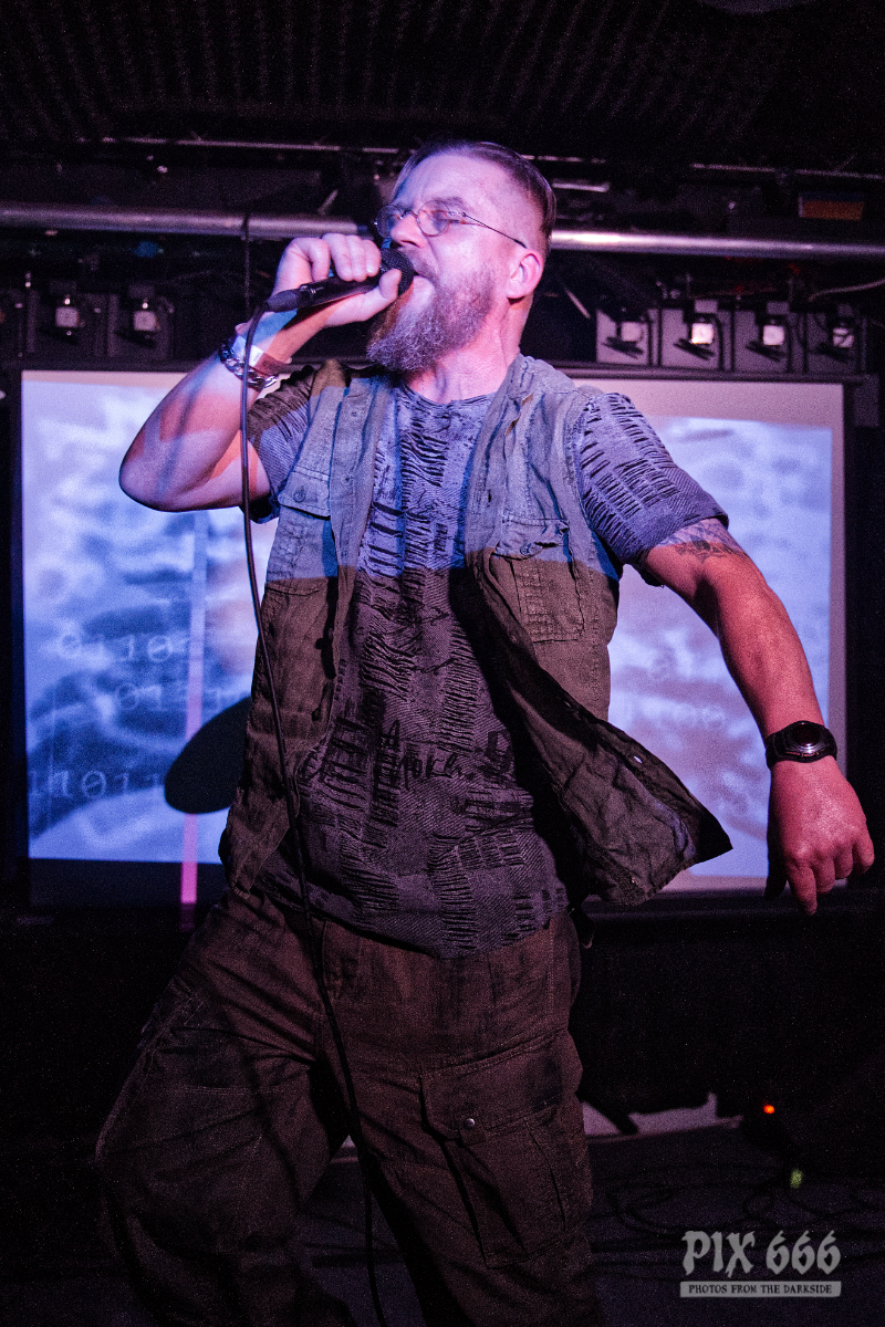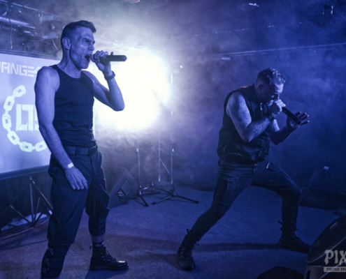 Der nächste Act kam ebenfalls aus Deutschland. Die Band g.o.l.e.m. wurde 2010 gegründet und hat inzwischen mehrere Singles und Alben veröffentlicht. Ihren Stil kann man als eine Mischung aus Electro-Industrial und EBM beschreiben. Brachiale Beats mit dem Electrodrum versetzte das Tanzvolk in Ekstase. Die Stimmung beim Duo aus München war von Beginn an fantastisch. Immer noch war es sehr dunkel im Replugged, aber das ist scheinbar die Standardbeleuchtung bei EBM Veranstaltungen. Beim Auftritt von g.o.l.e.m. blieb es nun nicht mehr nur beim Tanzen, der coole Beat verleitete die Fans inzwischen auch mal zum Springen. Die düsteren und atmosphärischen Klänge, gepaart mit verzerrten Vocals und treibenden Beats sorgten für perfekter Electro/EBM Feeling.